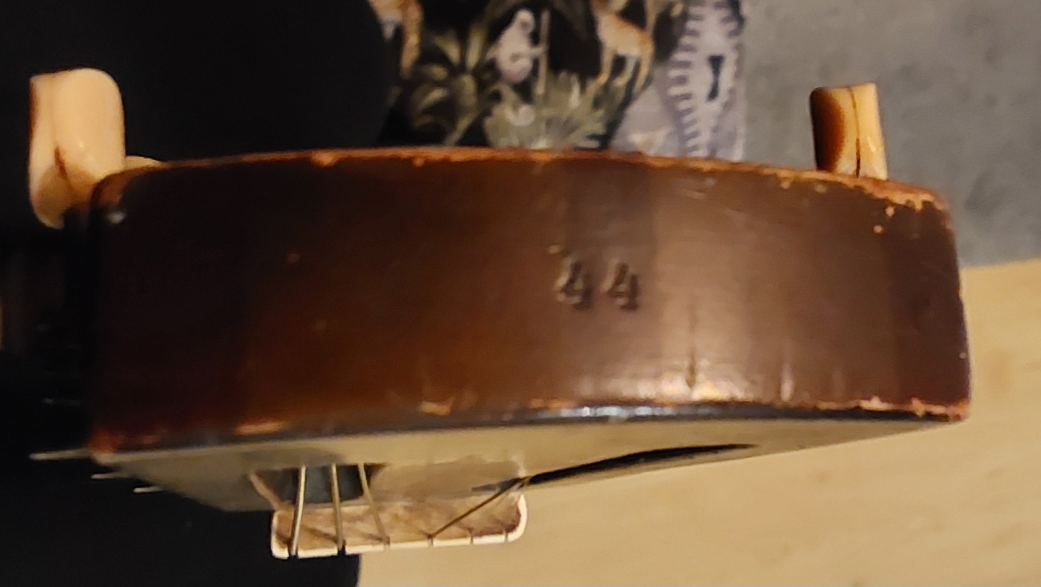 No reference to a luthier. "44" stamped into the top side of the headstock.