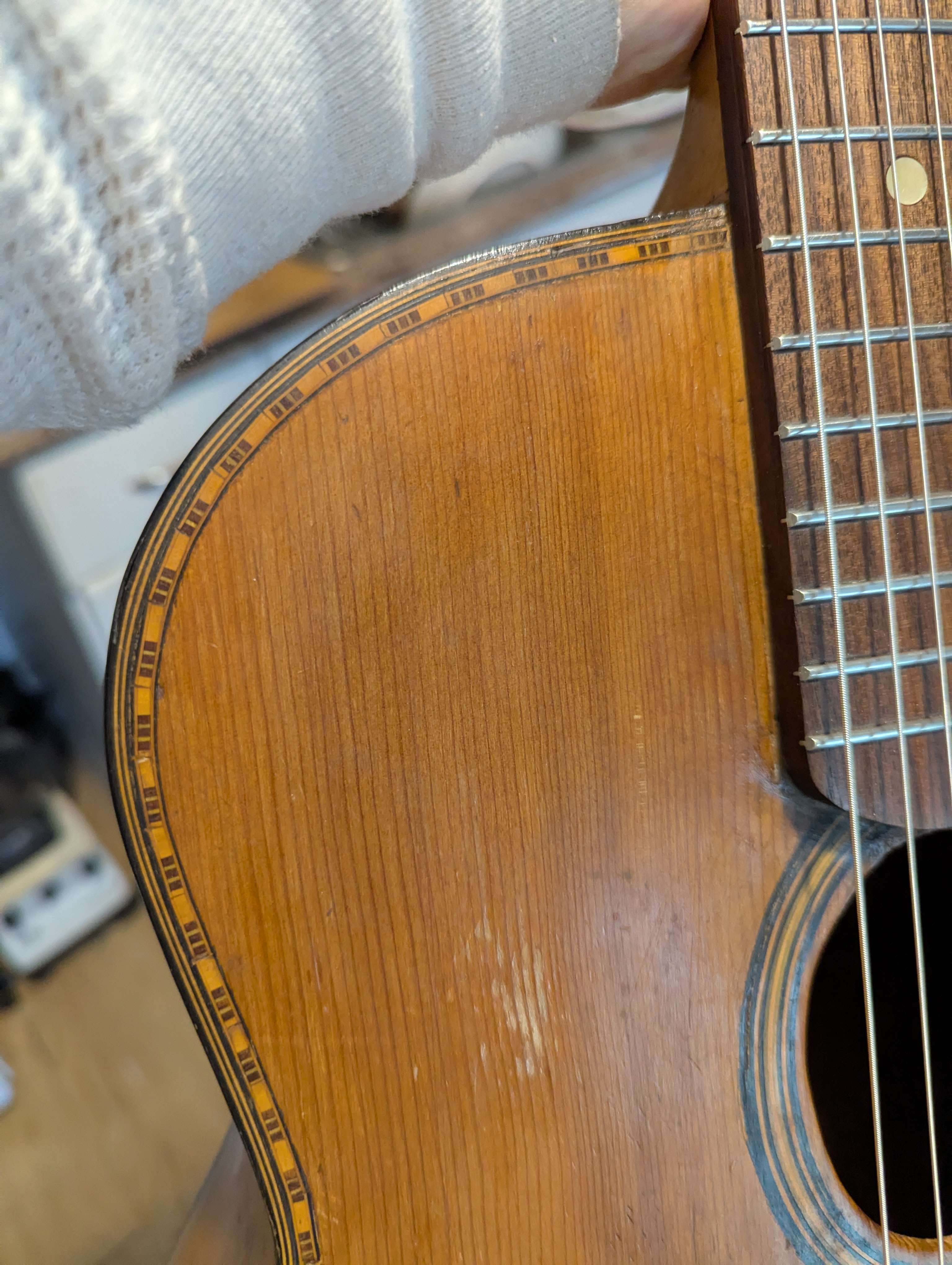 Unusual headstock for an old "jazzbox". No arched top nor back. Ladder bracing. There must have been a pickup: screw holes at the sides of the fretboard - not floating, but glued to the top just like with manouche guitars. No signs for a pickguard. The two marks by the right cat's eye seem to show the position of control knobs.