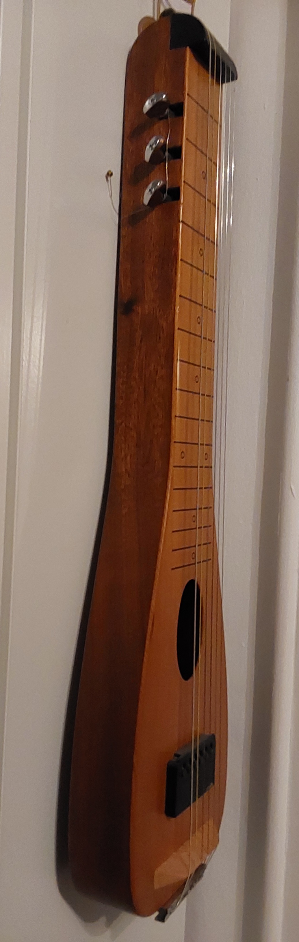 The neck ist mostly hollow like with a Weissenborn, dimensions and silhouette are borrowed from the 1938 Epiphone Electar that I had owned back then.