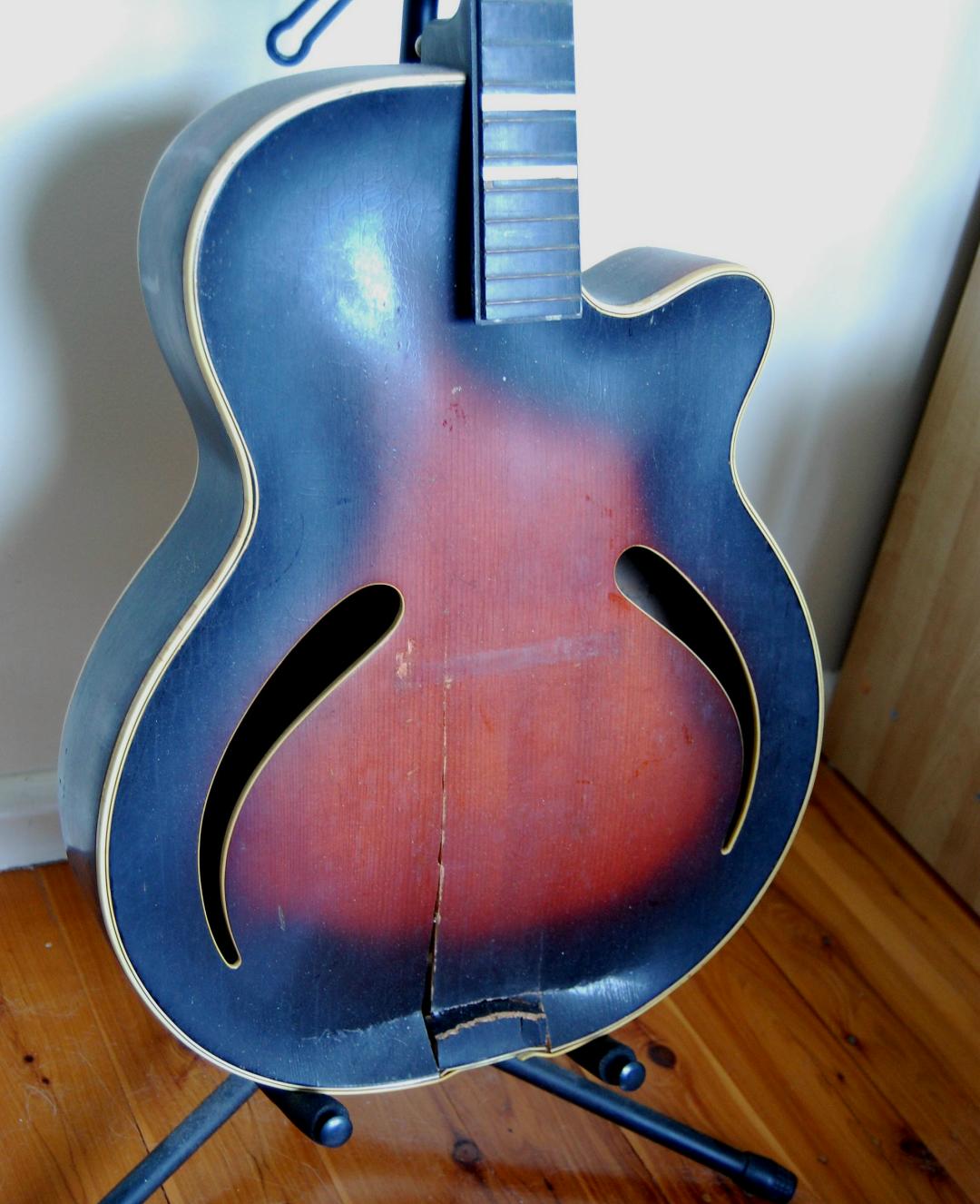 My current project is resurrecting a Hoyer Solist that got wrecked. I say 'resurrecting' rather than 'restoring' as the top has been smashed in, (jumped on by the look of it) and needed major surgery to make it into a guitar again. I soaked the damaged area briefly, just enough to be able to massage the remaining part back into some sort of shape, and then reglued a new tailblock to hold it together. With so many splits running across the grain as well as along it I then had to add some extra bracing and a pair of violin style soundposts under the bridge area. At least now it has the strength to hold up under strings tuned to pitch. I doubt it will ever have a true archtop tone with so much timber inside but it is gonna make one helluva statement as an electric. This is how it was when I got it.