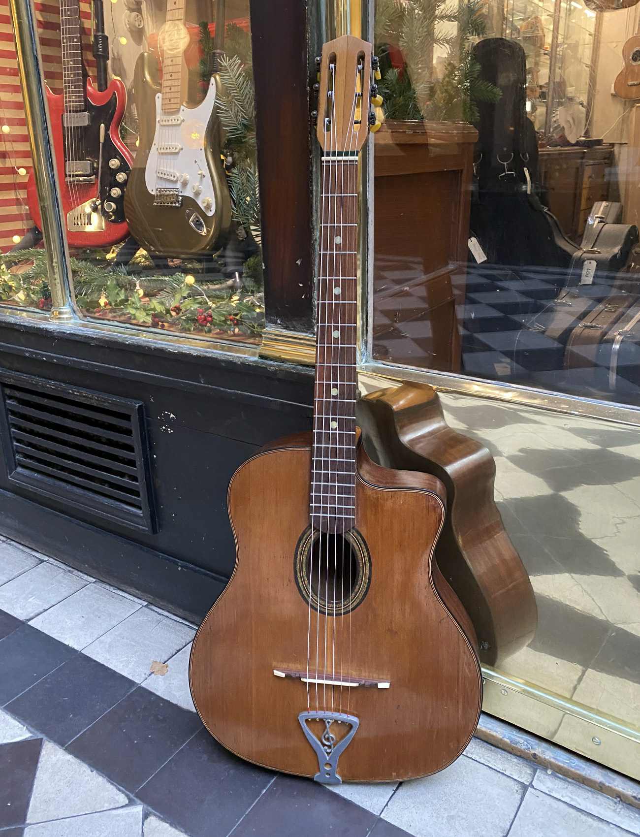 It has the yellow button tuners by Delaruelle common to many Paris made guitars, but the bridge with its white trim detail is typically Italian.