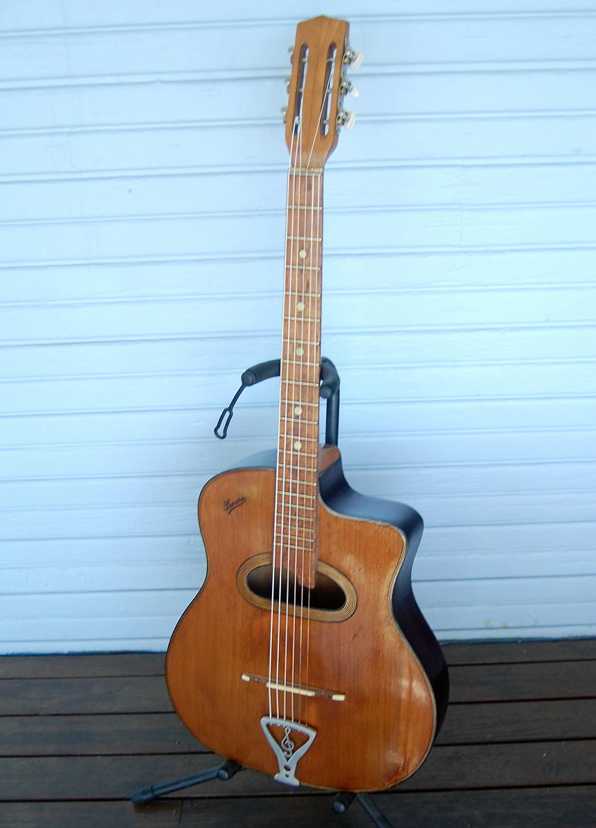 My guitar when it arrived appeared to be almost 100% original, very light and easy to play. I had a local luthier tidy up some details and replace the Bakelite nut and bridge saddle with bone. Although the top is laminated, with bronze strings it produces a pleasing sound and gives me immense pleasure to play.