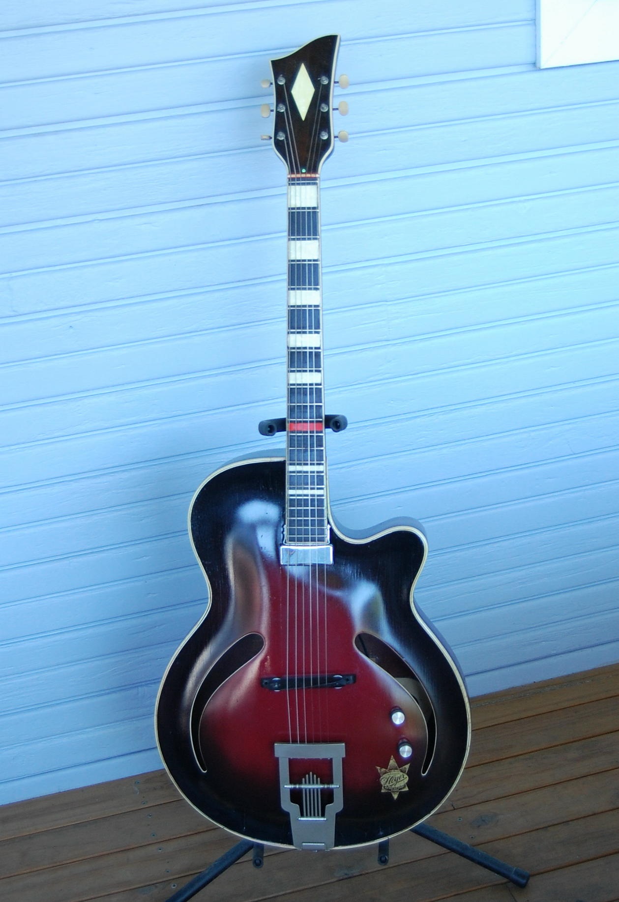 The original tuners and tailpiece remain and the bridge is a typical German archtop type that was a better fit than the Hofner type that came with it.