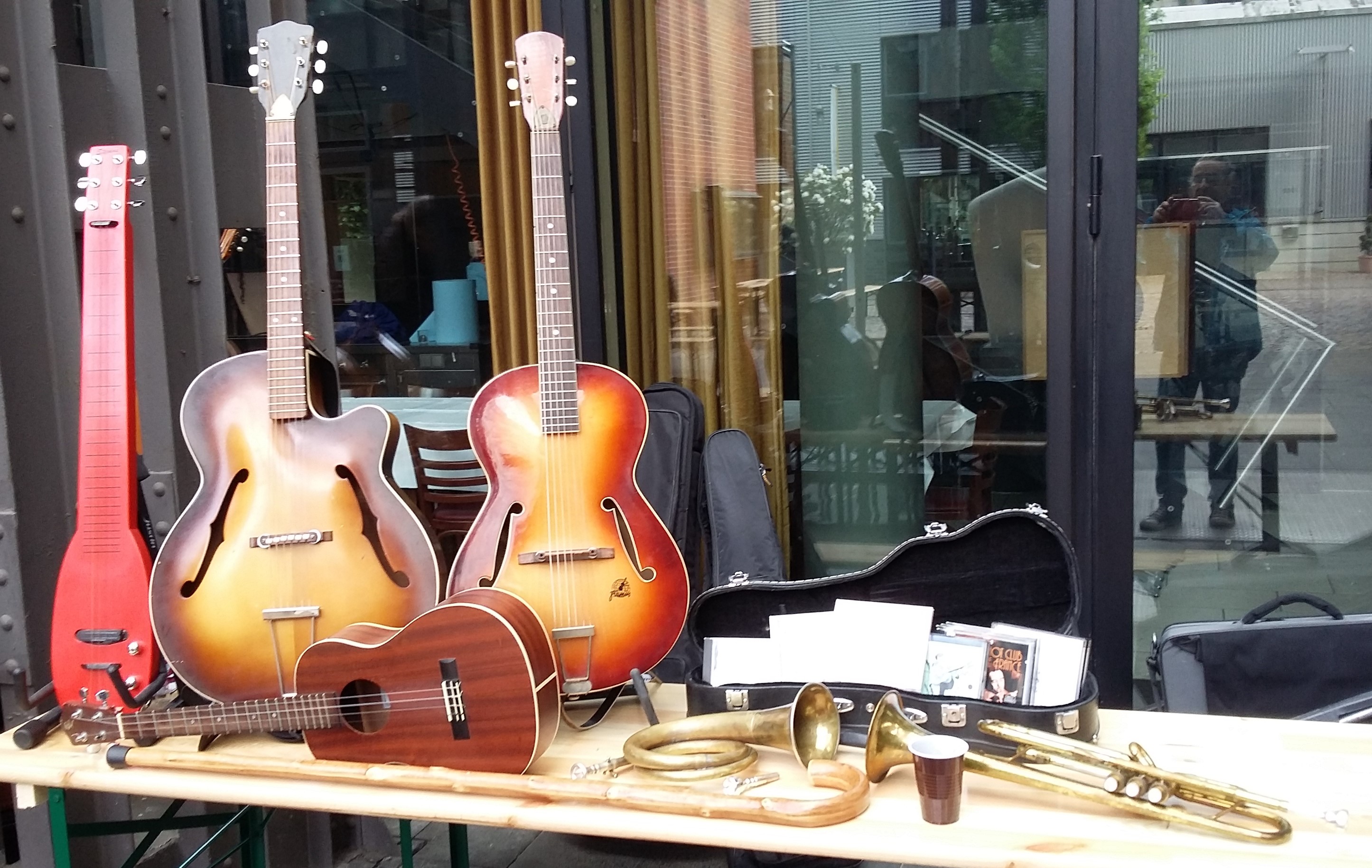 My market stall: Stevens custom built electric slide bouzouki, 1963 Framus Capri or Stella, 1960 Framus Studio, Baton Rouge baritone uke, signal horn, 1963 Besson Stratford trumpet (fine instrument!), and a walking stick trumpet.