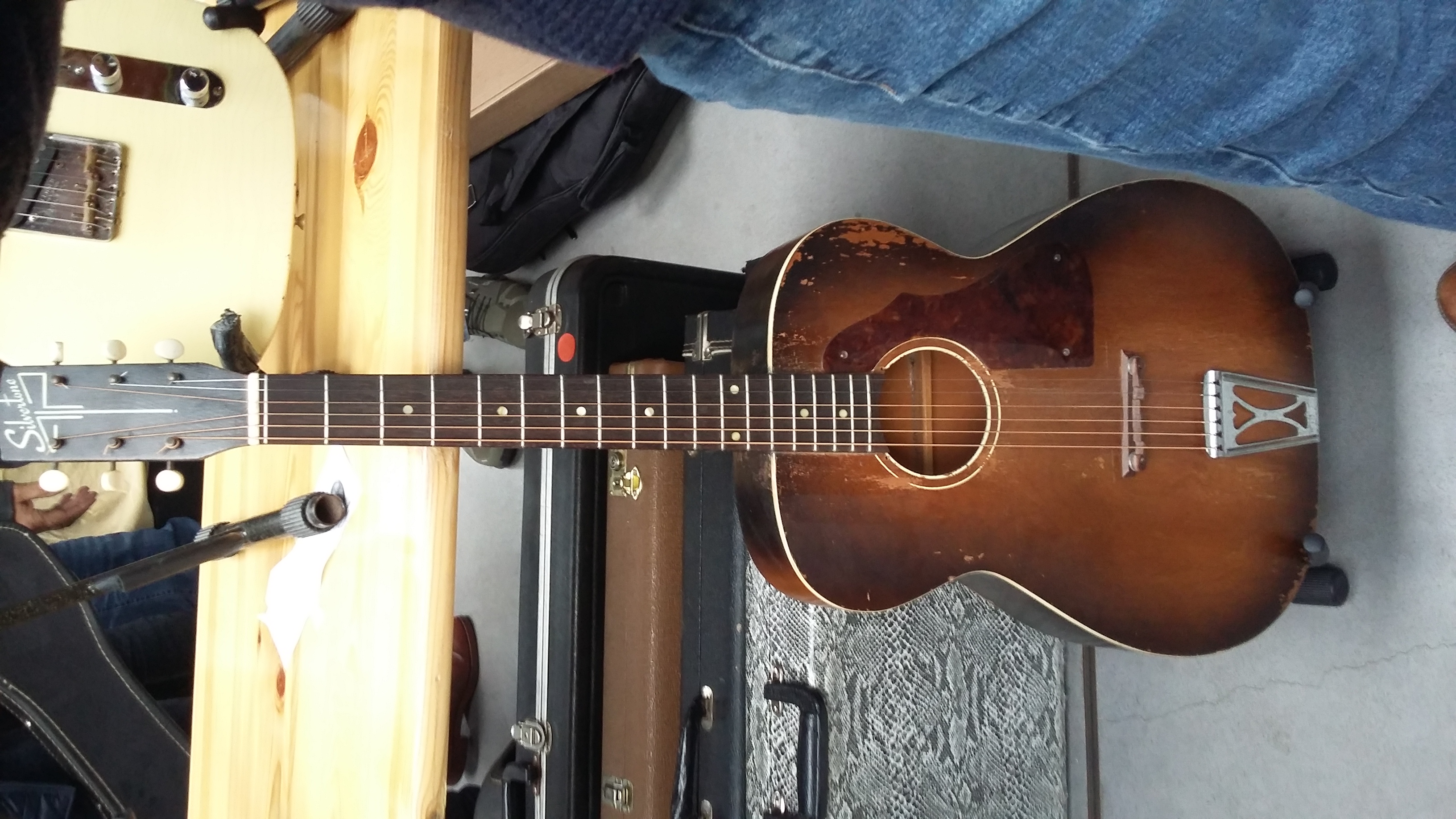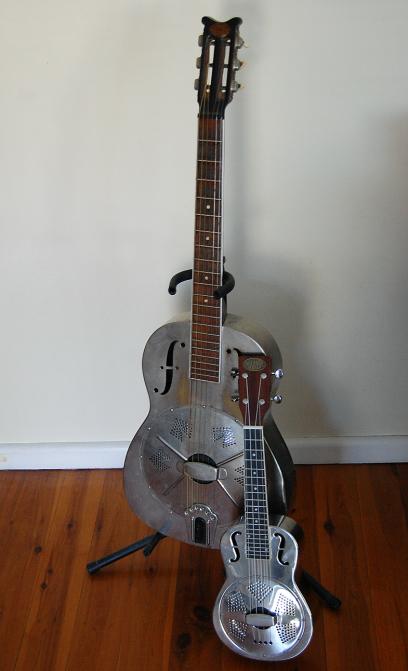 And while we are on odd European guitars, here is my Paul Beuscher resonator. These are rare even in France and this one dates from between 1953 and 1957. They made these until 1971 but the neck on this one is signed by David Enesa who died in '57 making it one of the early ones. Recent research suggests the bodies were made by Selmer. A French historian interviewed one of the Selmer family and he said he definitey remembered metal guitar bodies being made there and the timing would coincide nicely with Selmer getting out of the guitar market but still having their saxophone factory with its metalworking capabilities. Anyway, as I said research is ongoing, but since I took some care setting this one up it now really does have 'the sound' and it can honk out some good old Son House or Tampa Red when I am in the mood. (Ignore the matching uke' that is a recent Chinese made one, just keeping company). I would like to keep this one, but as the old saying goes; "everything is for sale, it is just the price that is the question" so it would take a pretty good offer to tempt me to part with it.