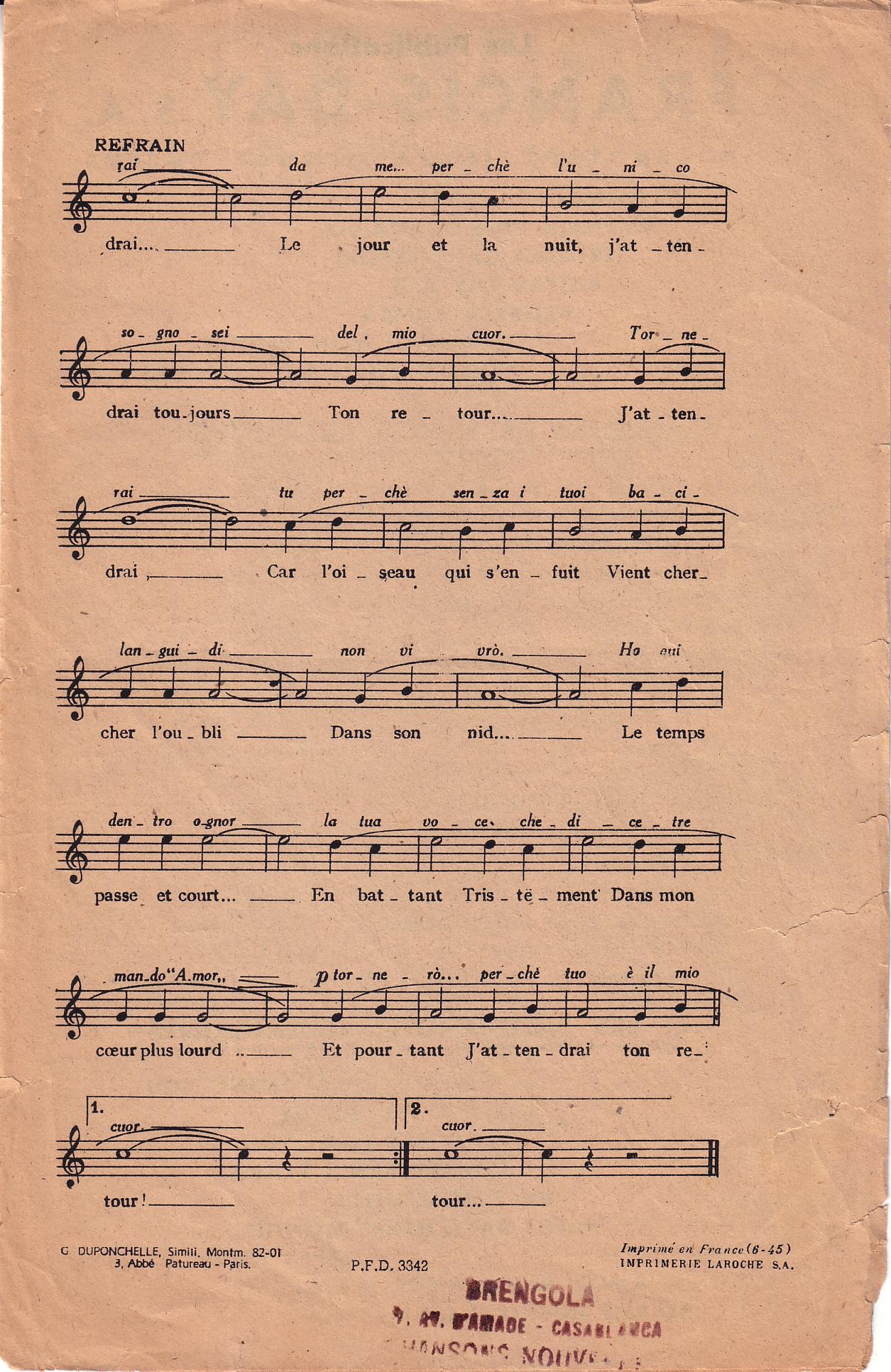 Willie, thanks for sharing that. It is interesting for me to see the different lyrics in French vs. Italian. The song is still about awaiting a loved one, but in French it is "I will wait" vs. "You Will Return" in Italian. Same general sense, but the point of action is different. In French, it is stressing the action of the narrator - the waiting. In the Italian, the action is for the loved one to take action by returning.