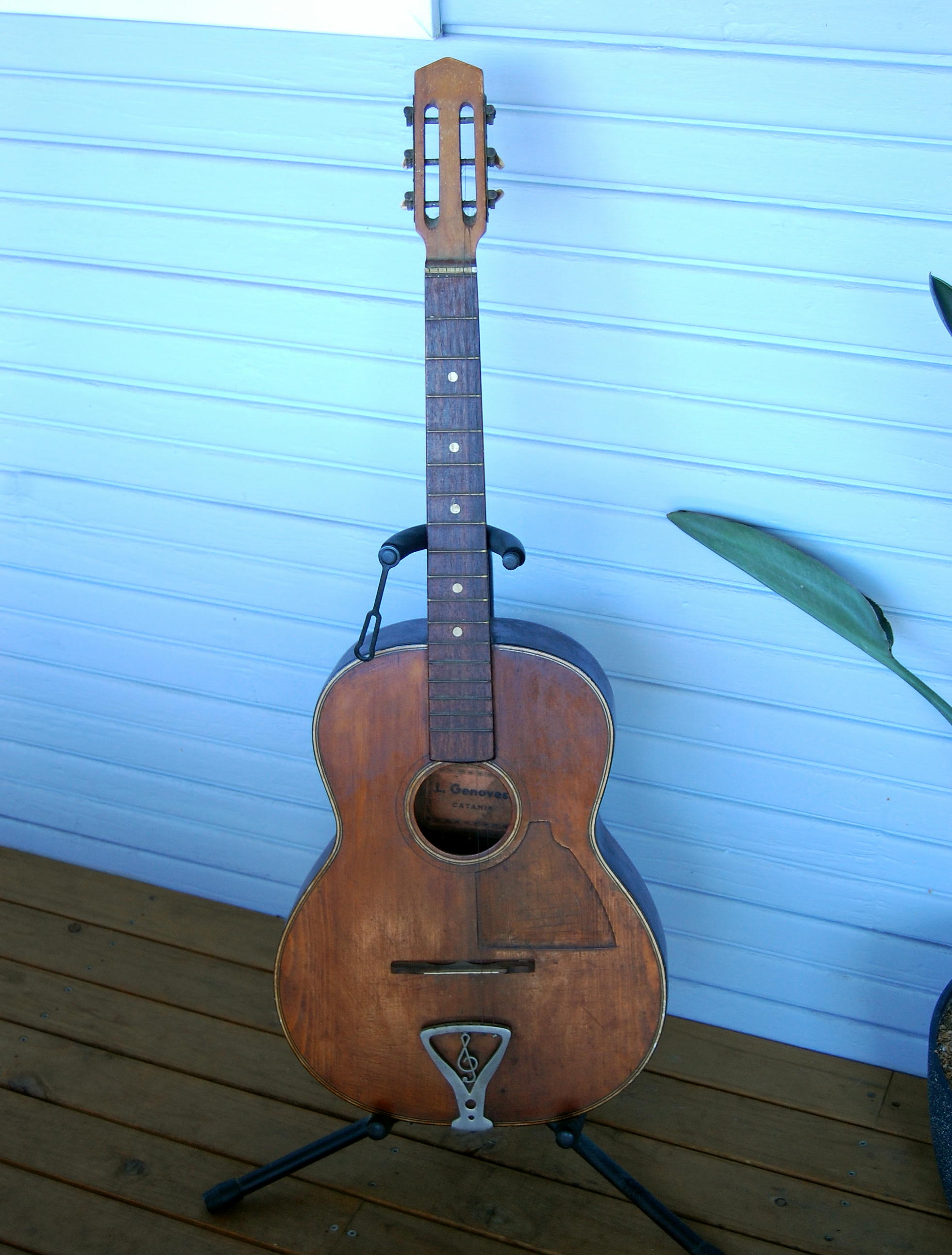 I recently picked up a fairly ordinary looking parlor size guitar with the label identifying it as by Luigi Genovesi of Catania Sicily. Not much info out there, he seems to have been most active in the 1920s and '30s. Was he still making guitars in the 1950s? Certain clues would seem to suggest so, the tailpiece for one.