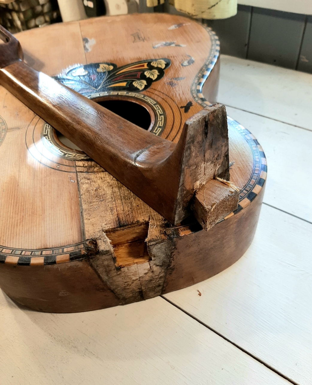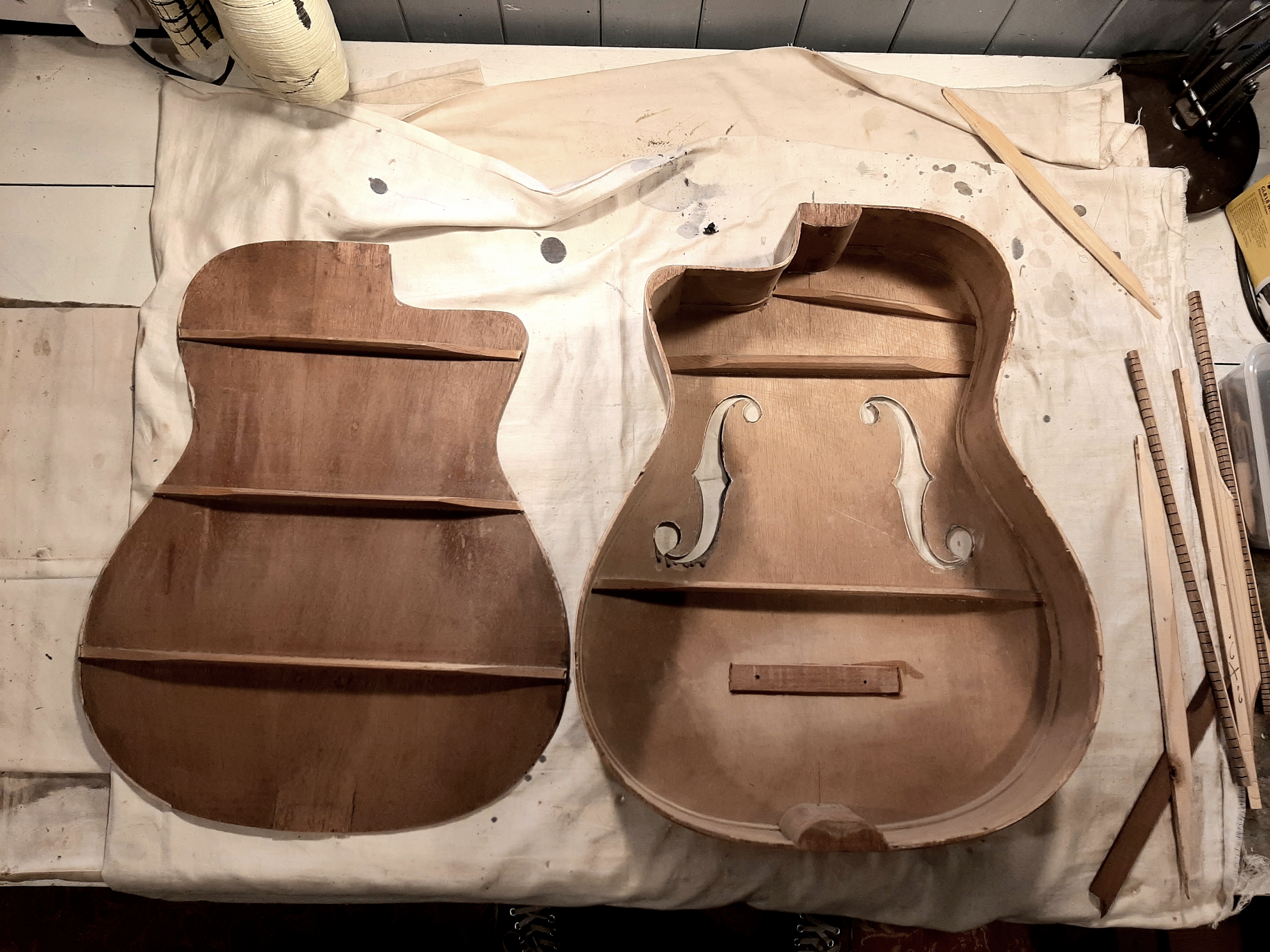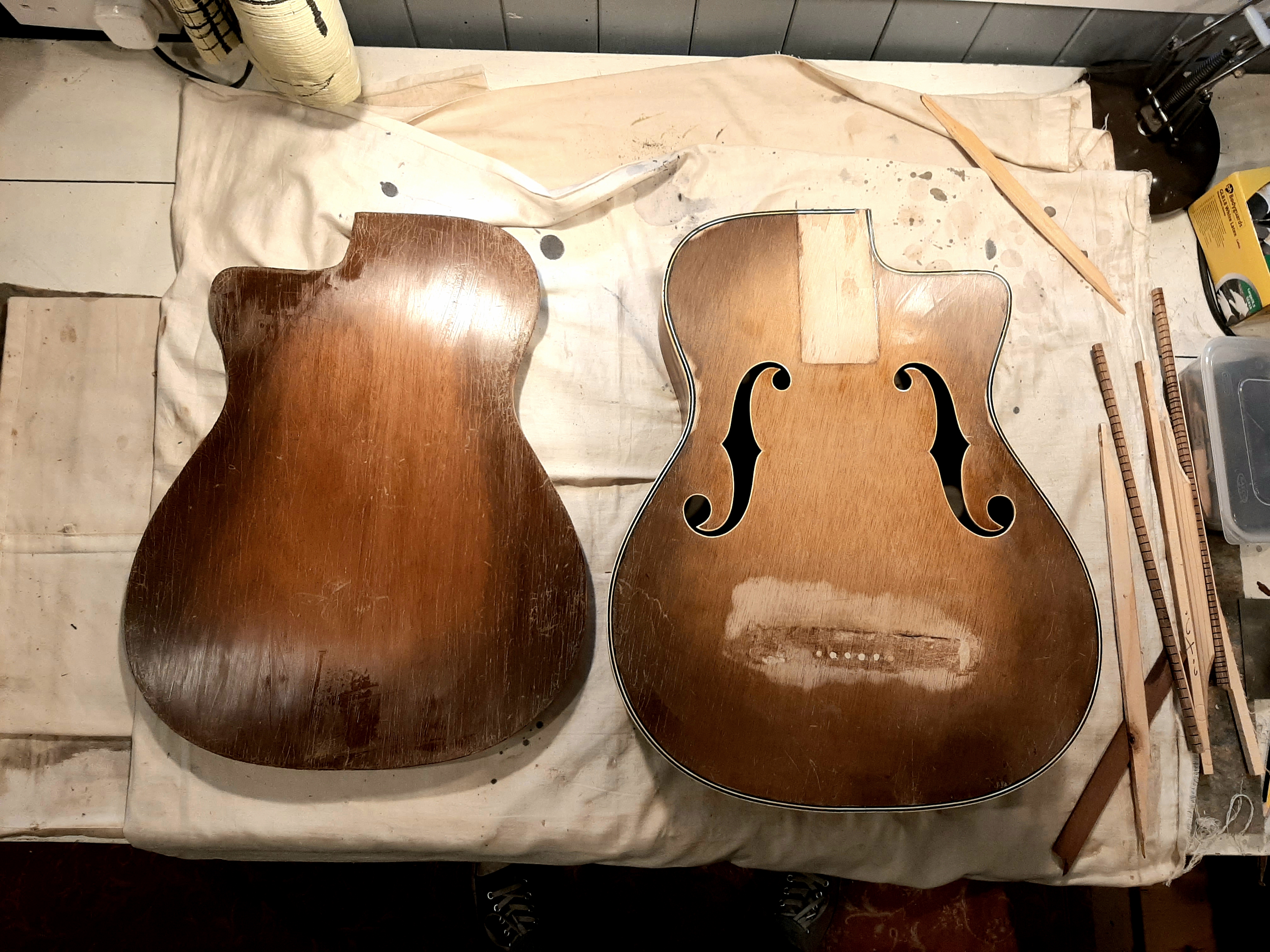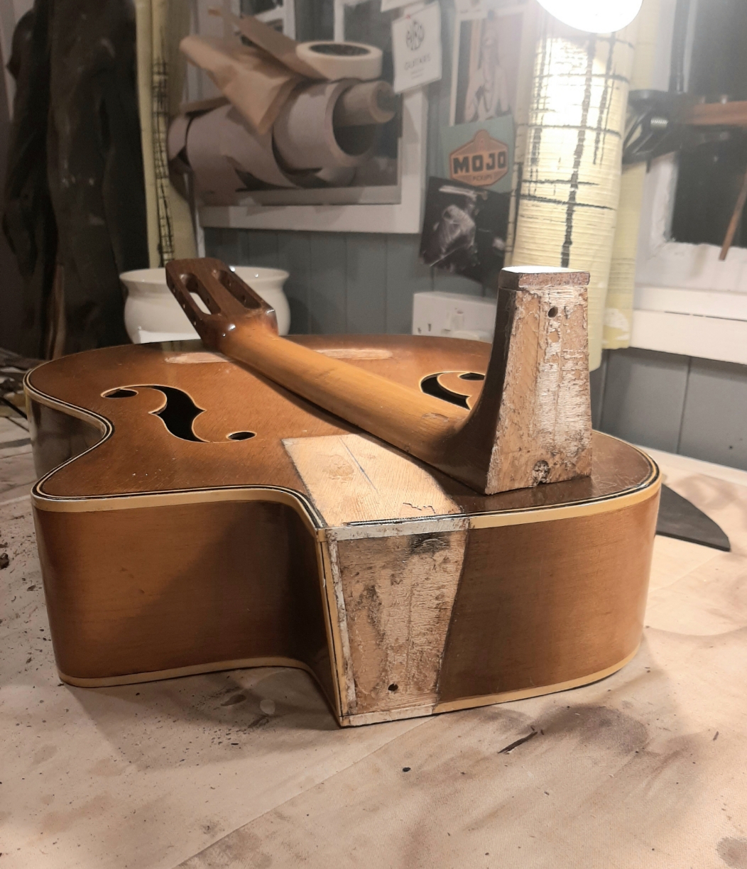 Bones re neck joint. I hate these butt joints. Im happier with some form of mechanical fixing as well as glue. I have 3 GJ guitars two in bits. The Couesnon round hole i converted to a bolt on neck. The chorus im going to go with original butt joint, no access to neck block. Gerome not sure. Interestingly the Gerome has an original dowel through the heel i assume to locate the neck for gluing. Not easy to remove though! All the Sicilian guitars (20's and 30's) on another thread were half dove tail and half butt joint? I converted them to full dovetail.