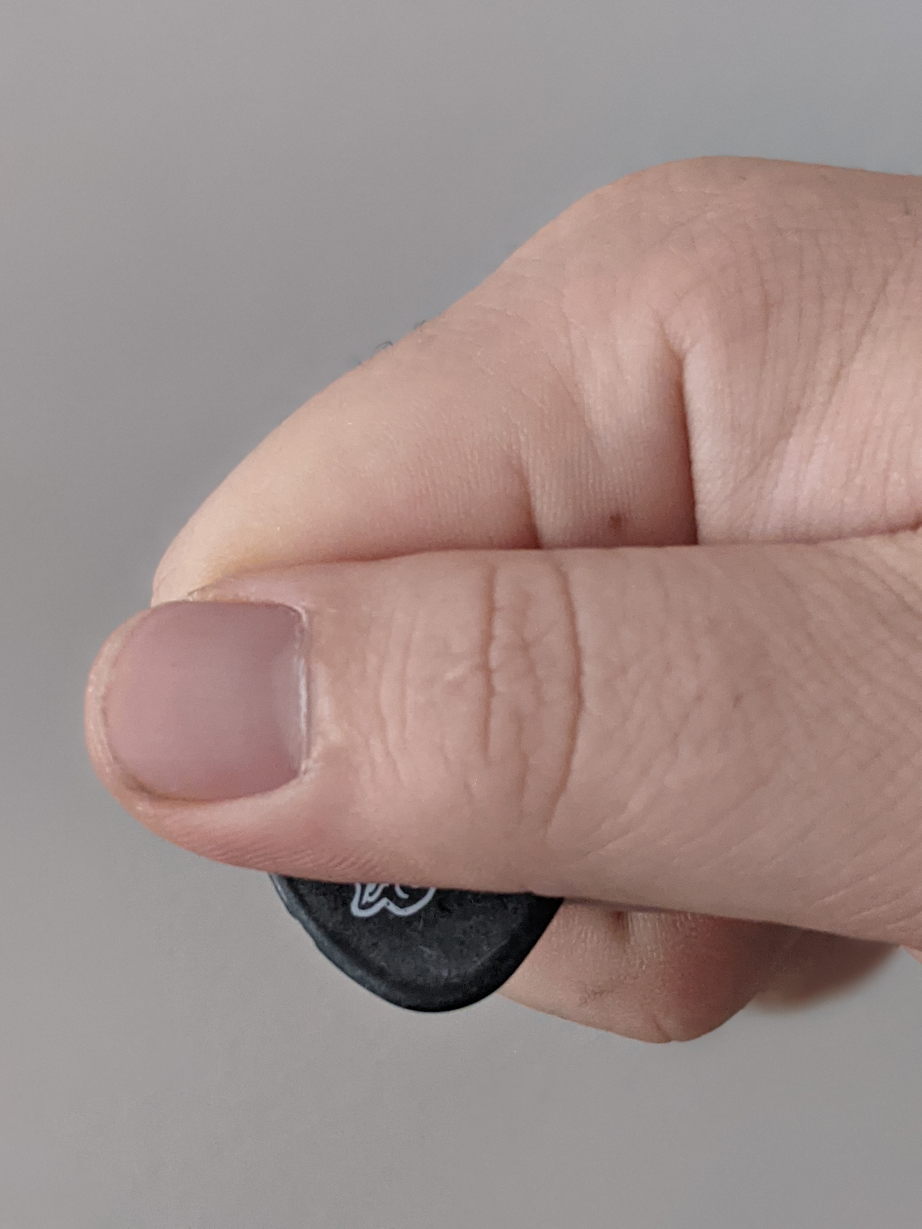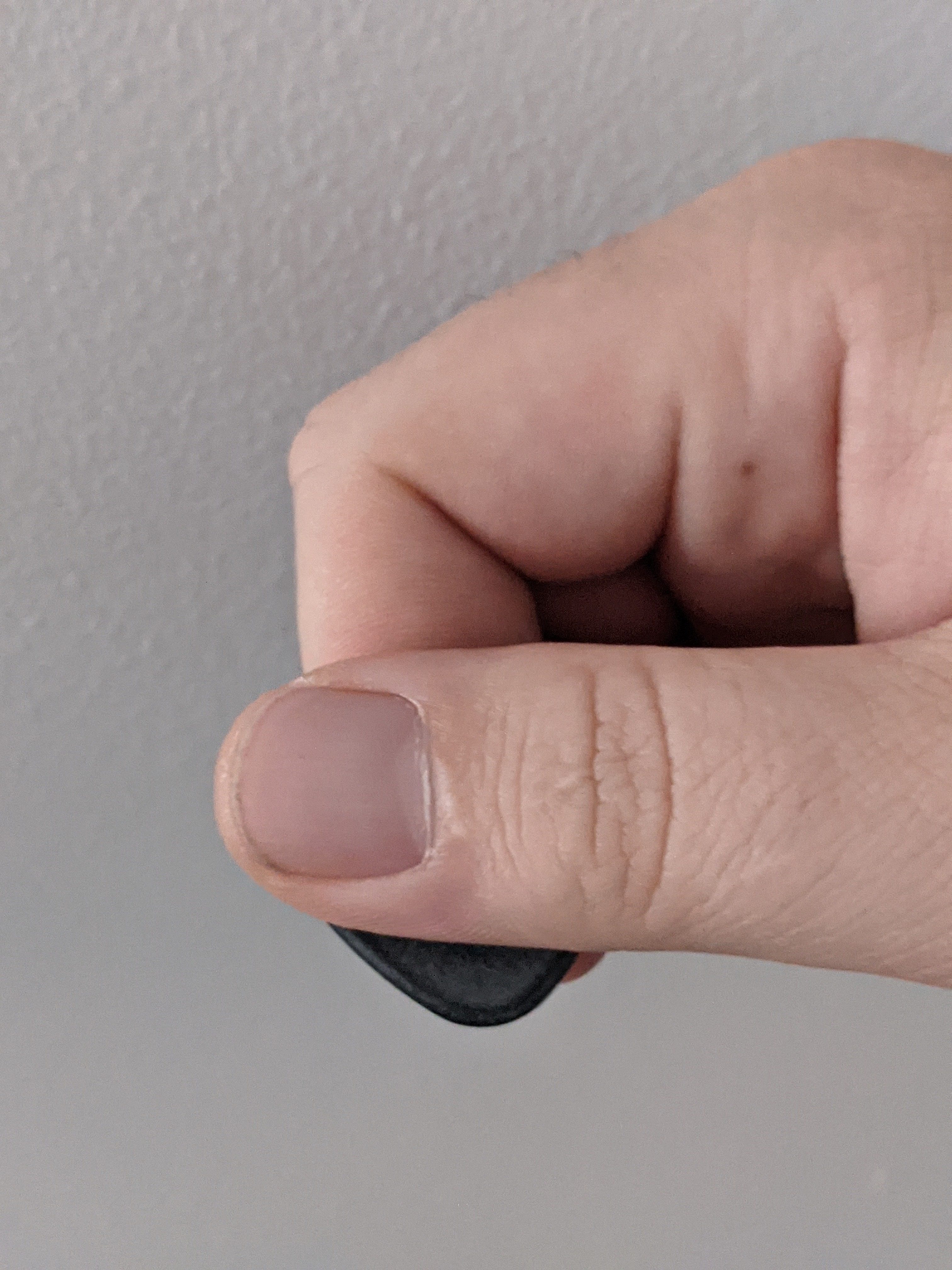 I didn't explain the holding of the pick very well before. When looking down at the pick ( when playing with the side/edge), his the part of the pick that is usually used to strike the strings pointing to the left or right. In the photos this can't be seen