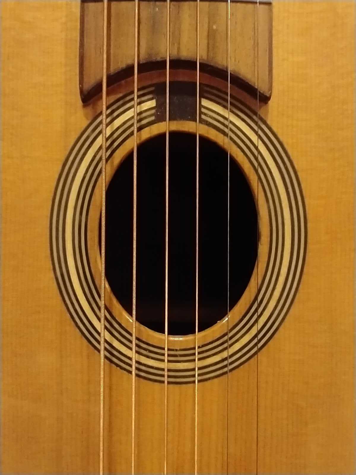 Here are pictures of the front, back and side ports. Haven't had a chance to really hear it, as the strings on it don't seem to be in ideal condition. I'm not even sure they are meant for this type of guitar to begin with. I have it tuned several steps down to avoid putting unwanted pressure on the top. Not to worry, I have a fresh set of argentines in the mail. The bridge is weird indeed, it isn't glued on. It's a single piece, which I understand isn't your typical moustache bridge? I may take it to a luthier to have that fixed, or do it myself if it's not a big job.