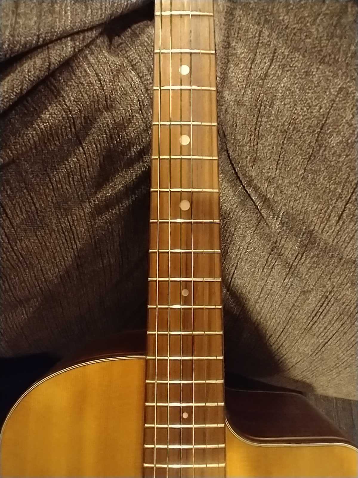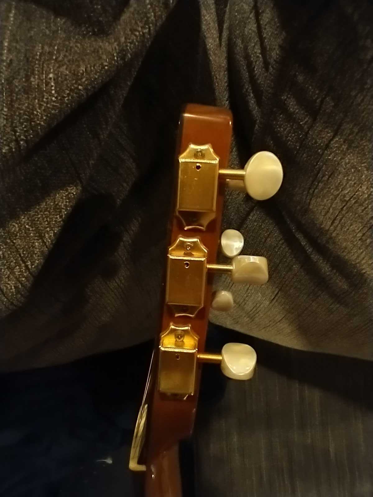 I come to you from the classical guitar world, so please forgive my ignorance. I've always been interested in Selmer style guitars, but always kept waiting for a good deal. It's the "I want to try it but I don't know if I'll like it" kind of story. About a month ago I won this oval hole on ebay (it was a bit of a gamble, as I won it from a general auctioneer). Now it's time to see if my recklessness paid off or not. The guitar doesn't have a label inside or any manufacturer's notes of any kind (although there are some remnants of glue where a label should be). The top seems to be solid wood, maybe spruce. The tuners are unbranded, I can find cheap lookalikes on Amazon as well as expensive ones on Stew Mac. There is no logo of sort on the headstock. The tailpiece is fairly standard when compared to other guitars on the internet, it has a sort of "Z" or "2" engraving where the "S" should be. The bridge is not a 3 piece bridge as most guitars seem to have, it is a one piece bridge. The back and sides seem to be good quality laminate (by that I mean, the inside of the guitar almost nearly matches the outside of the guitar). The previous owner added two side ports, no idea why. The back of the neck has a "QC" sticker and what appears to be a serial number, which probably means it's a mass produced guitar. It came from Delaware U.S.