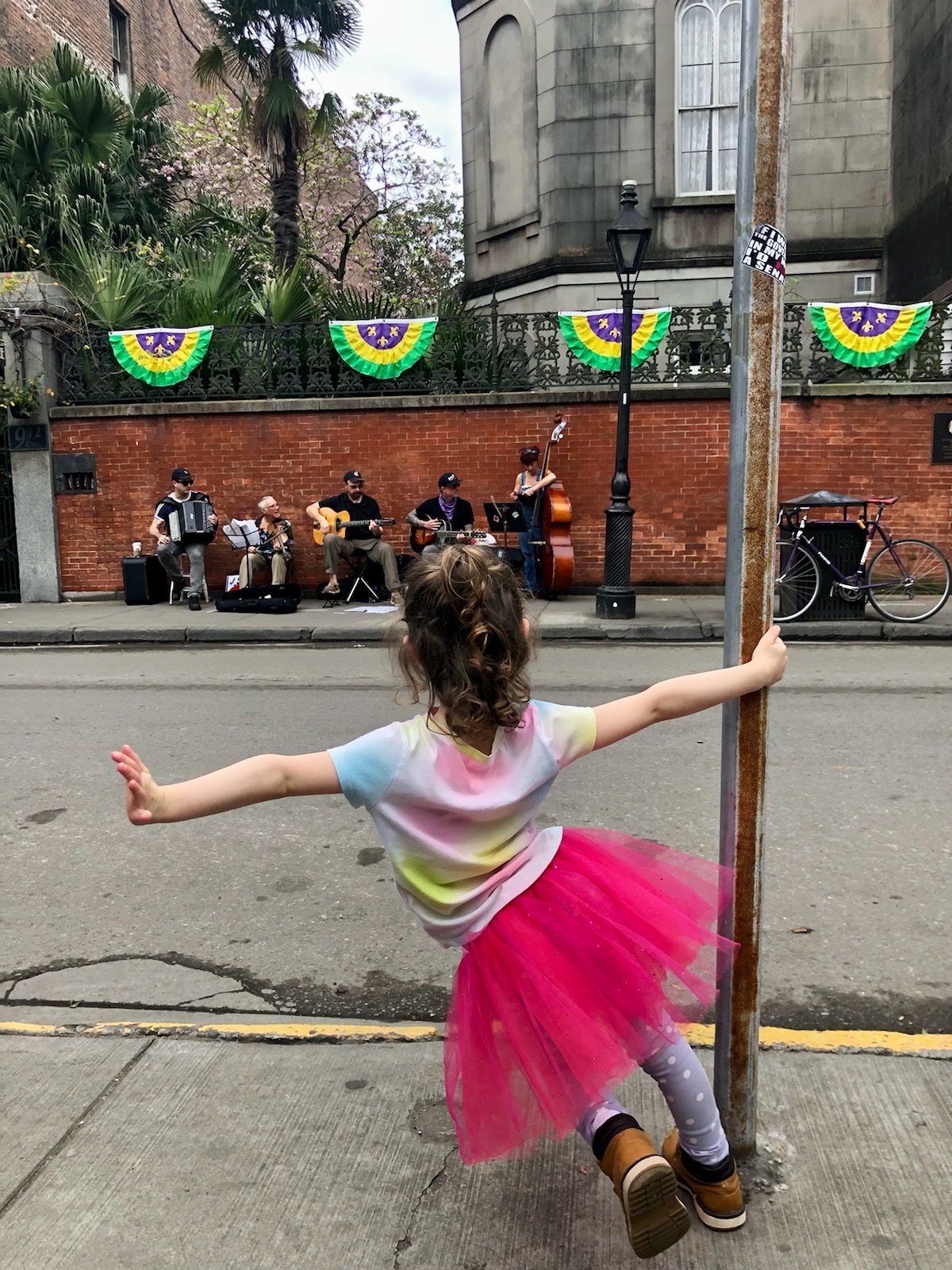 Because most of the locations are open air on the street, it’s sometimes difficult to form even a horseshoe shape so we can hear each other well, as you can see in the picture below. Nonetheless, what a beautiful place to be in the Vieux Carre’ of New Orleans. We may even have a fan.