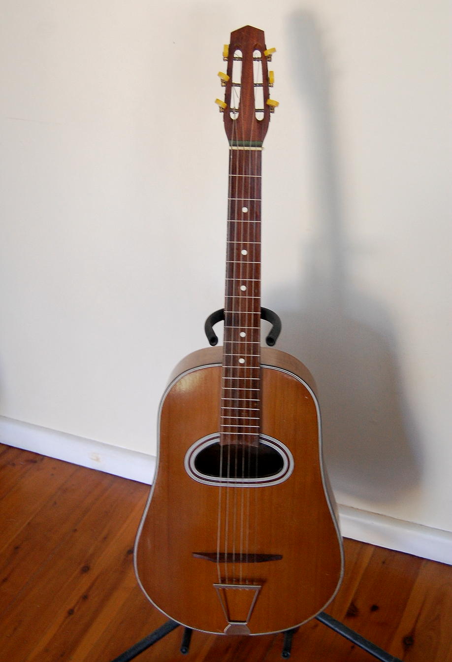 Not quite 'Gypsy Jazz' but being a fine example of Antoine Di Mauro's craftmanship I thought it may be of interest on here. Made in Paris probably in the 1950s, possibly earlier, but I understand the trend for Hawaiian guitars in France had passed by the mid-fifties.  Spruce top, laminated maple back and sides with a nice clear 'flame' or 'tiger stripe' and a mahogany neck.  It has the original bridge, tailpiece and yellow button (upside down) Delaruelle tuners.  It has the A.Di Mauro branded mark on the back of the headstock and a raised nut set up for Hawaiian (or lap steel) style playing with a bar.  The finish is in excellent condition with no chips or cracks and very little signs of wear.