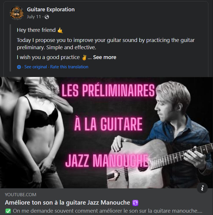 This came through my facebook feed today. Anybody want a little soft porn with their Django licks? I just reported to the Gypsy Jazz Licks and Tricks group admins, for what it's worth. I suppose, if it bothered them, they would have taken it down already. It may be time to remove myself from this group I don't use.