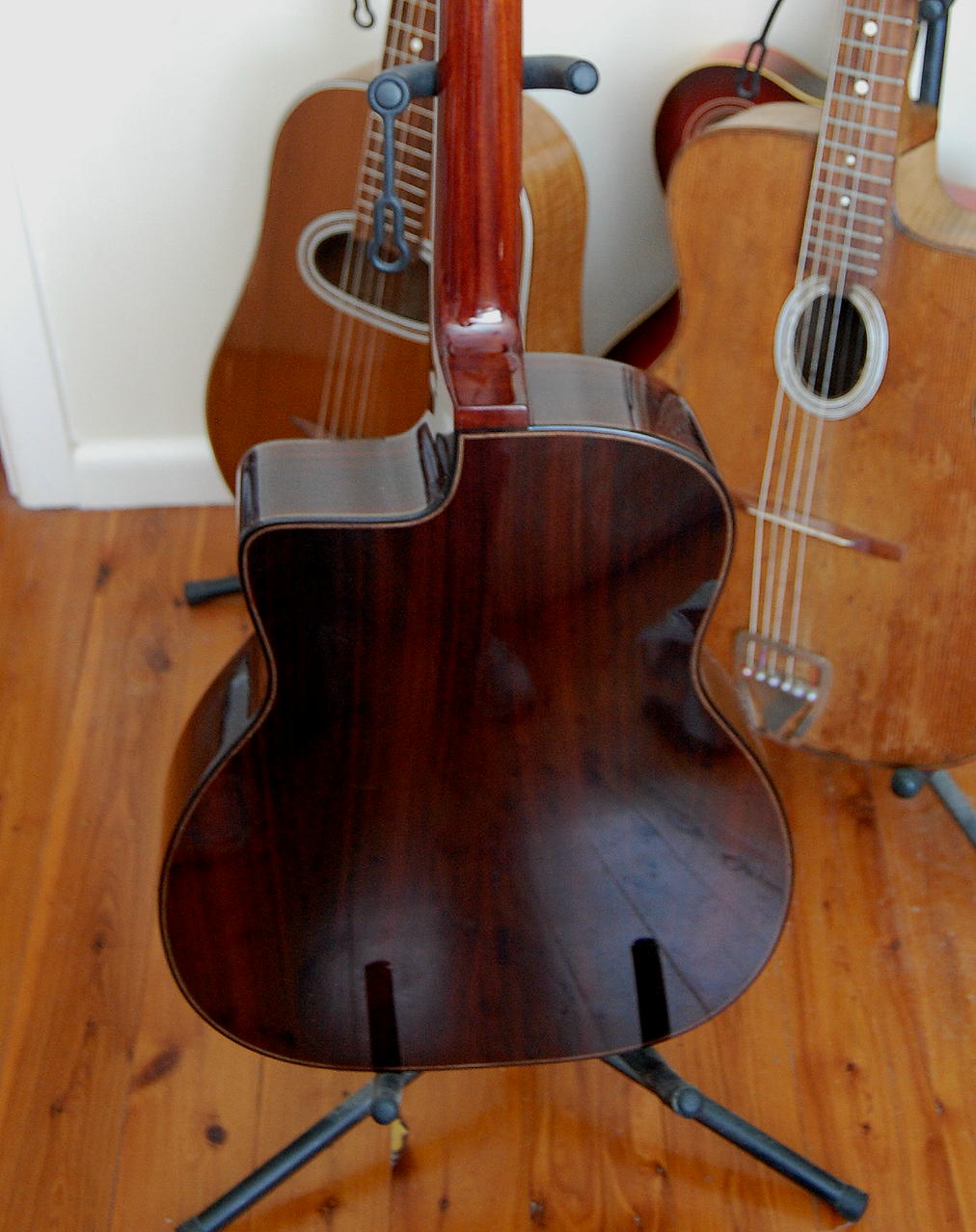 As a copy of the DG-255 model every detail is totally accurate, the ebony/maple/walnut layers of the edge binding, the size and spacing of the fret marker dots, the timbers used, the bridge, tuners and the tailpiece with the Saga stylised S, everything is identical, closer in detail to the original than any other 'copy' I have seen. Even the dimensions, and the 1 3/4" nut width are exactly the same. The only detail that does not match as far as I can see, is that the front of the headstock is lacquered mahogany where every other Gitane DG-255 I have seen have an ebony veneer. Or am I wrong about that, did they make some without the ebony? If someone went to such lengths to make accurate copies that would seem an odd detail to miss.