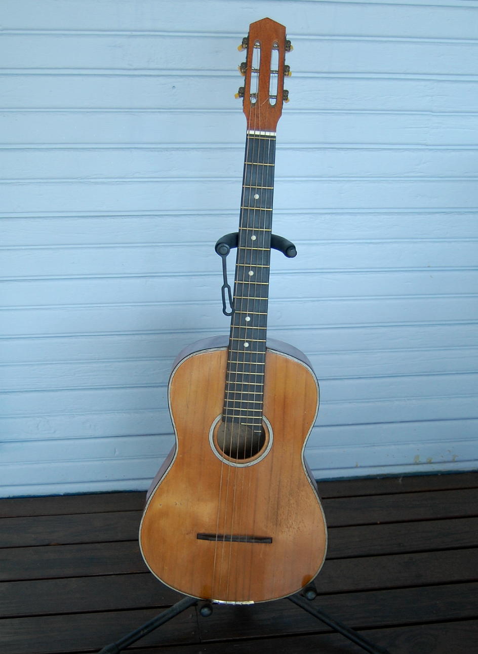 I bought one in a better state about 6 months ago for £500. I changed the tuners - with difficulty due to the spacing of the original posts - stripped the top and fixed a small split in the top. I also put a small soundport in the upper bout to improve the sound, which made no difference to the sound at all. The seller described the guitar as having that typical gypsy 'bark'. That was nonsense, unless he meant like a Pekinese or other small yappy dog. To my ears it sounds crap and is the worst £500 I've ever spent on a guitar. Hopefully you spent a lot less than that and that you end up with a playable and decent sounding guitar.