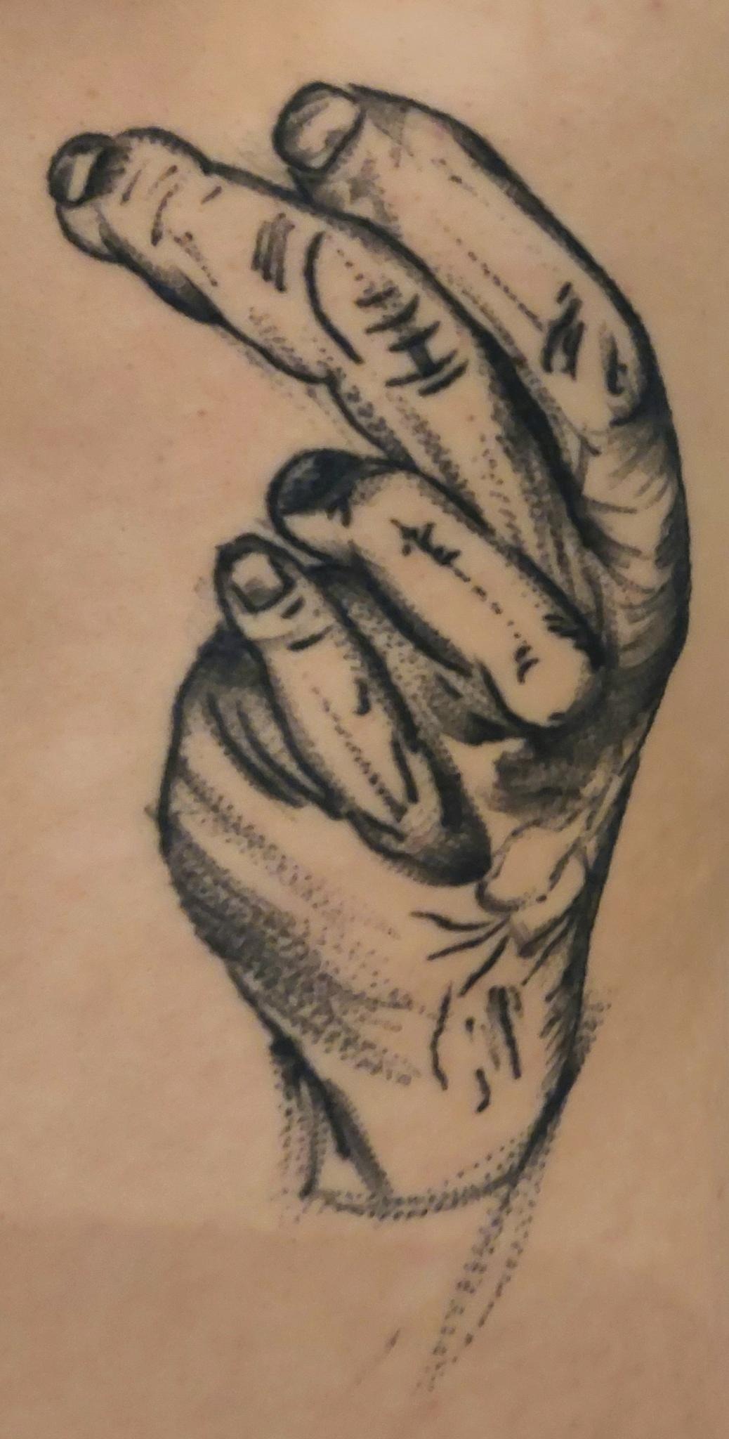 I'll start with my tattoo of the most famous hand in music history based on a drawing by R.S.Baxter that I guess everyone in here has seen. It may be a bit of a poser thing to do, but at least the members here know the significance of the motif as opposed to the casual swimming pool visitor who assumes that this is just a poorly implemented design of an failed middle finger tattoo haha.