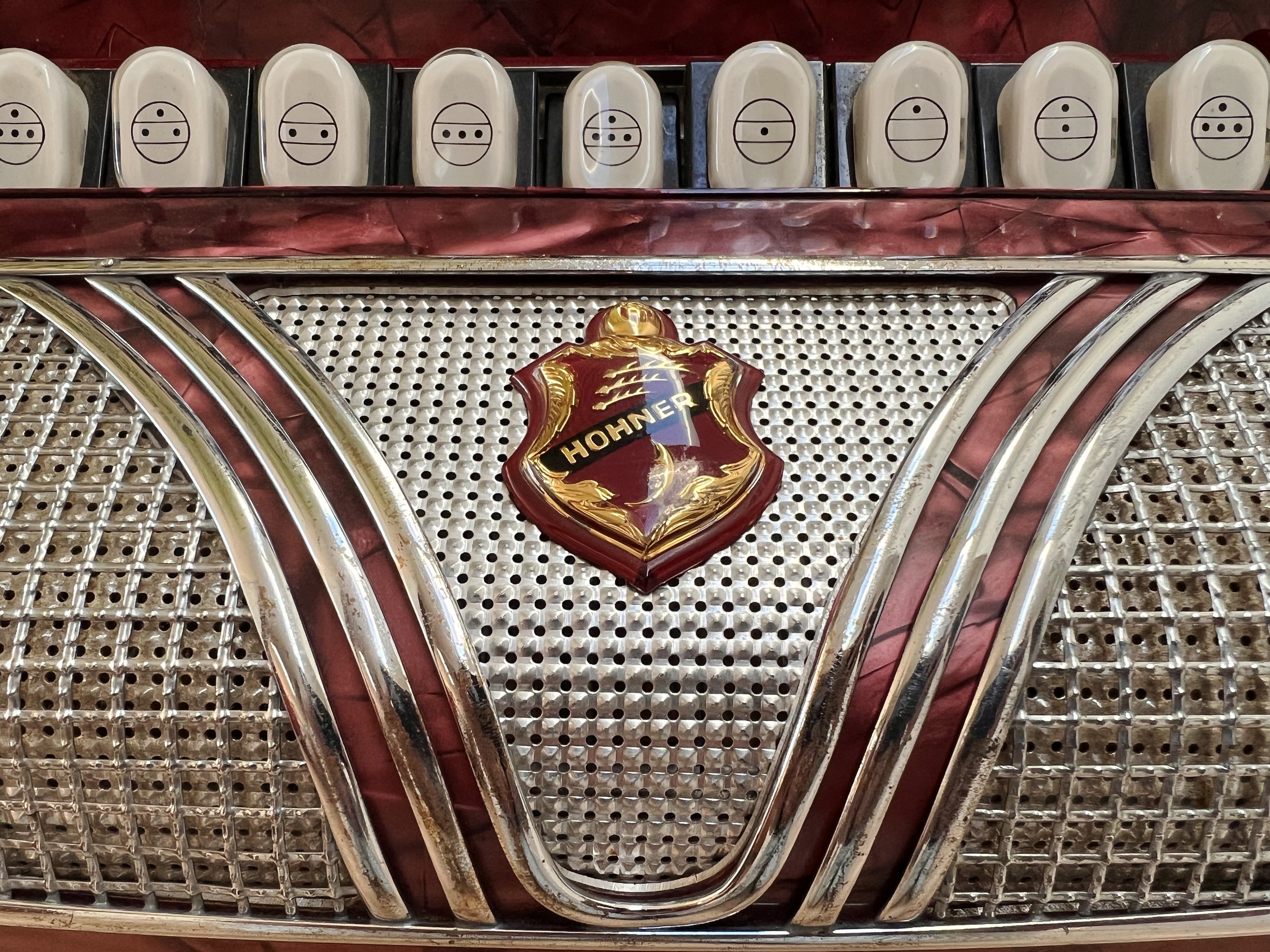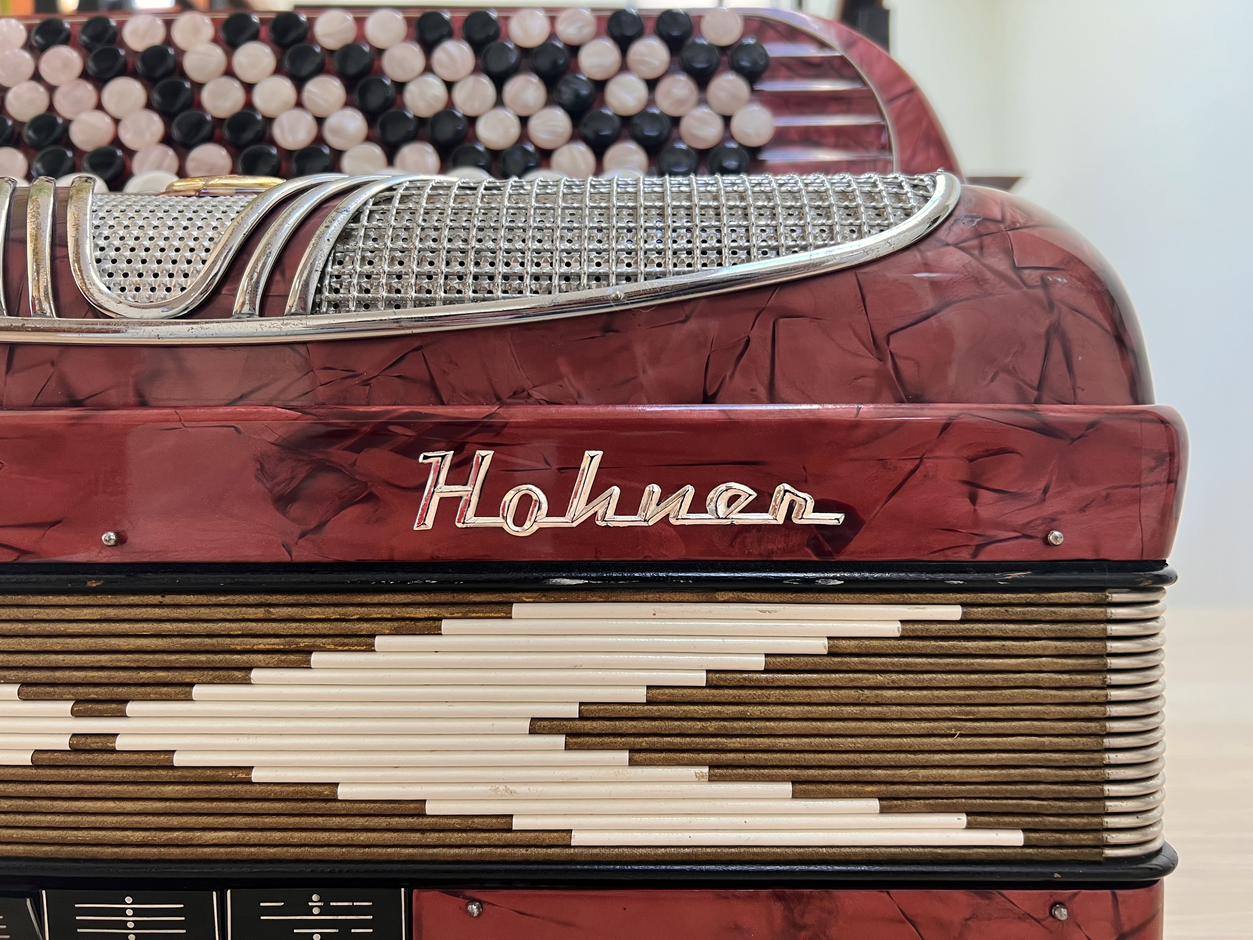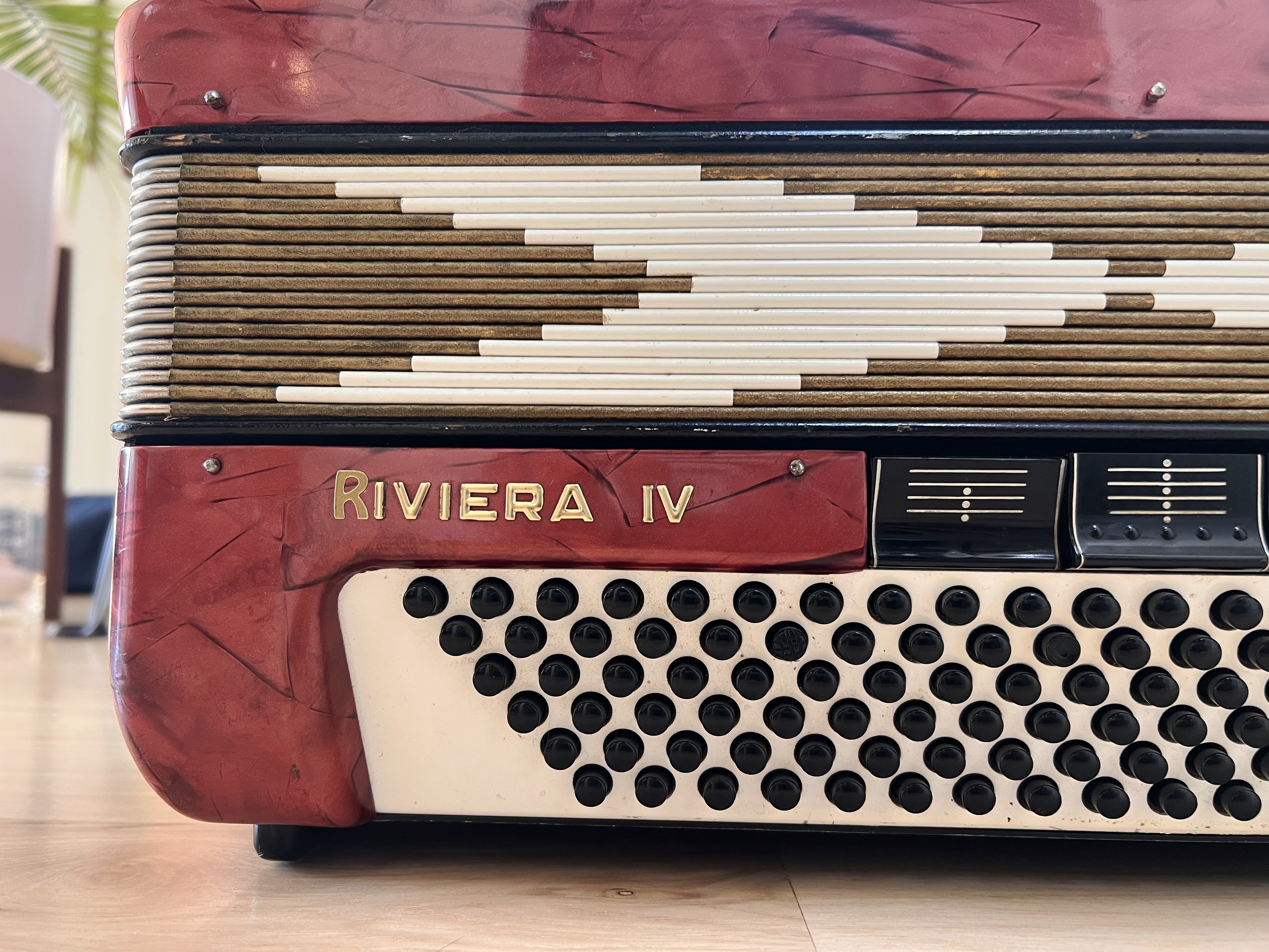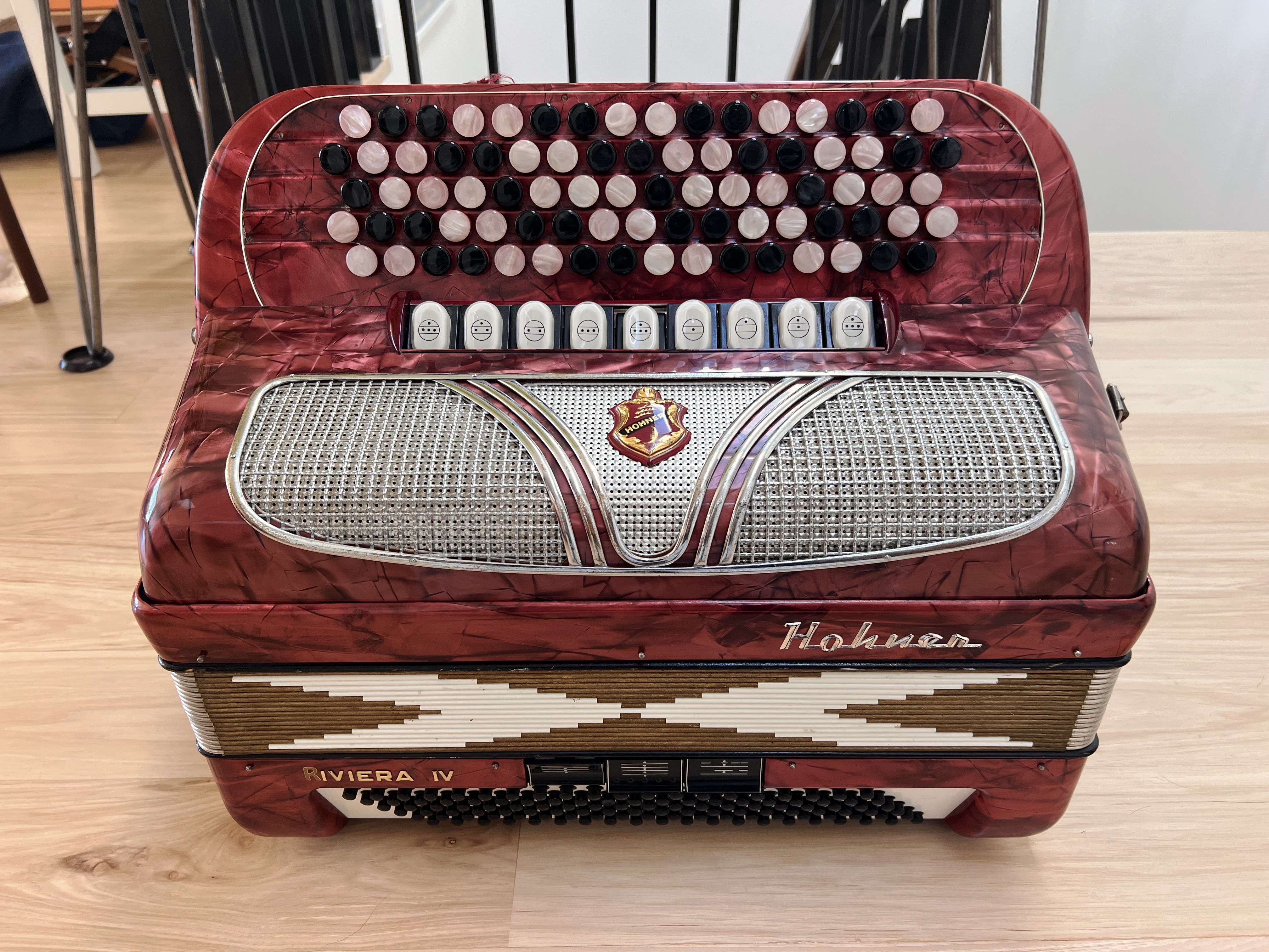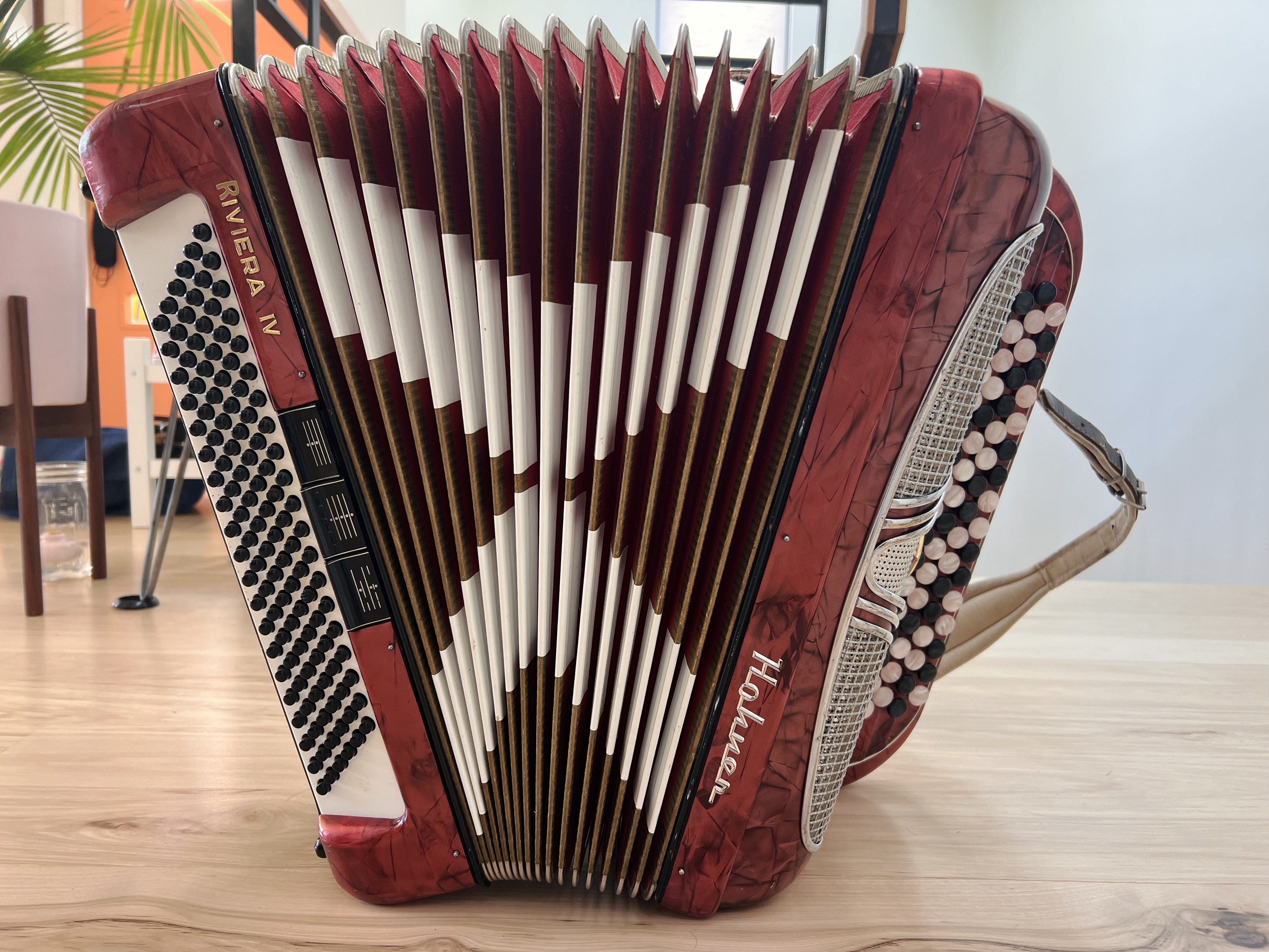 $900—Vintage Hohner chromatic button accordion. C system LMMM triple musette tuned. Super cool sounding with the “French” detuned reeds. All notes sound, and the bellows are good. I had the techs at Smythe Accordions in the east bay fix/adjust everything to make sure it was all playable.