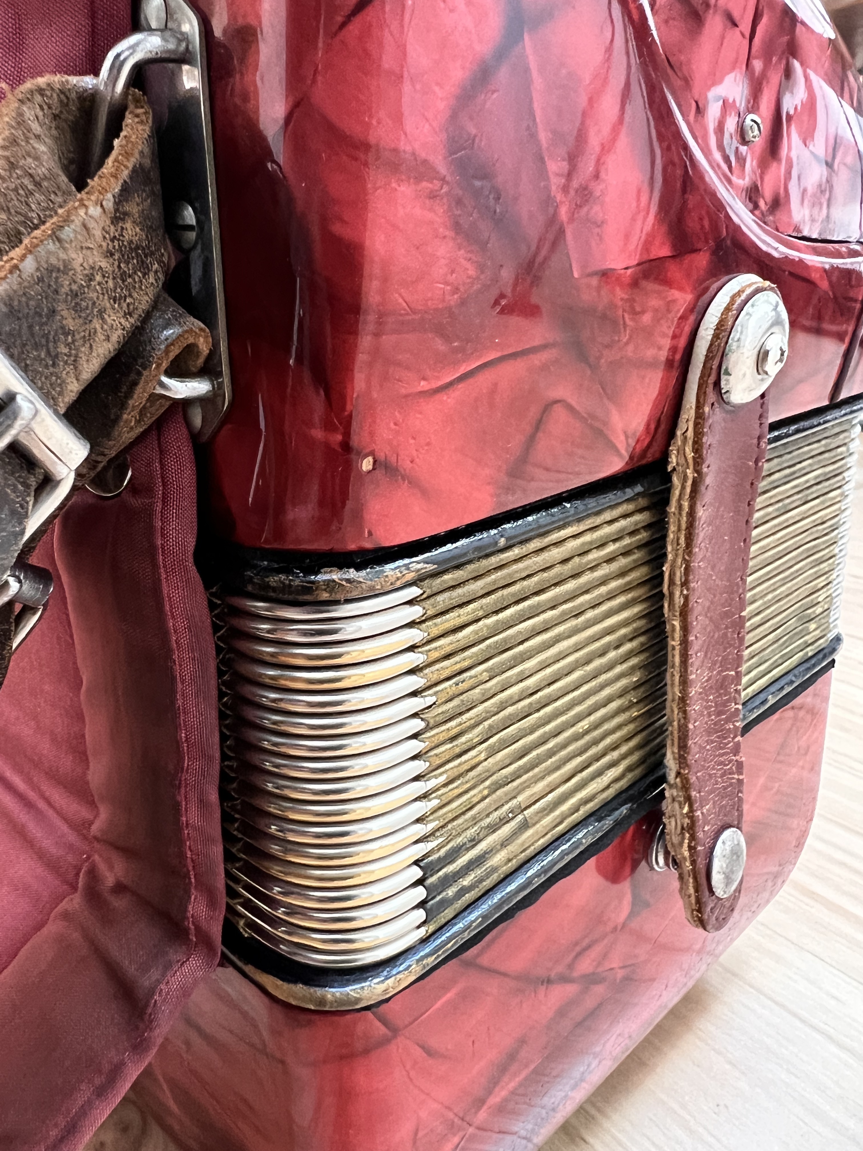 This is an old vintage accordion, so there are dings and scratches. But overall it looks like a classic car from the era. Great instrument to learn on, have as a backup or traveling accordion, or to add the triple musette sound to your playing.