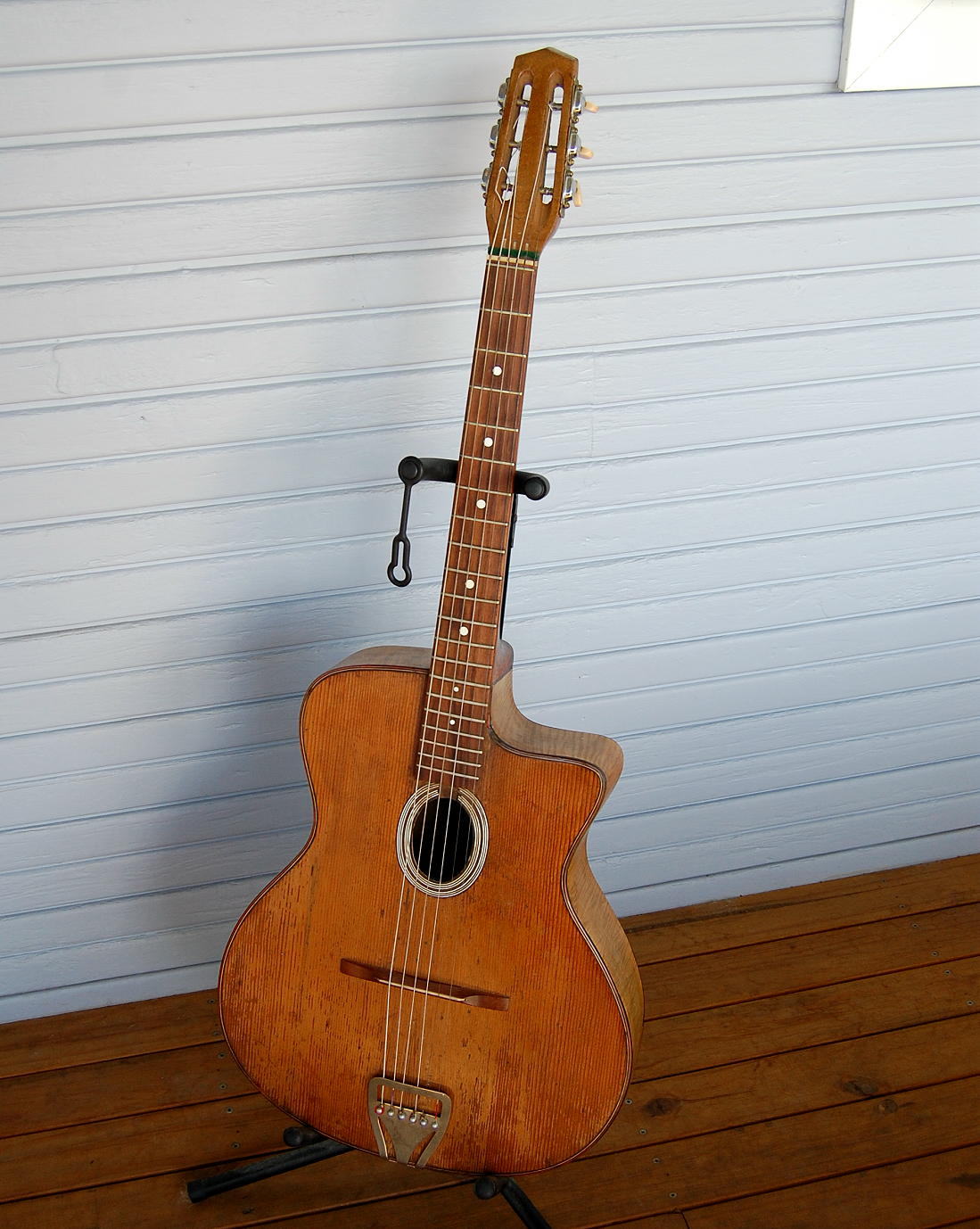 Probably a spruce top, (but it could be cedar by the colour of it) with laminated maple back and sides with a nice tiger stripe to the veneer. The neck looks to be mahogany with good frets and a straight low action. The neck has been reinforced with three thin metal rods at some time in the past, (the ends are just visible above the nut), and it is perfectly straight with a nice easy action, with a string height of 2mm at the 12th fret but if you play hard you might want to shim the bridge to raise that a little. The bridge and tailpiece are original and the covered tuners are not marked but similar to Selmer or SB type; possibly by l’Huillier et Massicot.