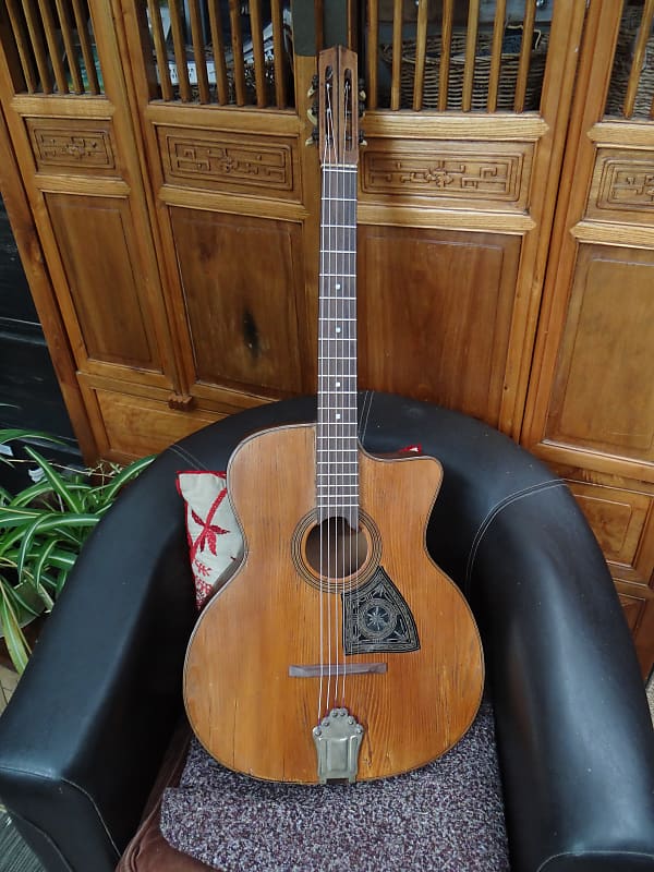 (I nearly bought one of these from Palm guitars for €250, needing work. Wish I had, now. It later turned up for sale, with a new painted tailpiece, asking 10 times the price:- )