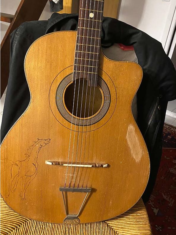 There are three Sonoras on Reverb right now. One a rather plain small parlor style and one of the more common Grande Bouche type that is once again claiming the old 'made by Busato' cliche that seems to have stuck to these although it has more in common with maybe Castelluccia but with what looks like a Sicilian bridge. The third is this one of unknown provenance but featuring a fancy burned in (?) horse design. Again the Sicilian bridge and that odd 13 1/2 fret neck to body joint. Any clues?