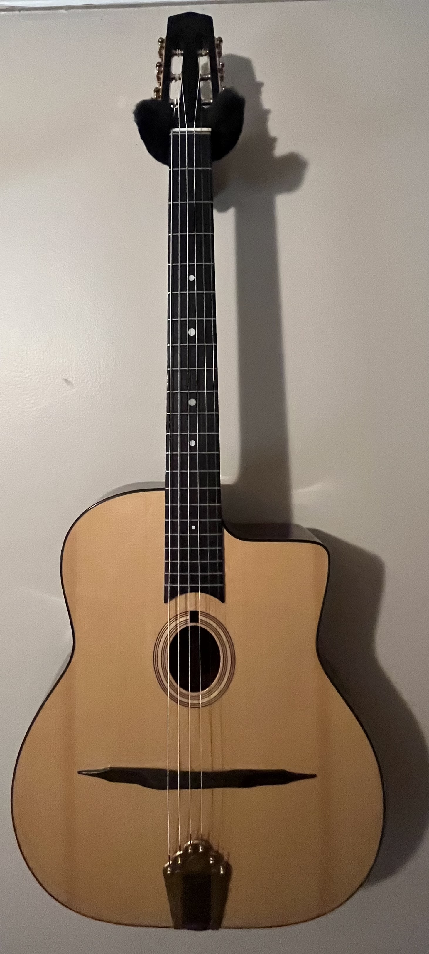 Since I now I have two great guitars, I want to diversify a little bit. I gave the edge, very slight edge, to keep my Gitane for my petite bouche guitar and am looking for a long scale, 14 fret, D hole guitar of similar value. (even a little less value is ok if it is what I am looking for). My guitar is in great shape with a slight amount of wear from playing, hard to find pick marks and dings.