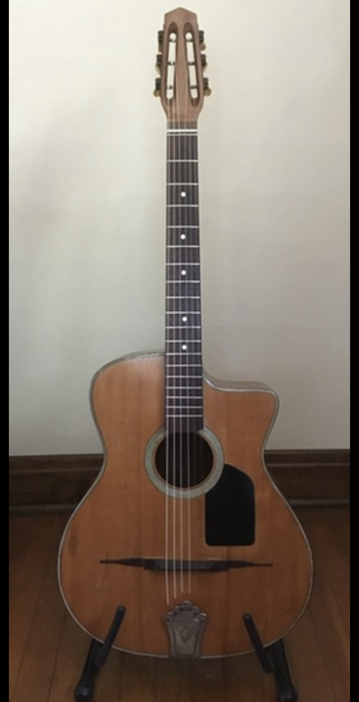 I have a 50s Antoine DiMauro Modele Django up for sale - needs serious head stock repair. Box is in nice shape for 60-70 year old guitars, great sound. $500 or best offer Django All Stars autographs included!