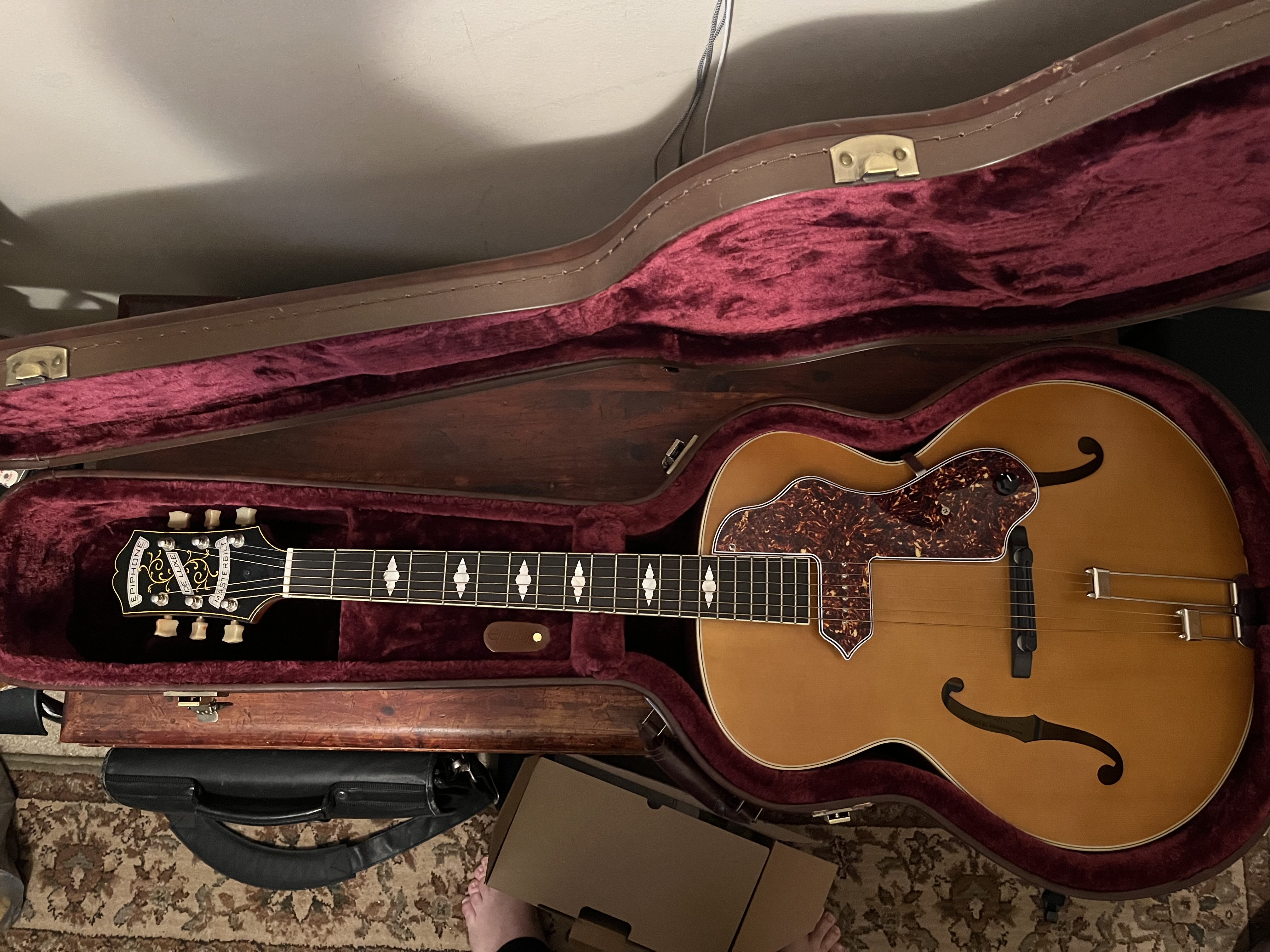 This guitar is a superb playing and sounding arch top with an added pickup built in to a McCarty style pick guard. It also has a bridge pickup with a separate output jack that I rarely use, It has an after market Frequensator style tailpiece, but the original will be in the hardshell case.