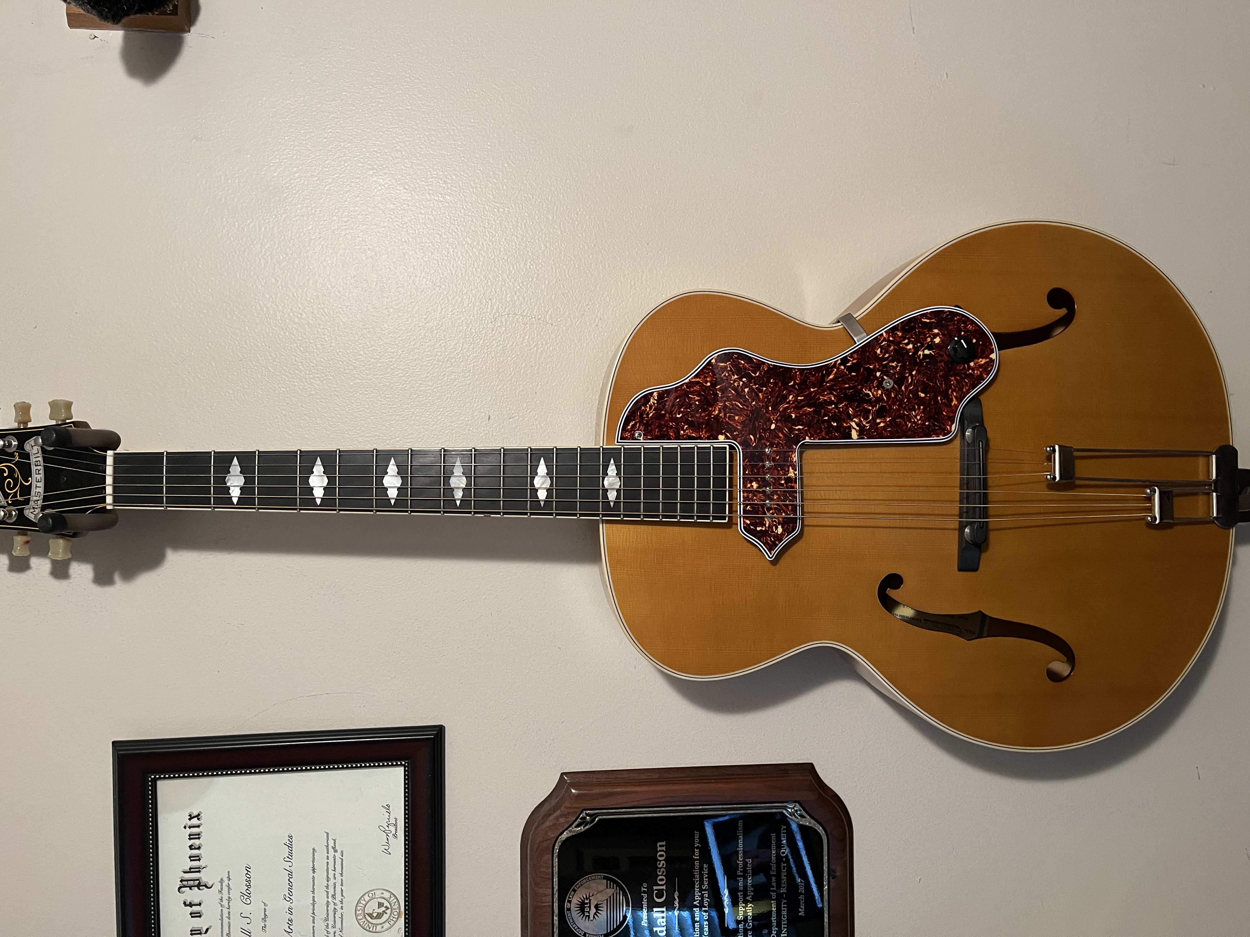 This guitar is a superb playing and sounding arch top with an added pickup built in to a McCarty style pick guard. It also has a bridge pickup with a separate output jack that I rarely use, It has an after market Frequensator style tailpiece, but the original will be in the hardshell case.