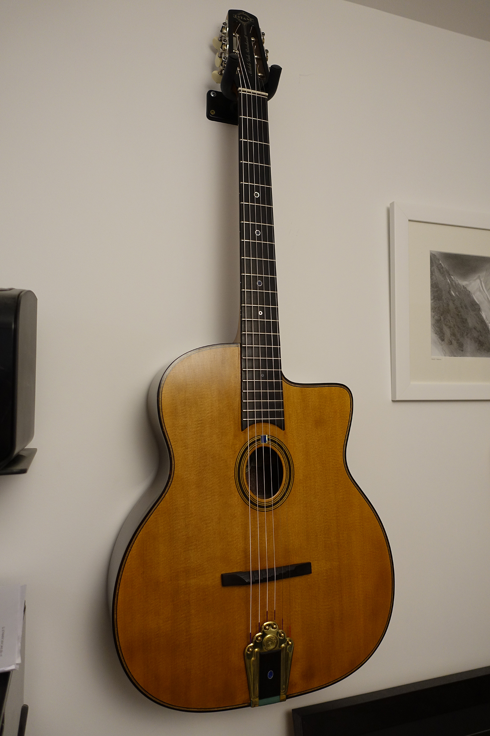 Hello folks, I've taken the very thick layer of lacquer off the top of my Gitane 310 and refinished it with a water-based shellac. I've done this to a few factory-made Gitanes and other guitars, and this had the thickest layer of lacquer of them all. Finished with a Killy Nonis tailpiece and restrung today. The guitar is instantly more responsive, resonant and just plain louder than it was. I'll let the guitar settle down a bit before tweaking the setup, but initial impressions are great. I recommend doing this modification to this sort of guitar if you feel happy wielding an orbital sander!
