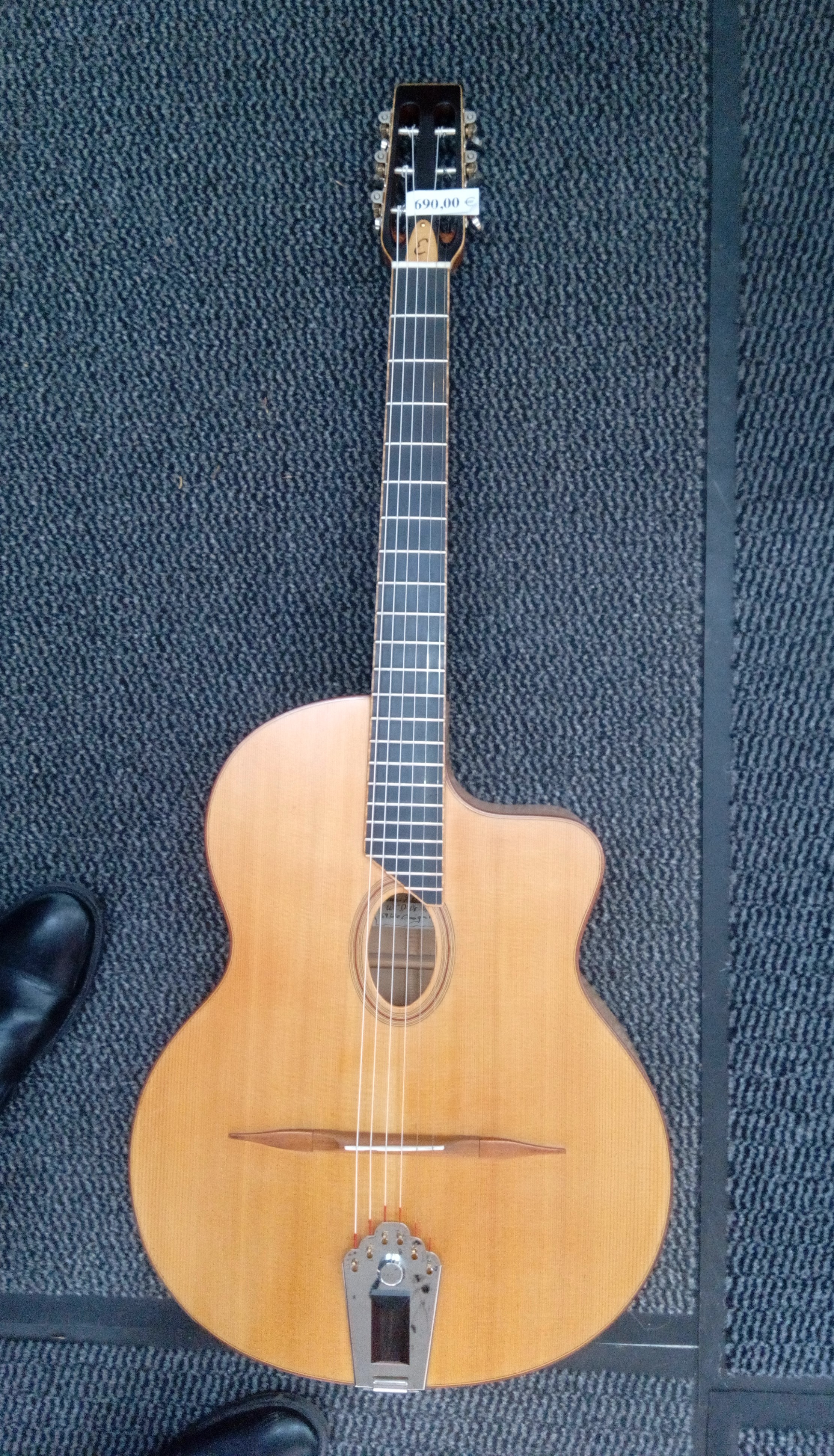 Plays very good, my hands loved it, the sound is light and cutting, a bit thin. This might be due to the cheap looking tailpiece (there is a Blueridge Gypsy guitar in the Rathmann shop with the same tailpiece); and I don't know what strings are on.