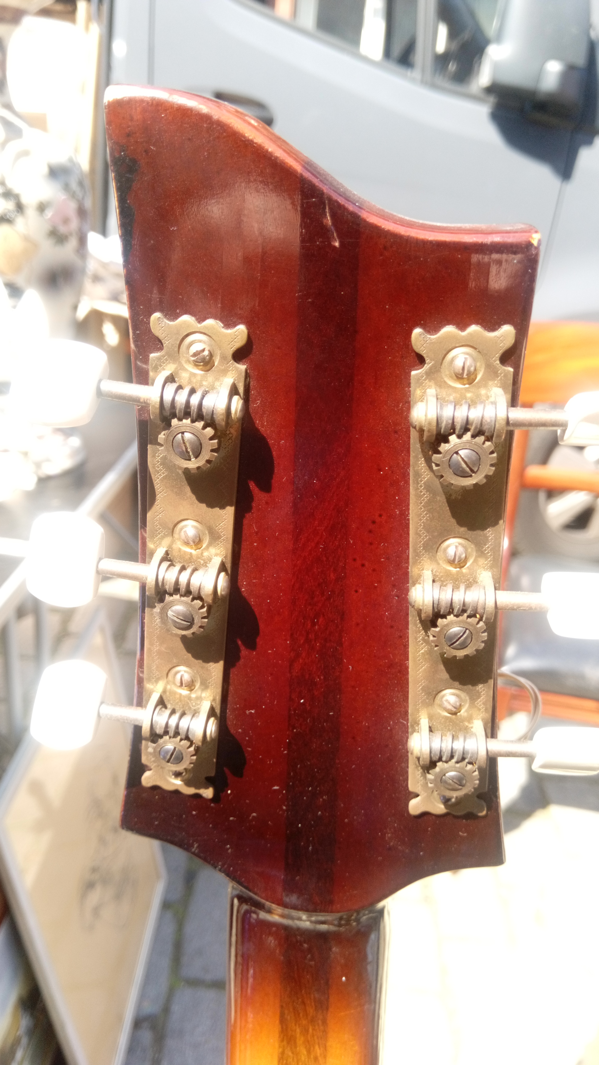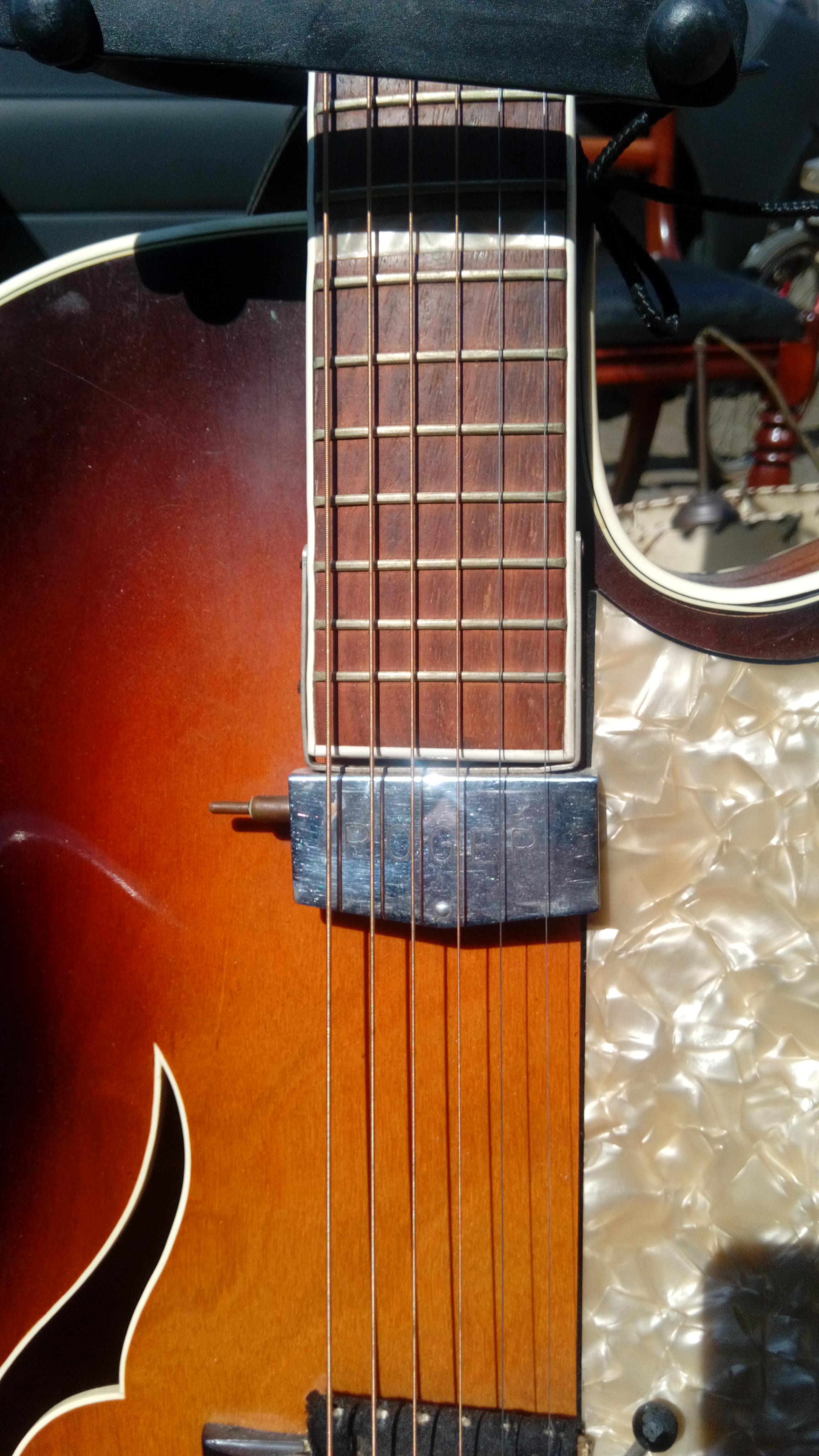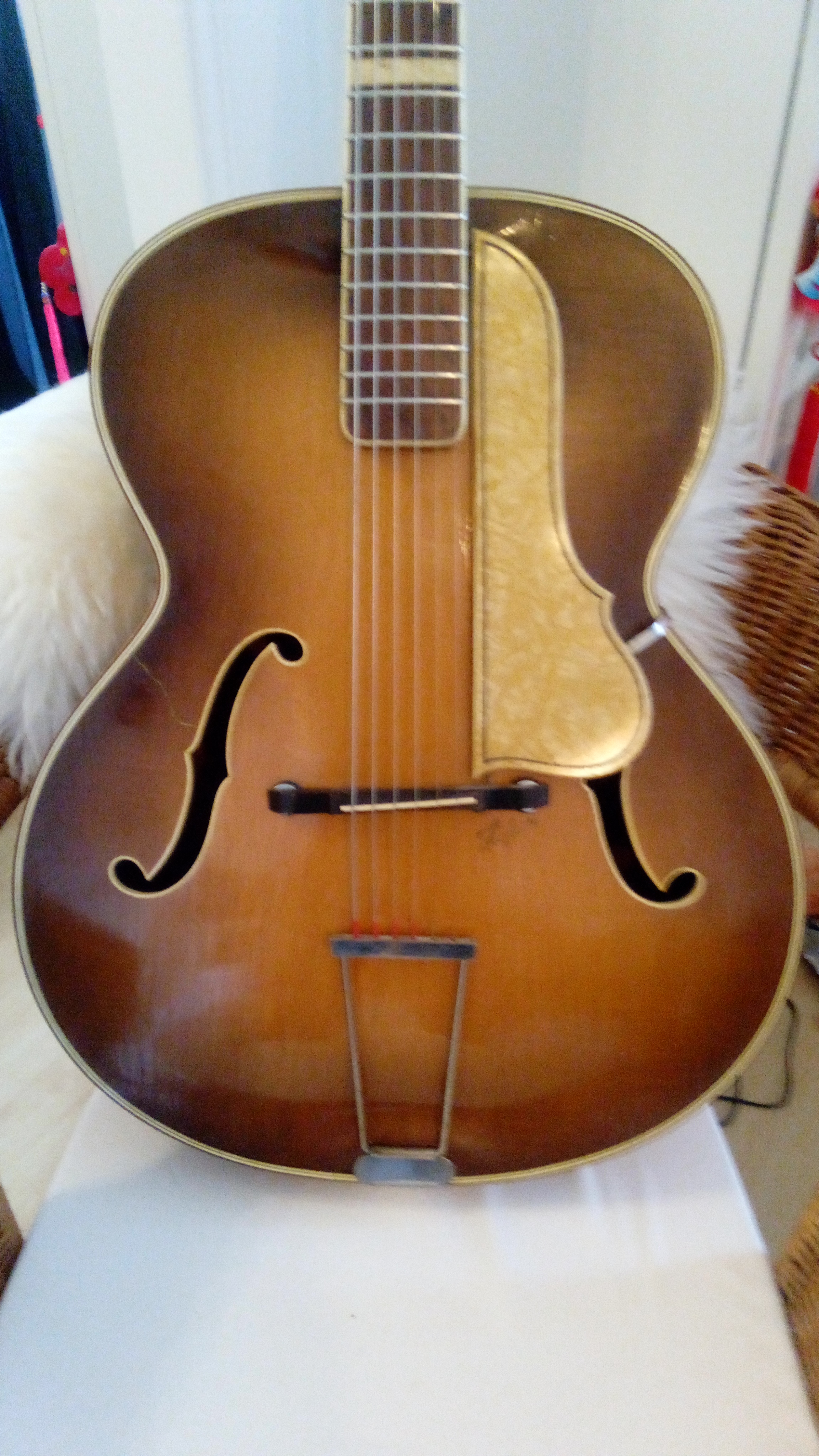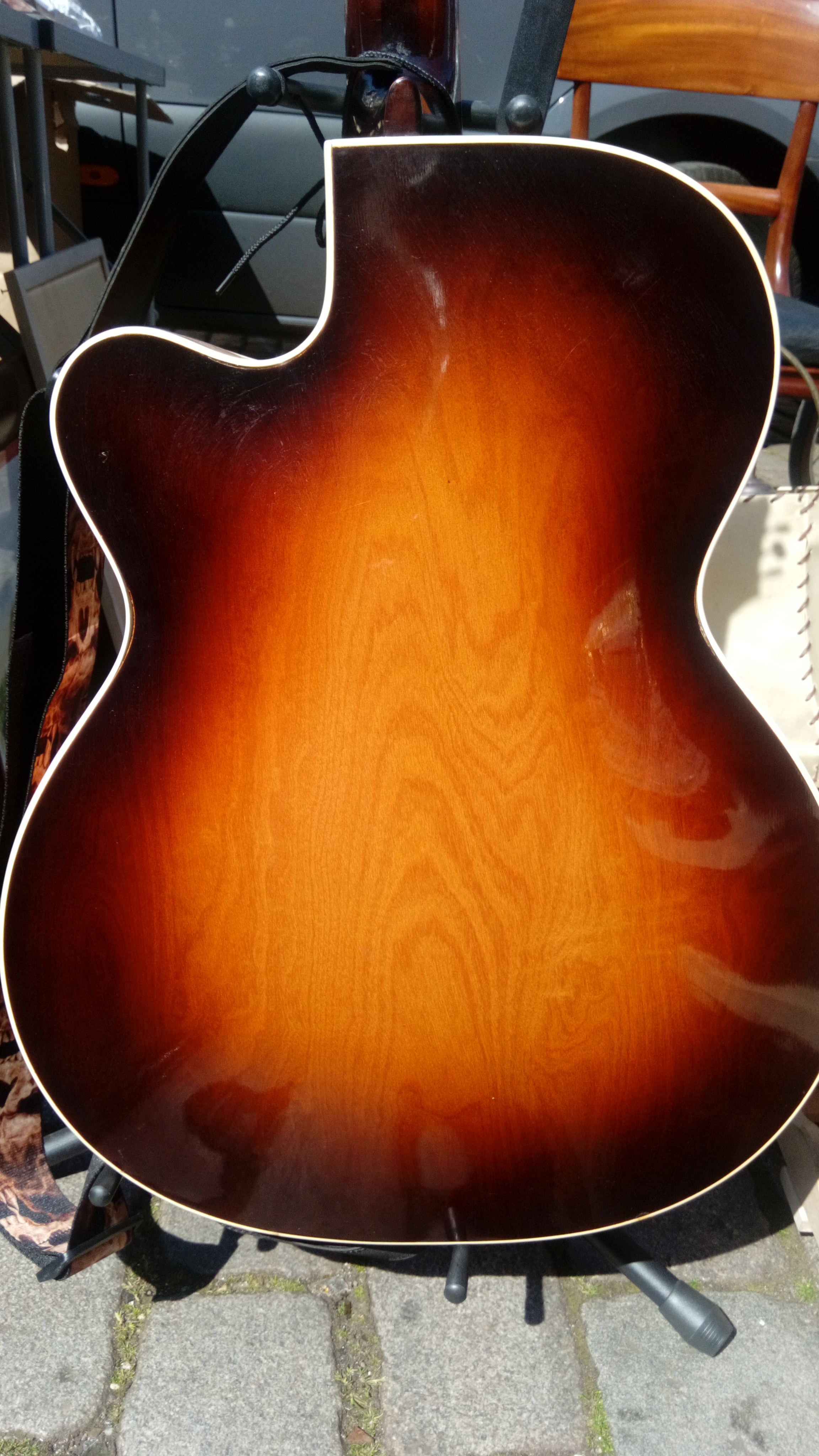 The seller wanted 400 €; I did not buy it (enough archtop guitars for the moment).The neck is quite straight. The guitar does not not sound good, which migth be related to the very old strings and mainlyto the strange plastic bridge.