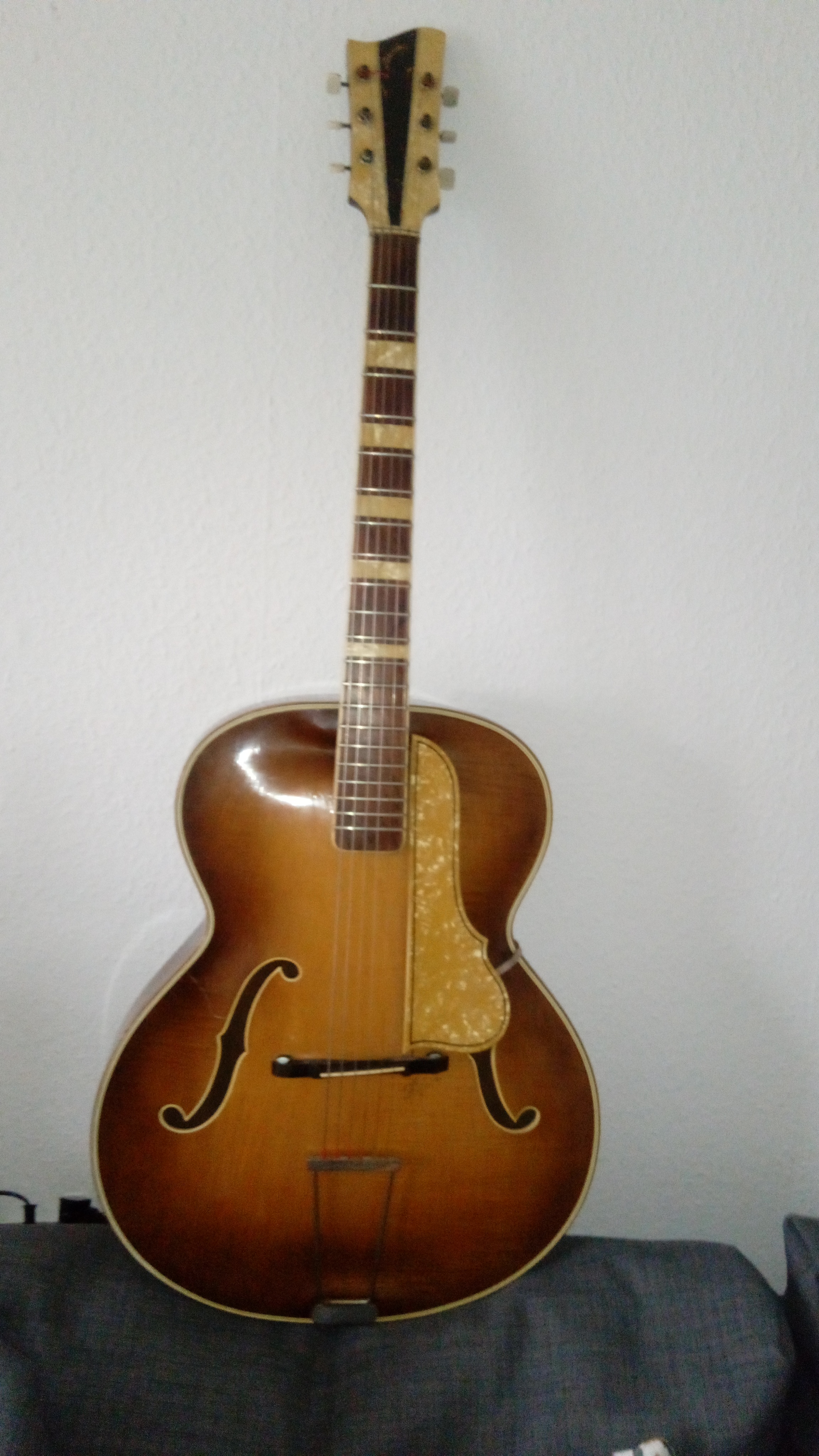 As for old german archtops, Sven Jungbeck has an old Höfner he plays in some of his videos. Here's one.Similar aesthetic to the Isana you posted. Mother of pearl pickguard and headstock veneer. Same script font for the company name written on the top of the guiter