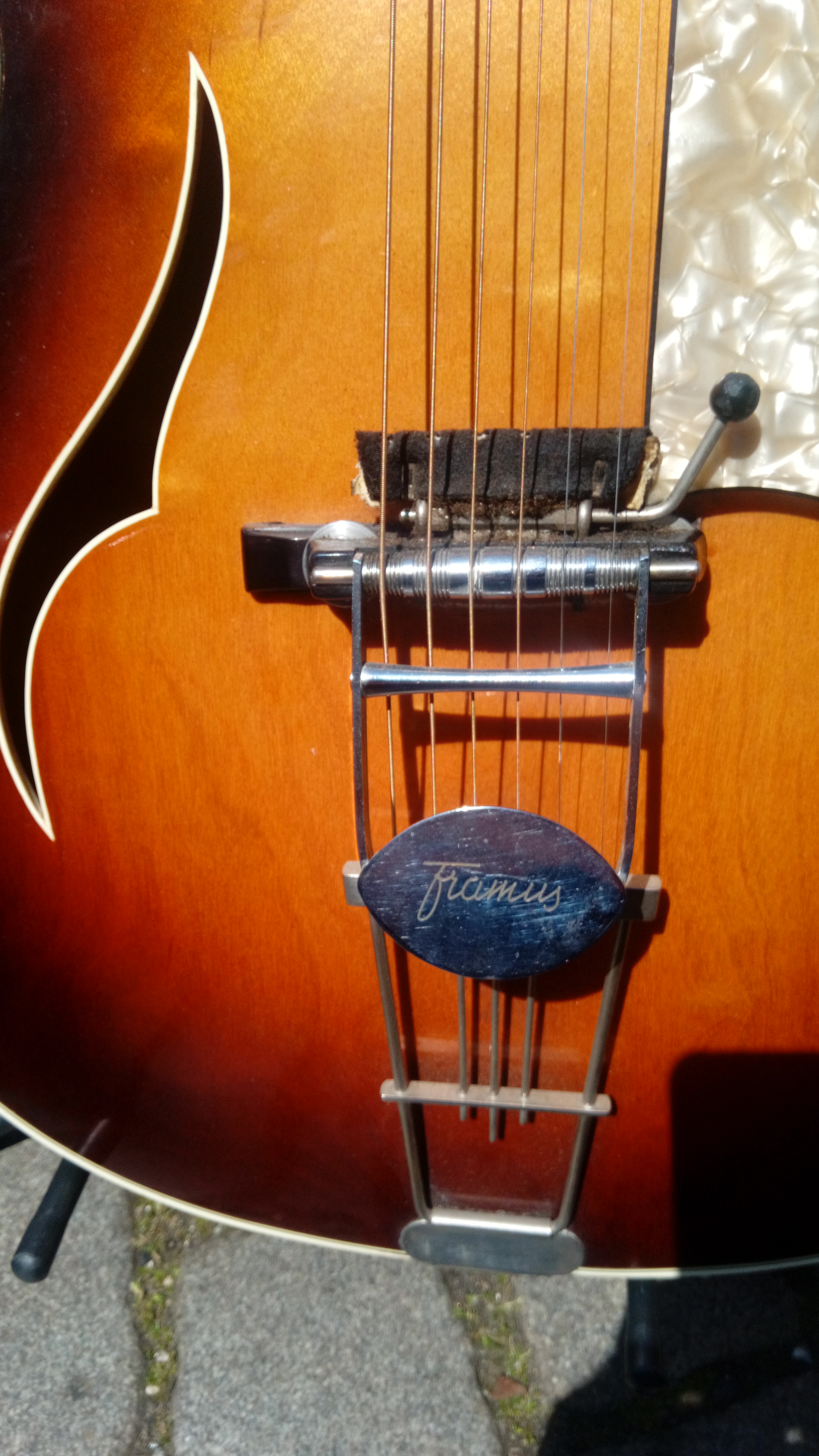 According to the seller it was built in 1956; tailpiece/damping system is Framus, pickup is Roger brand. She wanted 400 €; I did not buy it (enough archtop guitars for the moment). The neck is quite straight, the strings are very old. The guitar does not not sound good, which might be related to the strange plastic bridge.