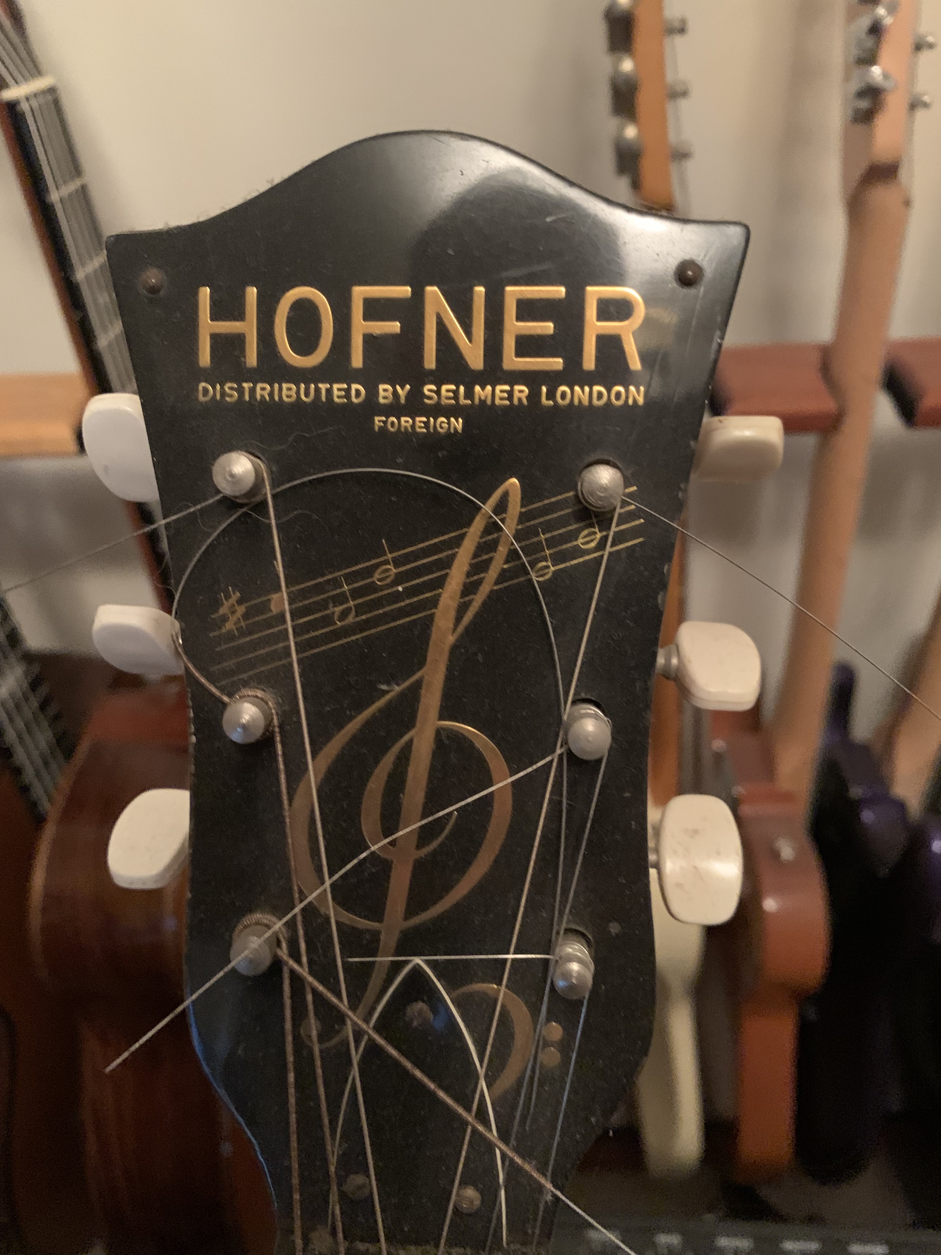I have two Hofners, a beautiful New President which I bought new about twenty years ago - and is my 'Sunday best' guitar - and a 1962 Senator: note the headstock on the Senator, probably the closest I'll ever get to a Selmer! The dots are a G6/9 arp.
