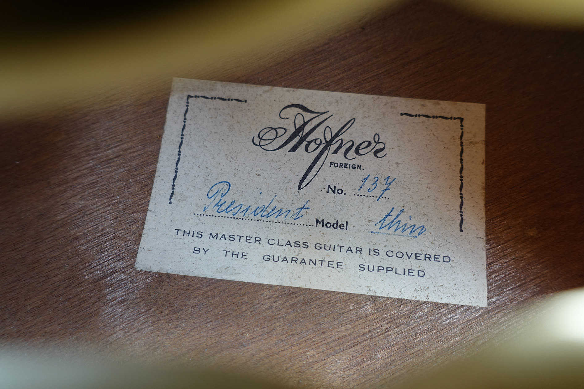 Here's my 1959 Hofner President, number 137. John Le Voi did a neck reset and made a nice new bridge for it about fifteen years ago. The pickups are a bit loose and vibrate, but I've had rubber bands around them which works! It lives in a nice Hiscox case, but here is the original case. The guitar belonged to my grandad Walter 'Jumbo' Reeves - he played double bass and guitar in local jazz bands in Devon after the war.