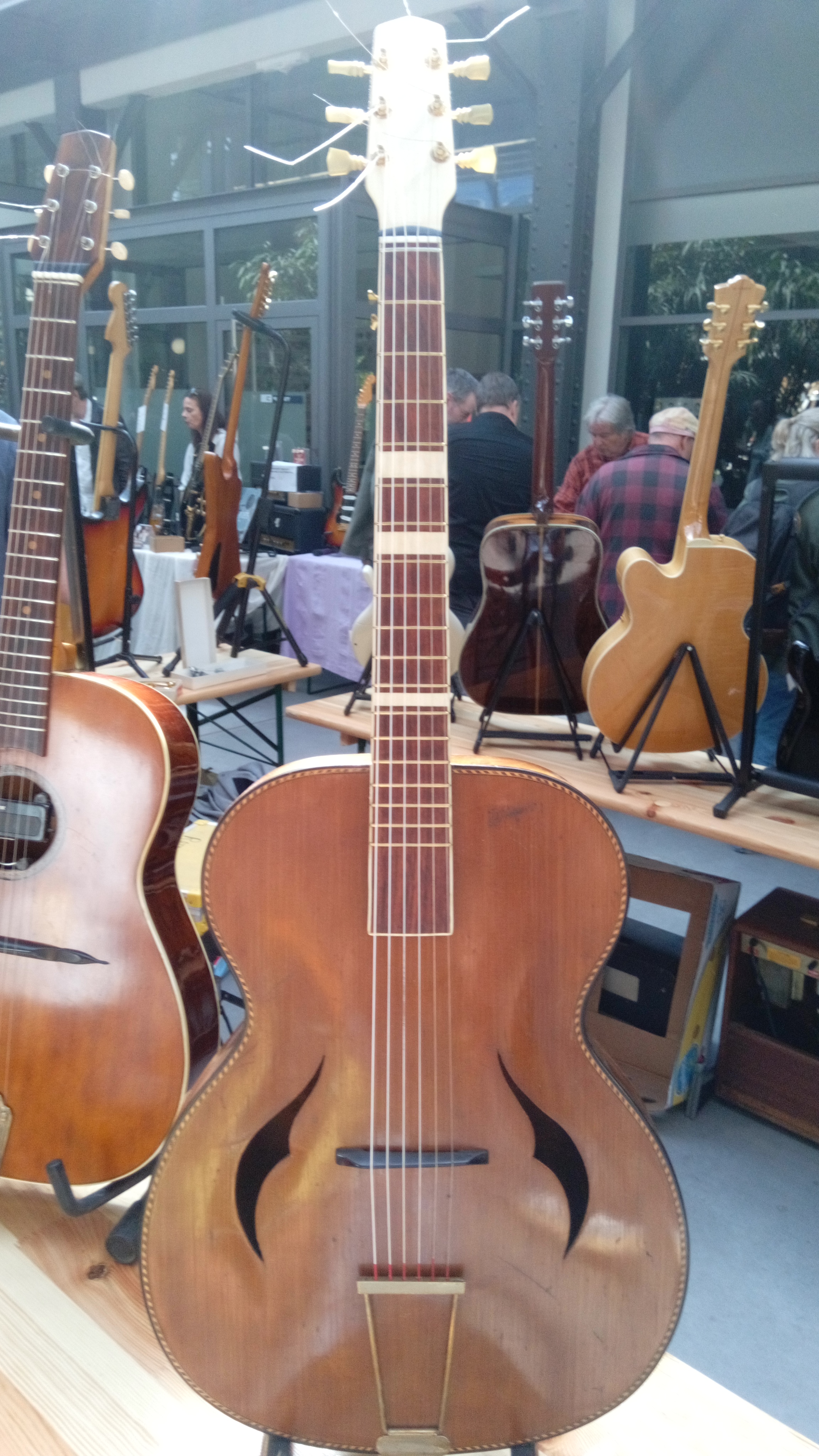 The wood is maple. The pickup is a Rellog that is integrated into the floating end of the fretboard, the pickup jack has been rebuilt from vintage two-pole at the back of the neck joint to a modern plug at the lower side, the volume control knob on the pickguard is new. The neck width at the nut is rather narrow 41 mm. The guy calls the sound of the guitar "nasal" and presumes this might be supported by the resonance of the tailpiece, adding a "tinny" component as required for Django's music.
