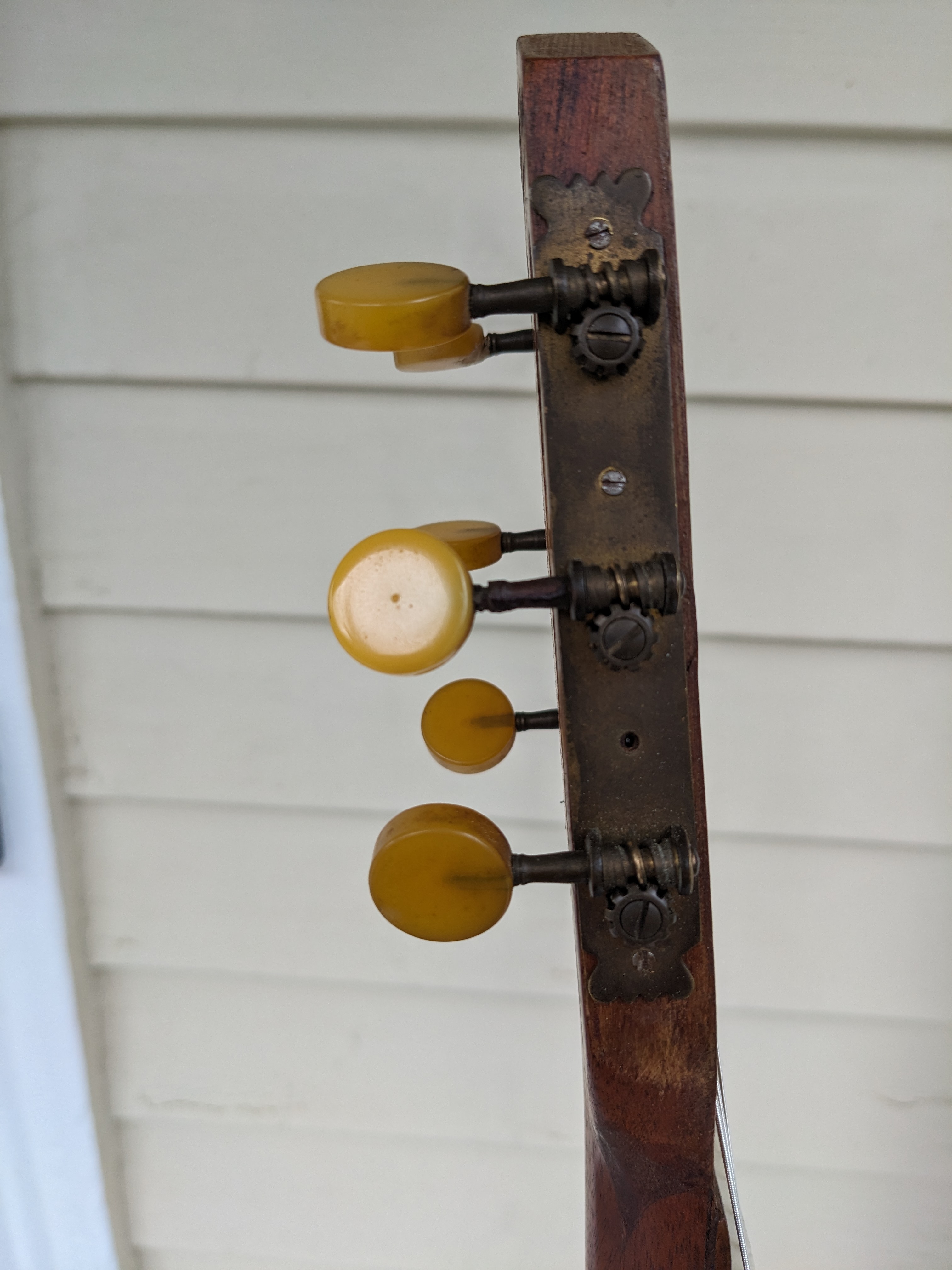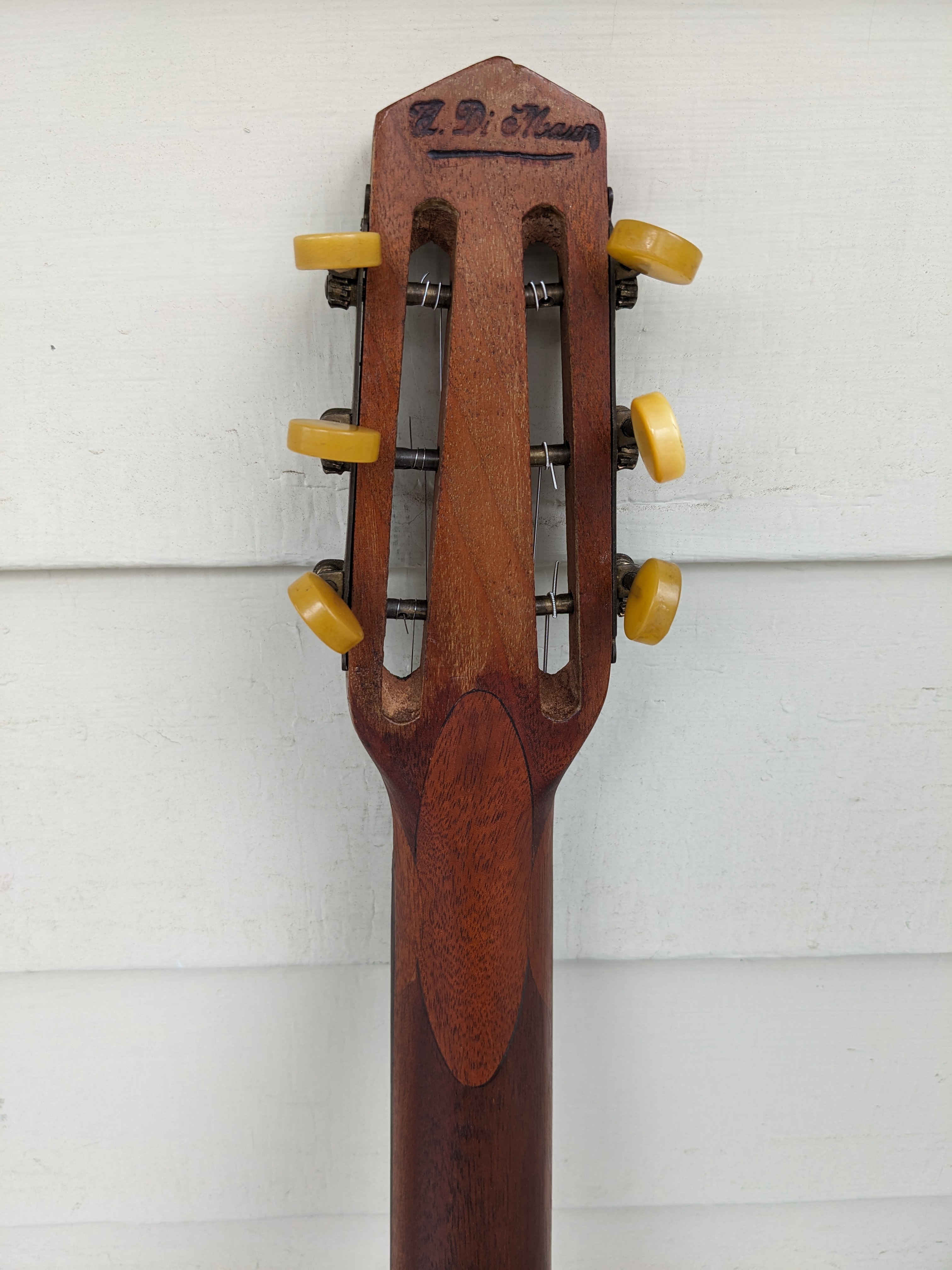It doesn’t make any real structural or sonic difference but it’s interesting so see the “string scoops” routed (or filed) into the *back* of the headstock. Routing string scoops on the headstock face is typically done with a second router template (or could be files) but why would anyone do that on the back of the headstock? Maybe this was an apprentice instrument? Top binding and rosette look great though (are those original?)