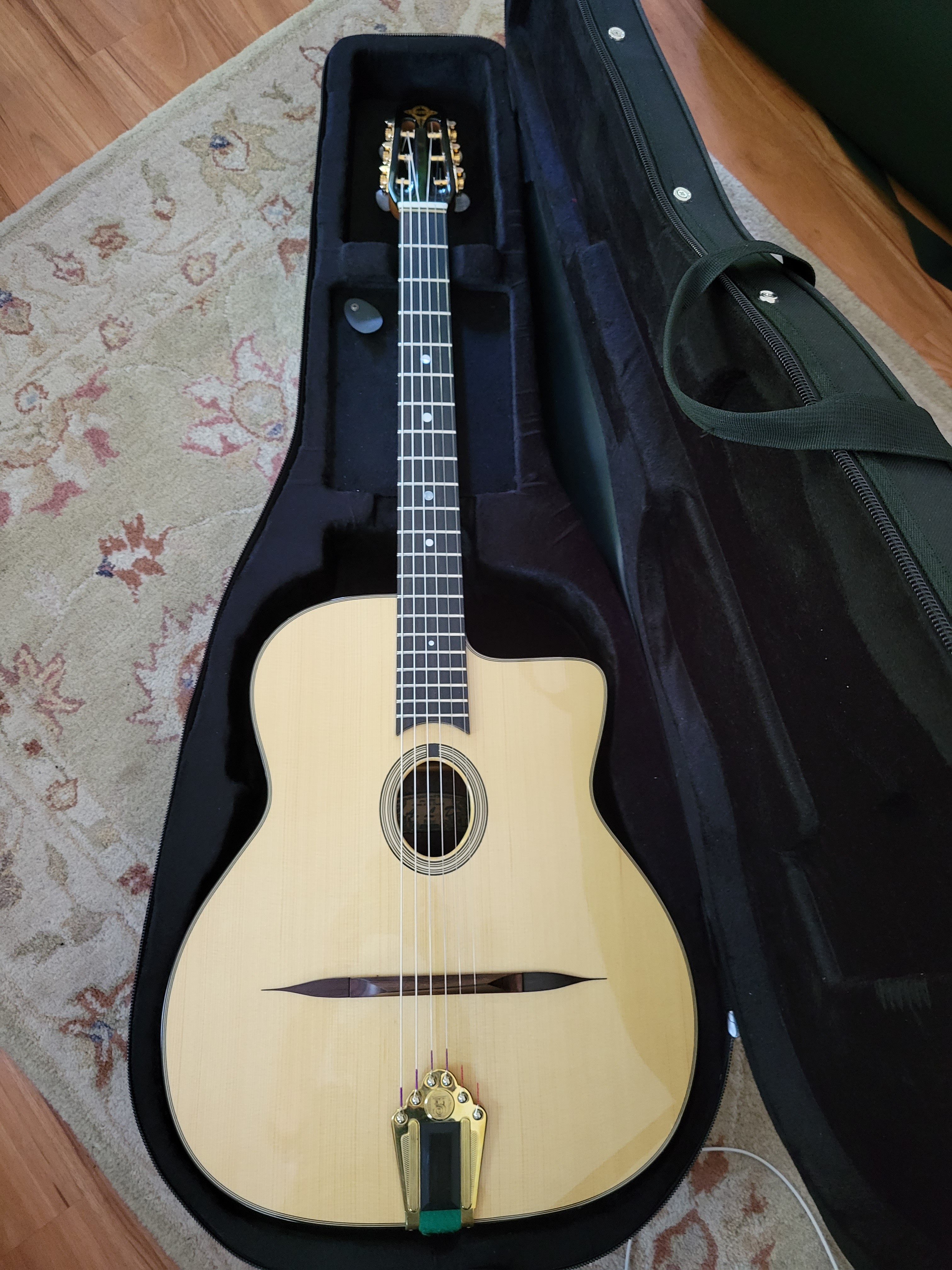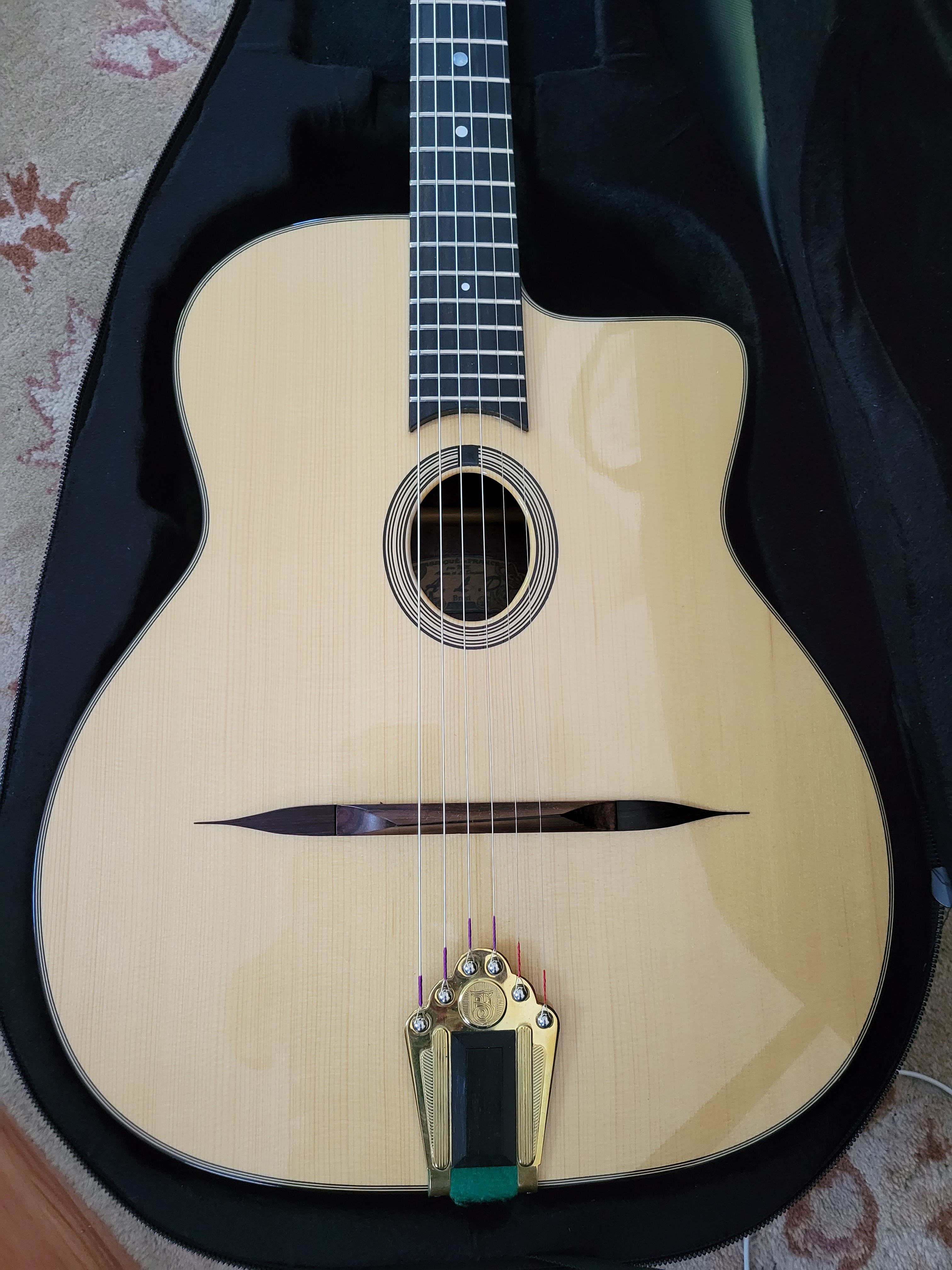 2022 ALD Originale. Selmer copy made in France. Nice powerful crunchy rhythm and bold single note leads with the distinct ALD tone loved by many, including Angelo Debarre. Owned for 6 months in a smoke-free home. Never gigged with this one. Comes with case.