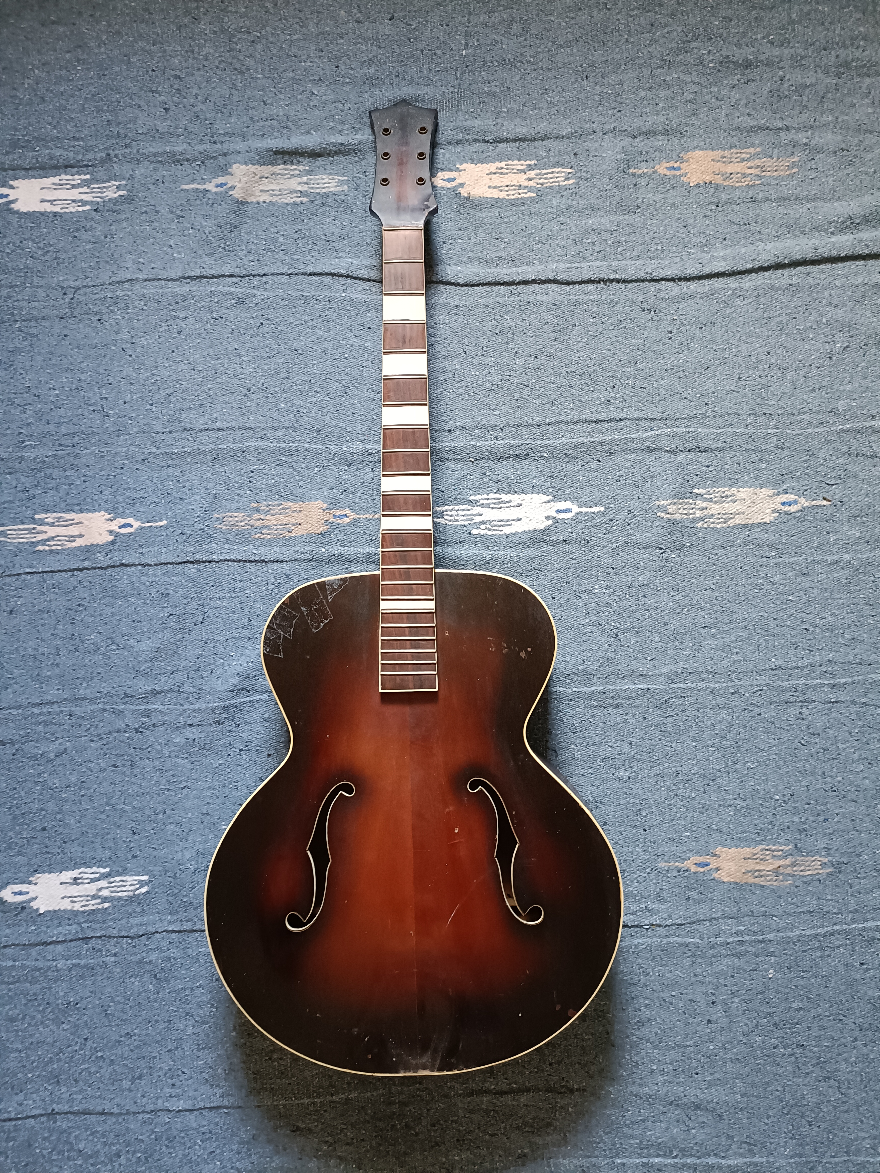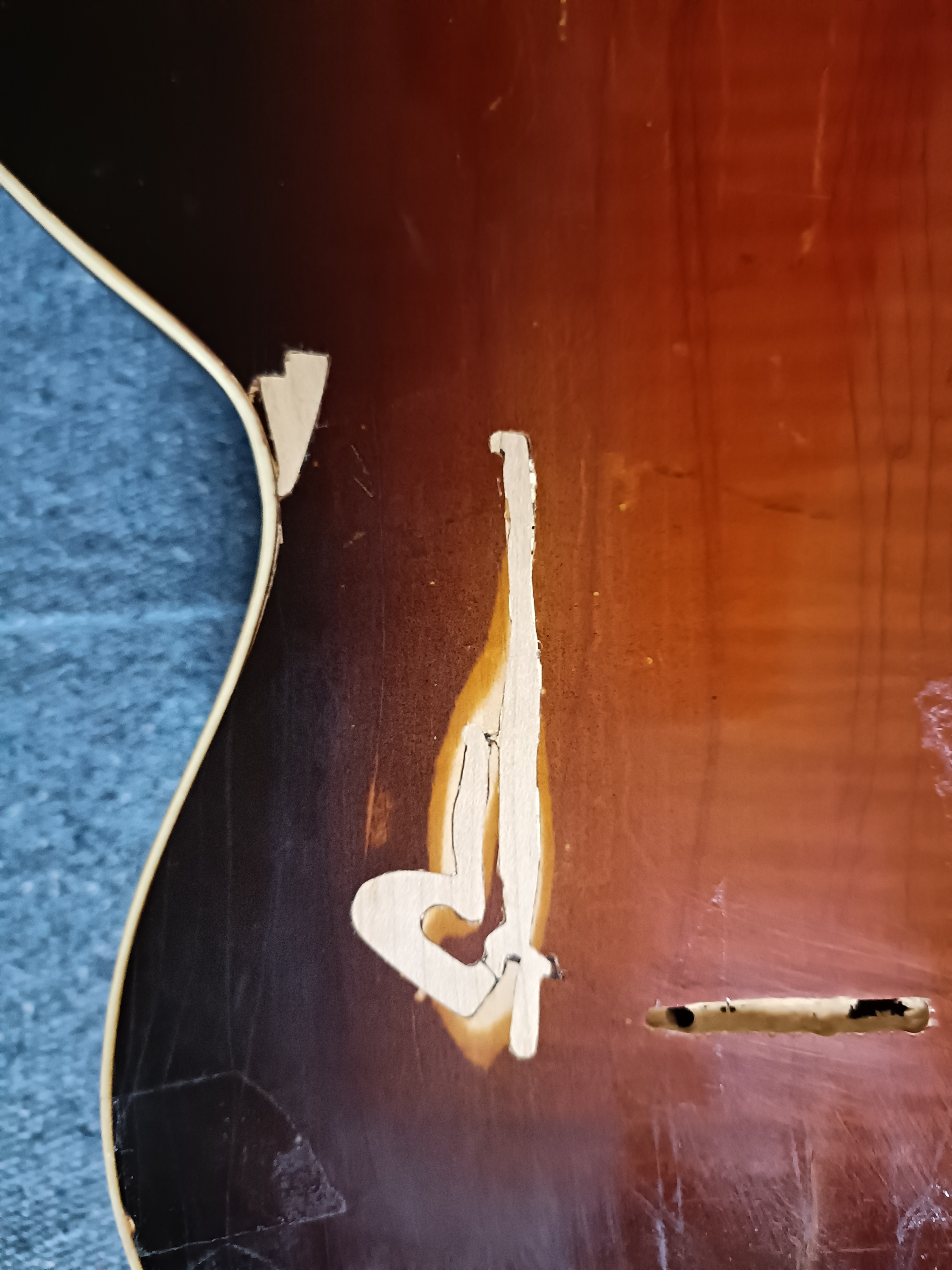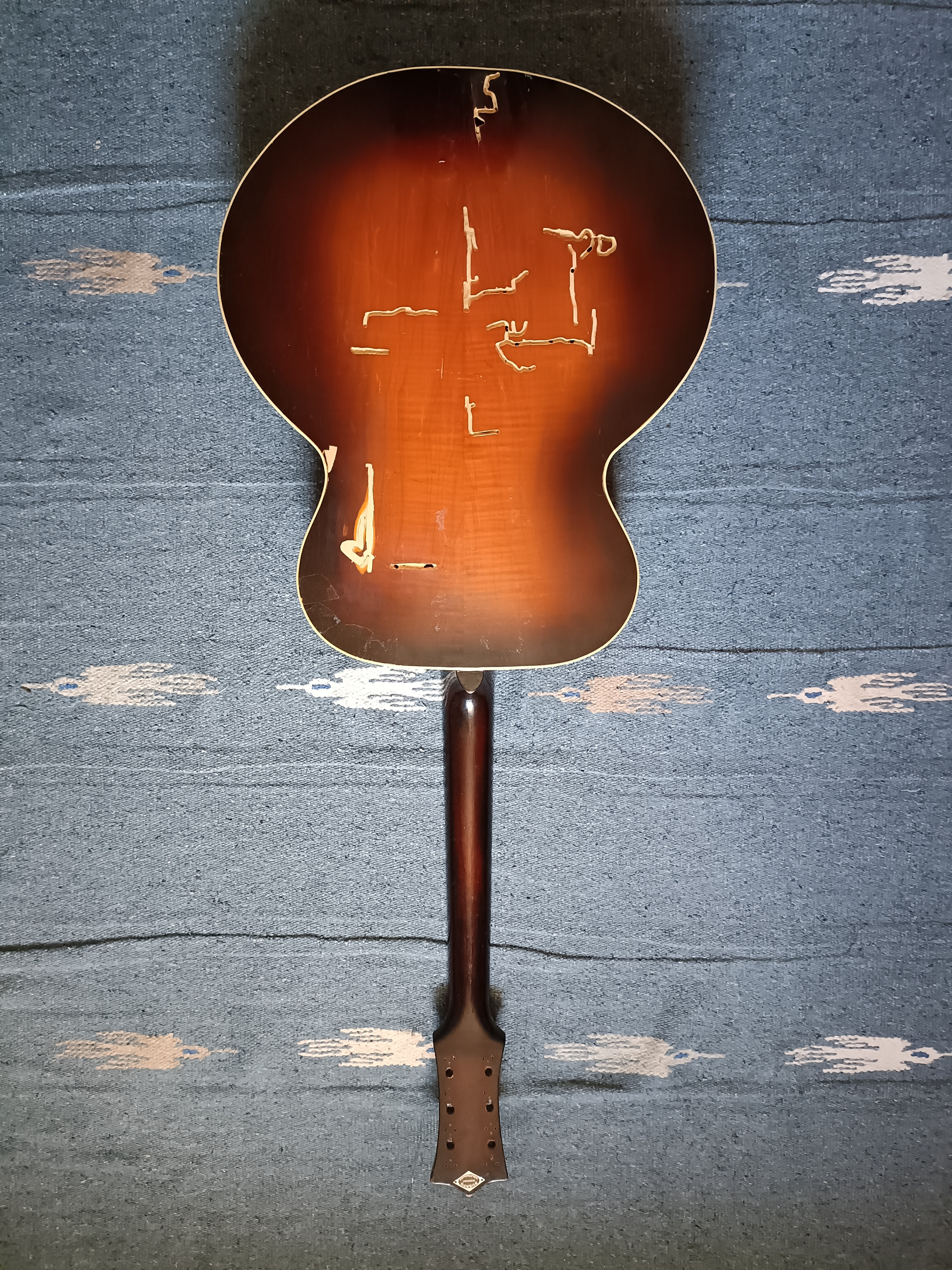 I have nothing but admiration and gratitude to those other members who take some of these old project guitars that look hopeless and return them to playing condition. How does this guitar sound by tapping on it? Good resonance? It is indeed unfortunate for the woodworm damage. Makes me wonder if it was just hanging in a garage or attic or some other inhospitable place for a guitar to allow that to happen. It does seem to be a little more cosmetic than structural so hopefully that is ok. How about the upper bout though? Looks like it had a significant crack that has the start of a repair (and a lot of adhesive tape residue!)