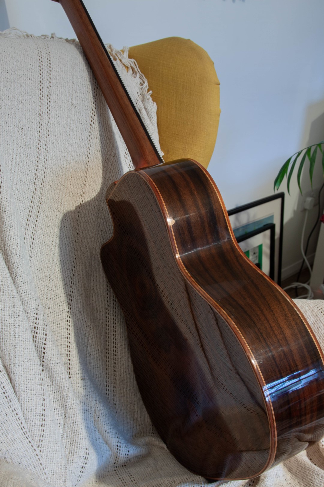 Hmmm, interesting! The cutaway is not perpendicular to the neck, but more reminds me of a Richwood/SX. The back and sides look like dark stained mahogany, not rosewood. The heel looks like a Richwood. The top looks very flat. The bridge and moustachios are one piece (unusual but easily fixed with a Japanese saw!). The neck is not walnut like Gallato uses. Maybe someone else here can shed some light on it! How does it sound?