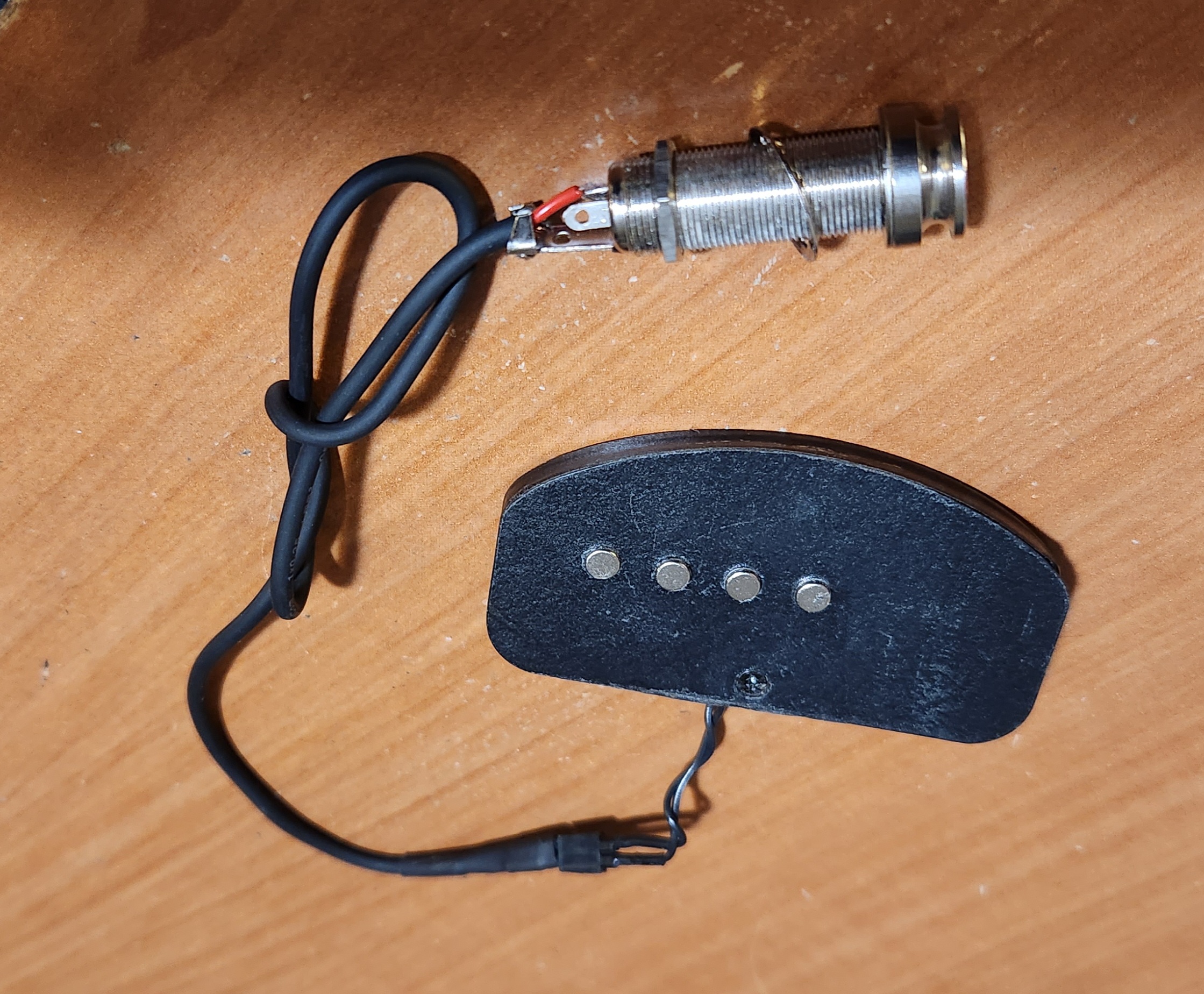 Here is a good-sounding magnetic pickup for gypsy jazz guitars made by geronimo mateos a builder of gypsy jazz guitars. The native configuration is for the pickup to be clipped onto the Oval sound hole with the cable run internally to the included end pin jack. Depending on the thickness of your guitars top the pickup may fit snuggly or may need a bit of putty on the side (not under) of the pickup for added security. No soldering is required just a hole for the jack to pass thru the guitar.
