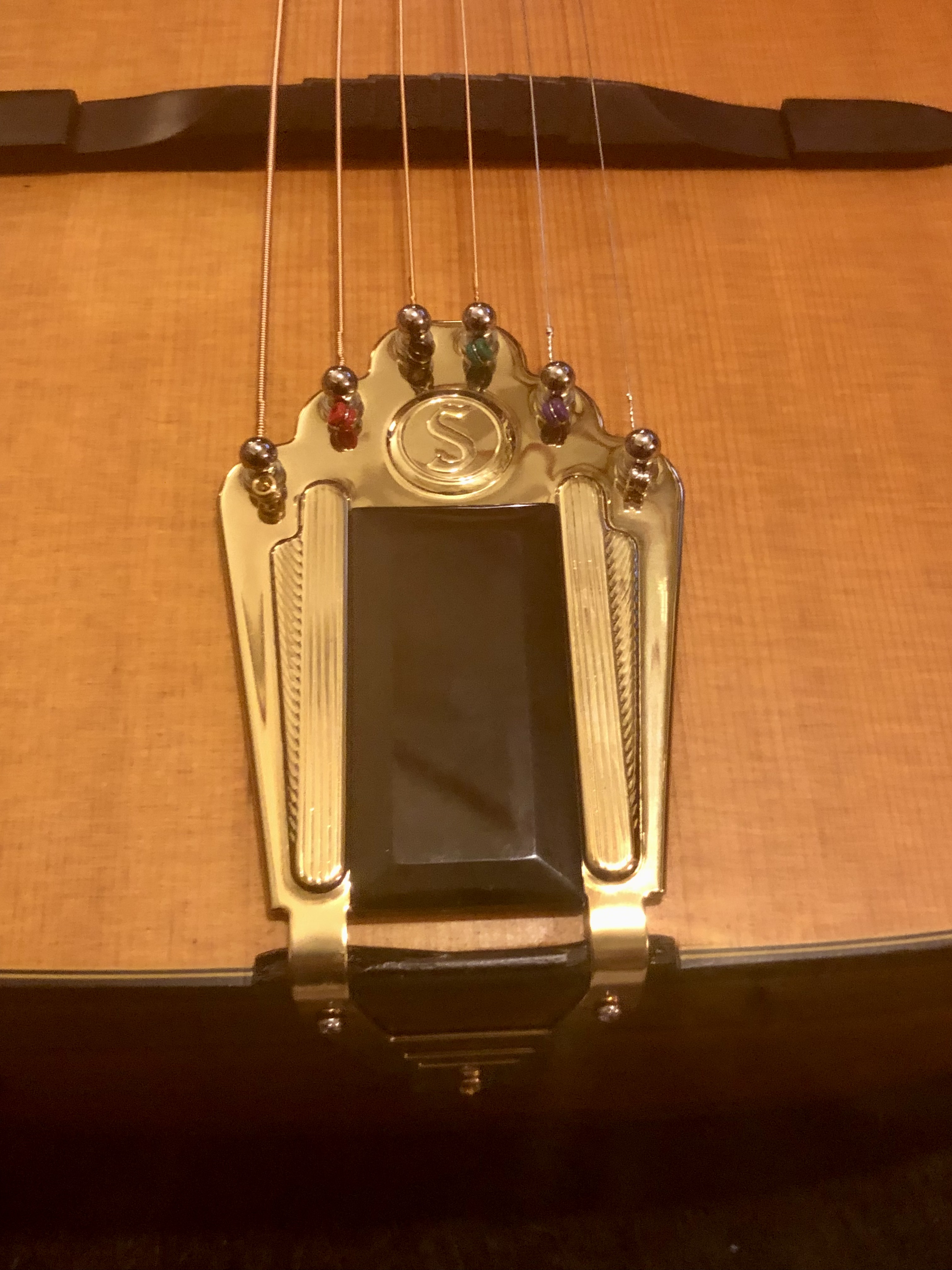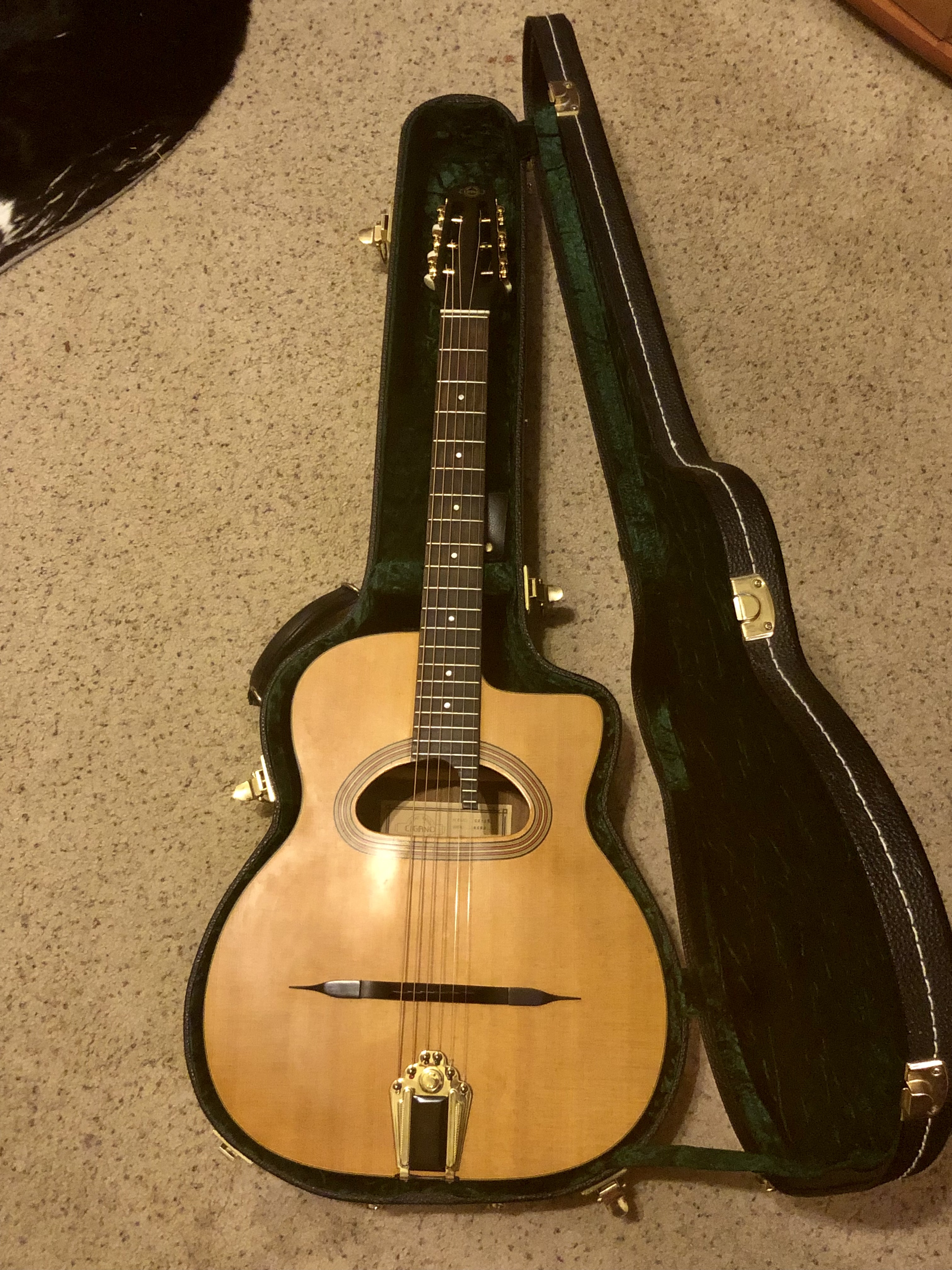 Great condition Gypsy Jazz style acoustic guitar for sale. D-shaped sound hole gives it a deep bass and loud volume. Has mahogany sides and neck, rosewood fingerboard and compensated mustache bridge, just restrung with D’addario coated phosphor bronze string. Plays easy and sounds great.