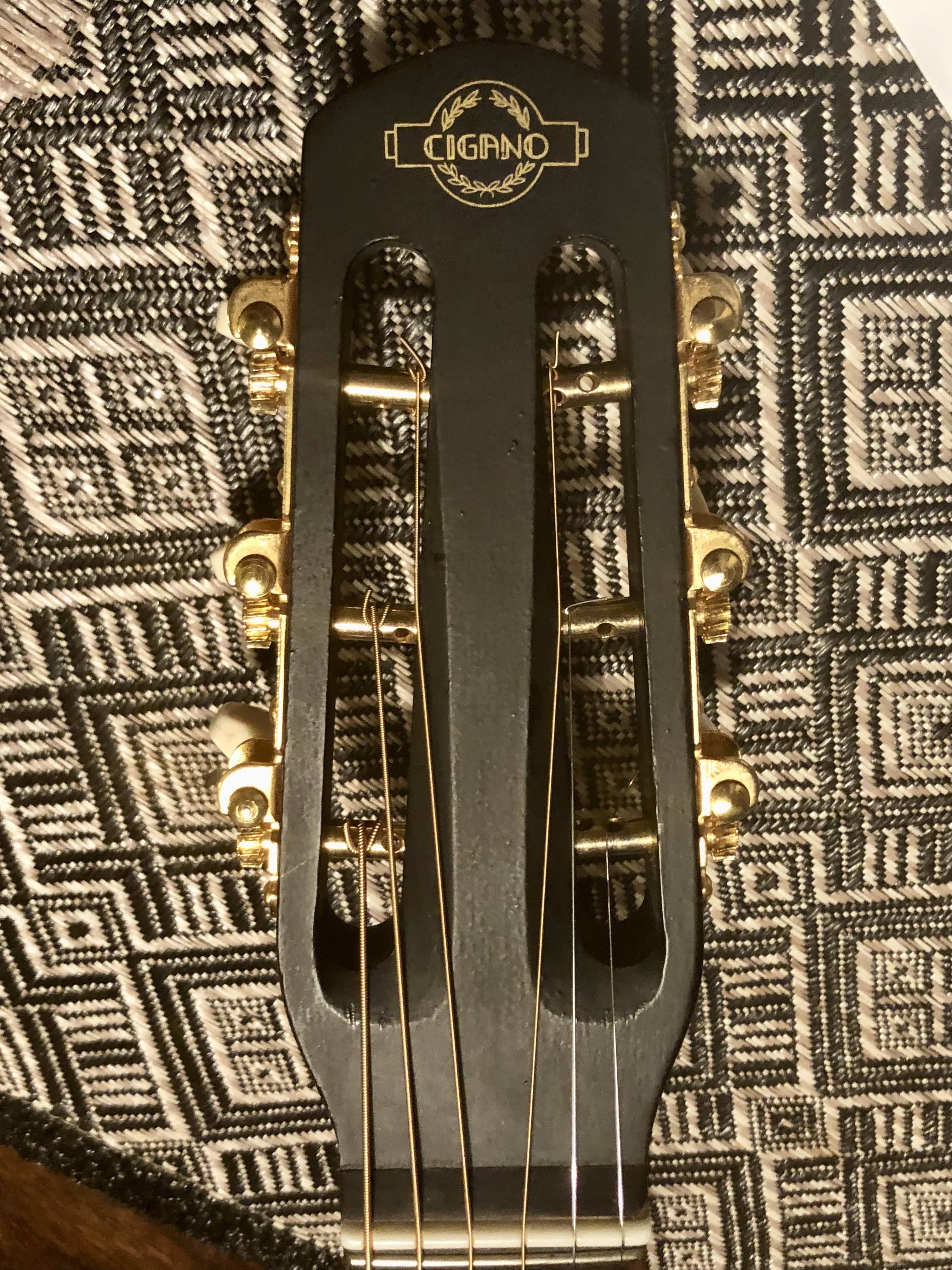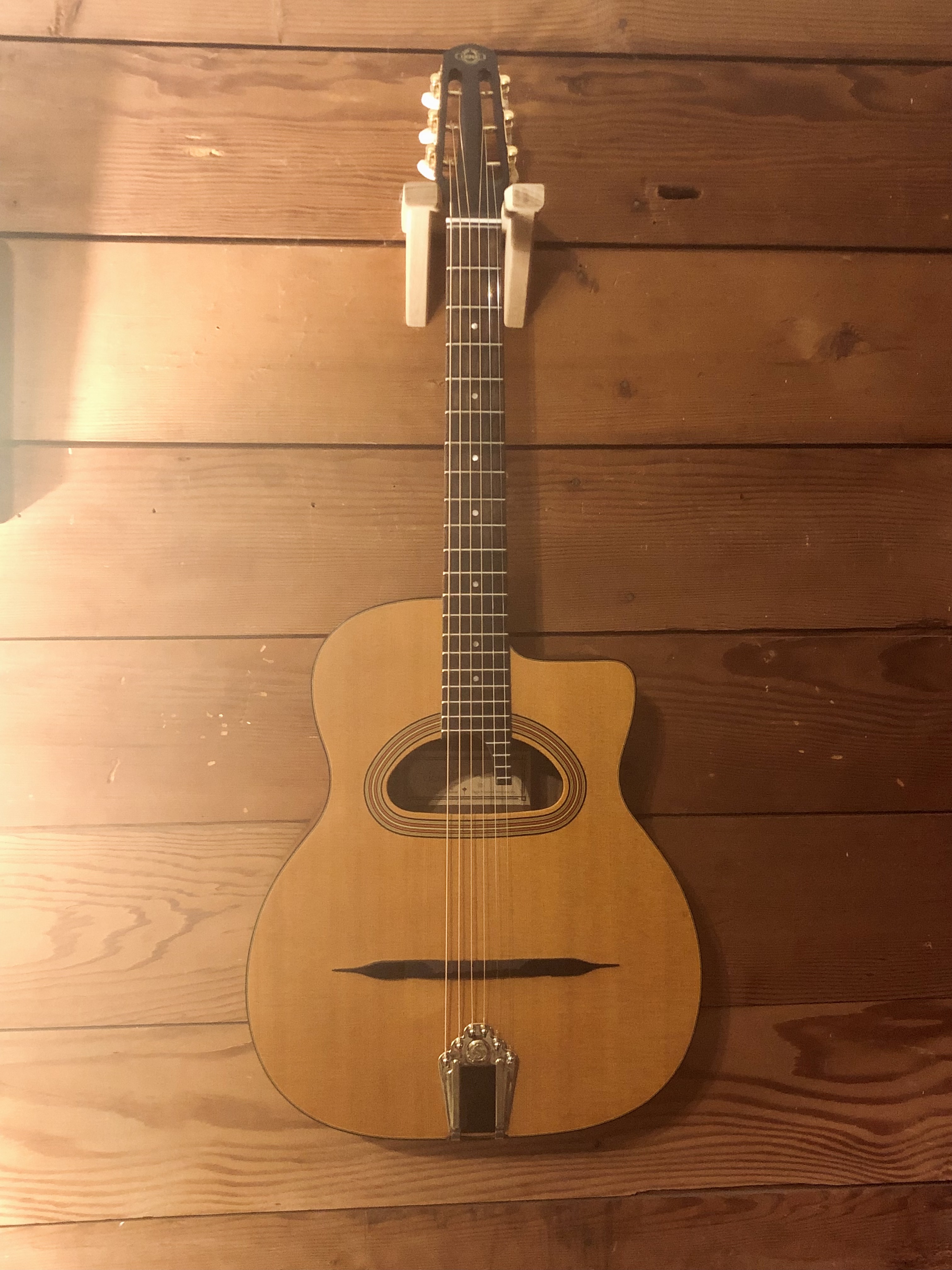 Great condition Gypsy Jazz style acoustic guitar for sale. D-shaped sound hole gives it a deep bass and loud volume. Has mahogany sides and neck, rosewood fingerboard and compensated mustache bridge, just restrung with D’addario coated phosphor bronze string. Plays easy and sounds great.