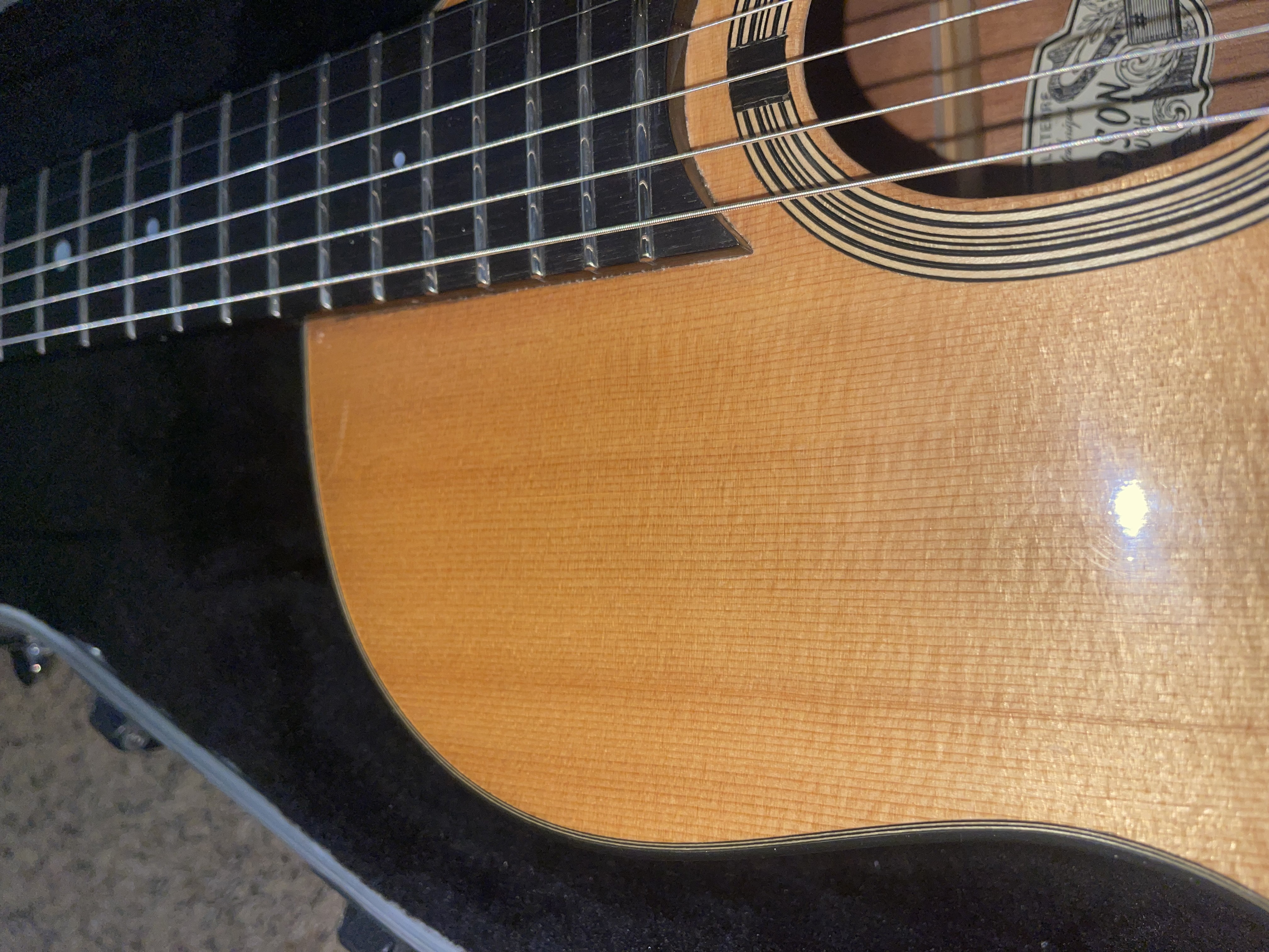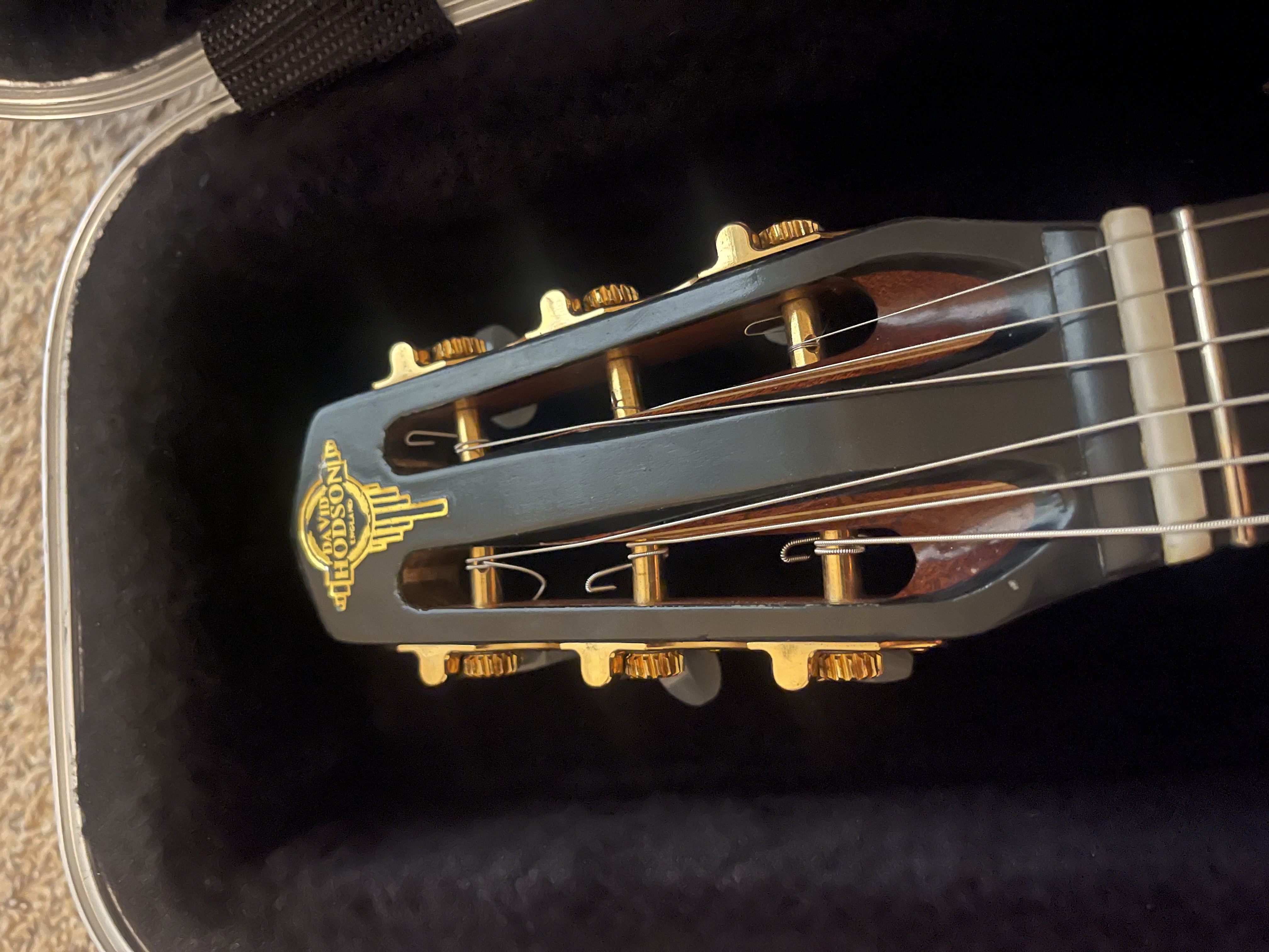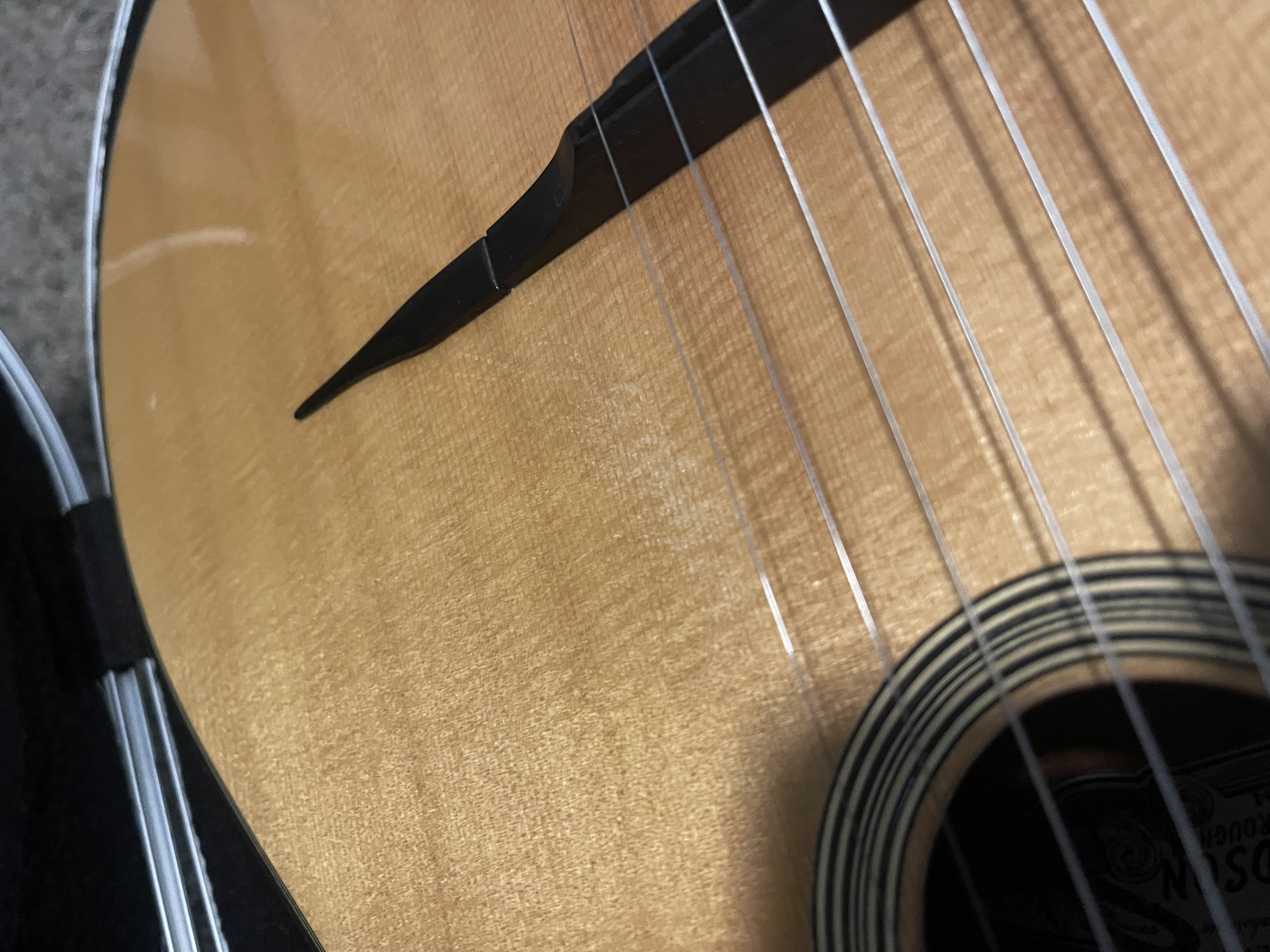 2004 D.J. Hodson made Selmer style petite bouche. Spruce top, figured Indian rosewood back, Indian rosewood sides. Laminate back and sides. Ebony Fretboard. No truss rod, 0 fret, 1-3/4” at the nut. Slight picking marks and a couple of dings here and there that I’ve pictured to the best of my ability. There is a slight crack on the right side of the fretboard that I have pictured. I would like to have gotten it fixed, but unfortunately due to the climate I live in I don’t think I can justify keeping a guitar with such a thin top. This has not caused any issues with sound or projection. Always kept in the case in a humidity controlled environment when not being played. It really does sound and play fantastic. I brought it to a luthier in October to have the frets crowned, leveled, and polished. He also humidified it and installed 1-2 shims in the bridge to raise the action. I don’t recall off the top of my head how high the action is, but I can send you a reference picture if you would like. Comes with lots of case candy and will have a refilled Oasis humidifier in the sound hole for transport. I’m asking for $1200+$120 for the shipping.
