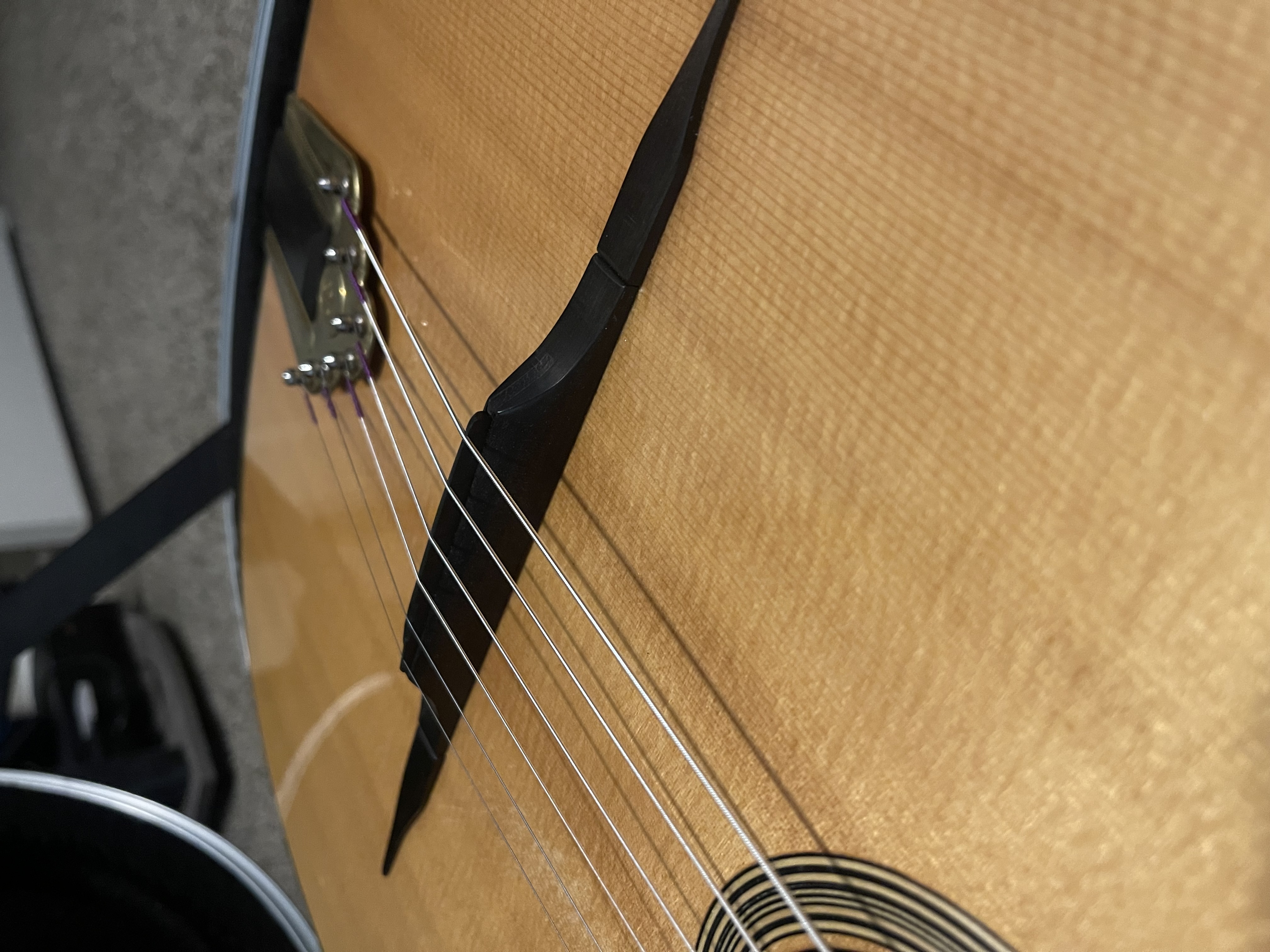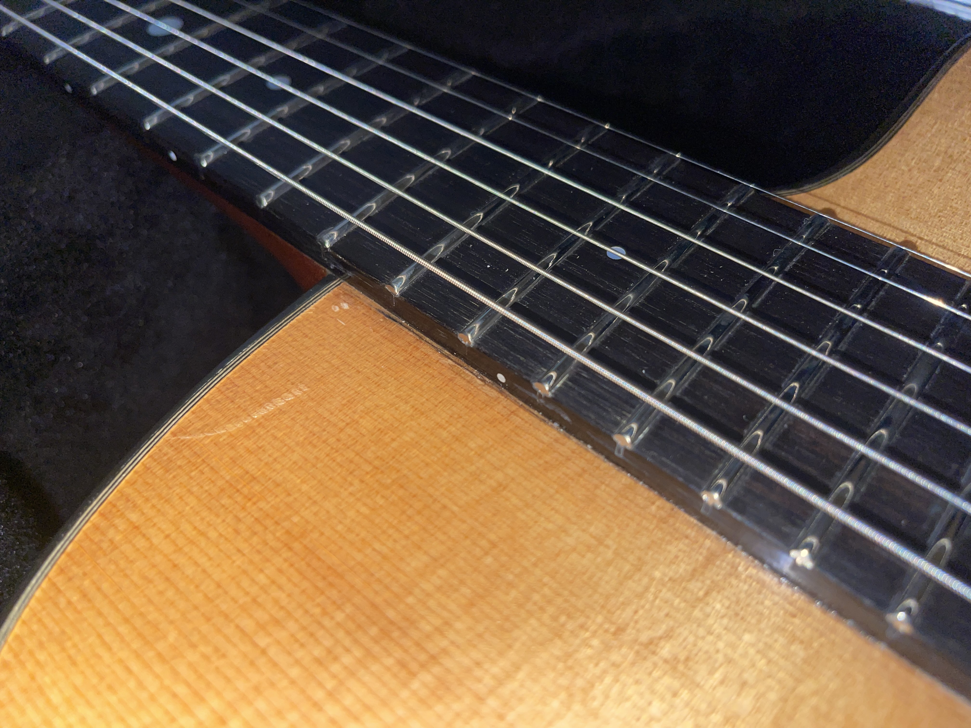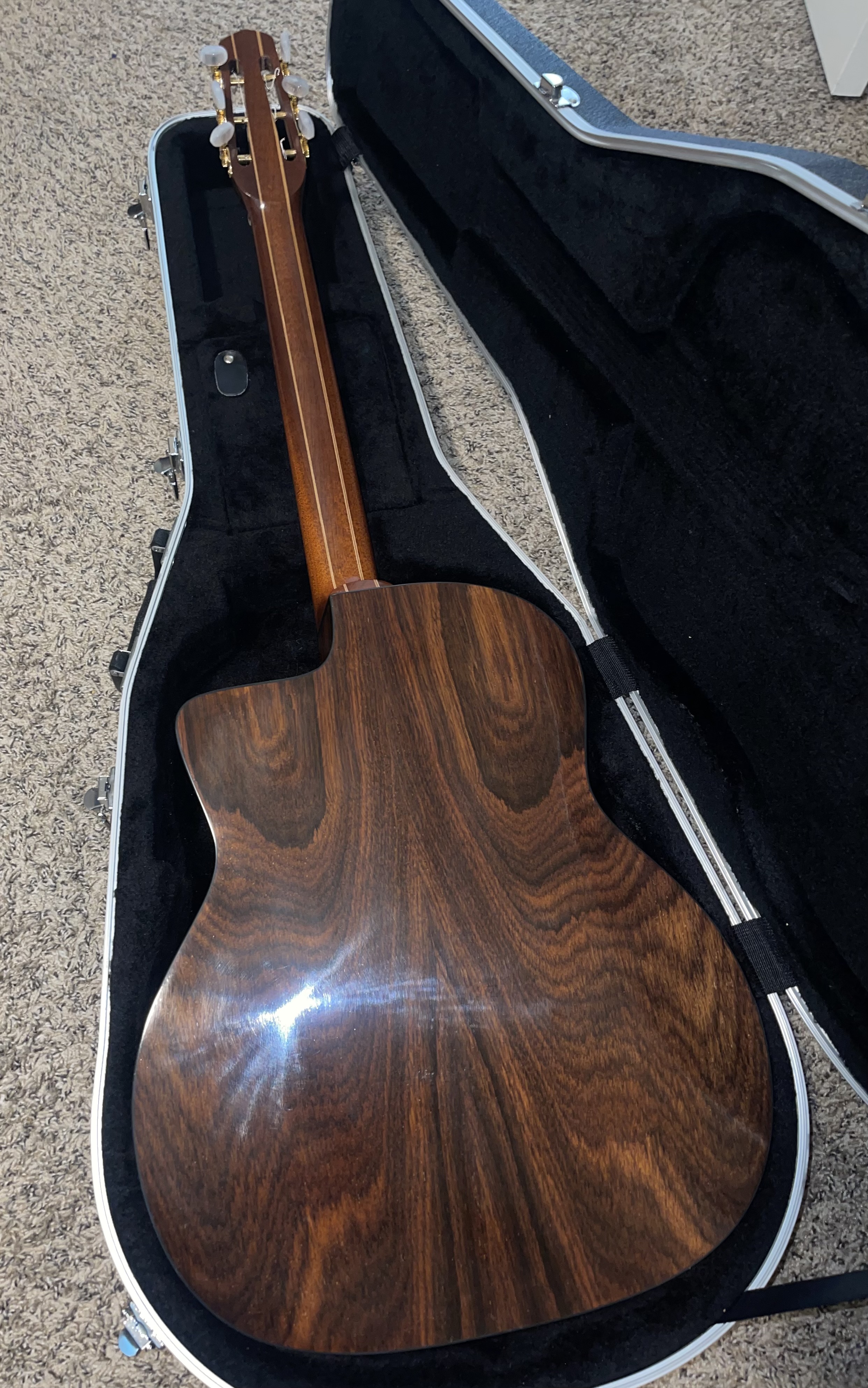 2004 D.J. Hodson made Selmer style petite bouche. Spruce top, figured Indian rosewood back, Indian rosewood sides. Laminate back and sides. Ebony Fretboard. No truss rod, 0 fret, 1-3/4” at the nut. Slight picking marks and a couple of dings here and there that I’ve pictured to the best of my ability. There is a slight crack on the right side of the fretboard that I have pictured. I would like to have gotten it fixed, but unfortunately due to the climate I live in I don’t think I can justify keeping a guitar with such a thin top. This has not caused any issues with sound or projection. Always kept in the case in a humidity controlled environment when not being played. It really does sound and play fantastic. I brought it to a luthier in October to have the frets crowned, leveled, and polished. He also humidified it and installed 1-2 shims in the bridge to raise the action. I don’t recall off the top of my head how high the action is, but I can send you a reference picture if you would like. Comes with lots of case candy and will have a refilled Oasis humidifier in the sound hole for transport. I’m asking for $1200+$120 for the shipping.