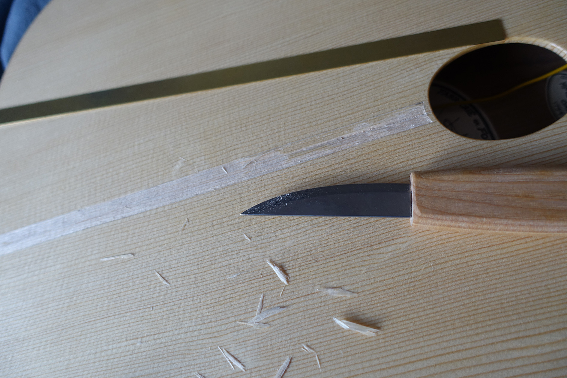 I'm very pleased with the brass tailpiece, but unfortunately the strings can't physically lay flat to then go over a bridge. It's a bugger as I like my design and it took a lot of careful cutting and filing. It's possible I can salvage it by screwing on some bass saddles which will hold the strings. Failing that I have to get a rather boring regular bass tailpiece and try to spruce it up with a wood insert. I'm not sure I'm capable of making a rosette or doing the binding so may have to leave it bare. I've actually inset a piece of brass at the top of the soundhole and it looks good. Might quit while I'm ahead.