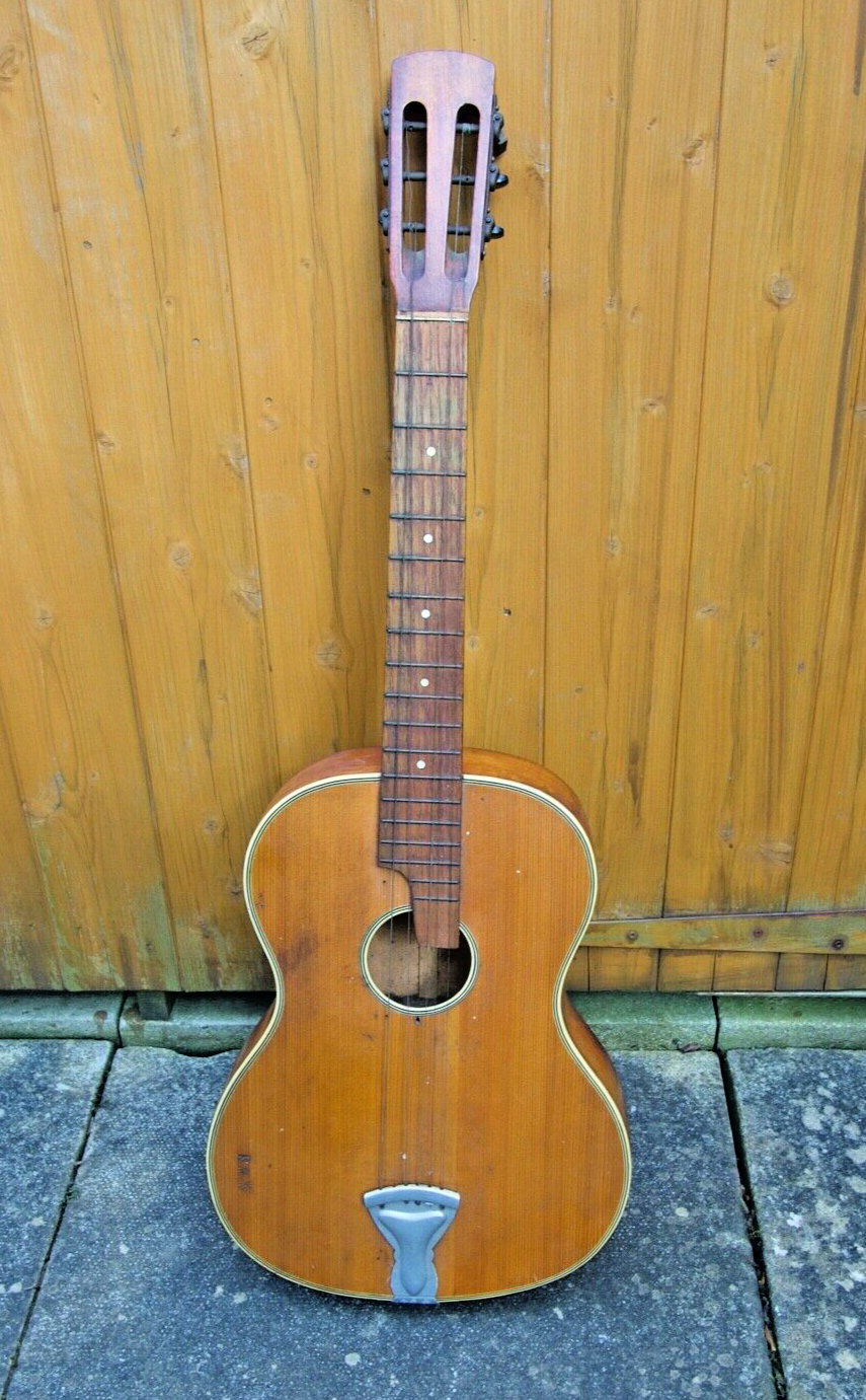Well here is a post on the probably less desirable (smaller) non cutaway vintage gypsy guitars. They have been made by the same luthiers and in the same way as the vintage Selmac type guitars: lightweight, ladder braced, floating bridge, laminated (often braceless and arched) back and sides and should also be strung exclusively with light gauge (gypsy guitar) strings. Maybe they deserve a little more recognition and if you own or have played some of these guitars then with your help this post could help people looking for a vintage gypsy guitar to know a little bit more about these models. There are quite a lot of these guitars out there, and only vintage ones (please correct me if i am wrong). The contemporary luthiers only build the big cutaway Selmac gypsy guitars if i am right. A lot of these vintage smaller sized gypsy guitars will probably end up being collected by our garbage men and women.