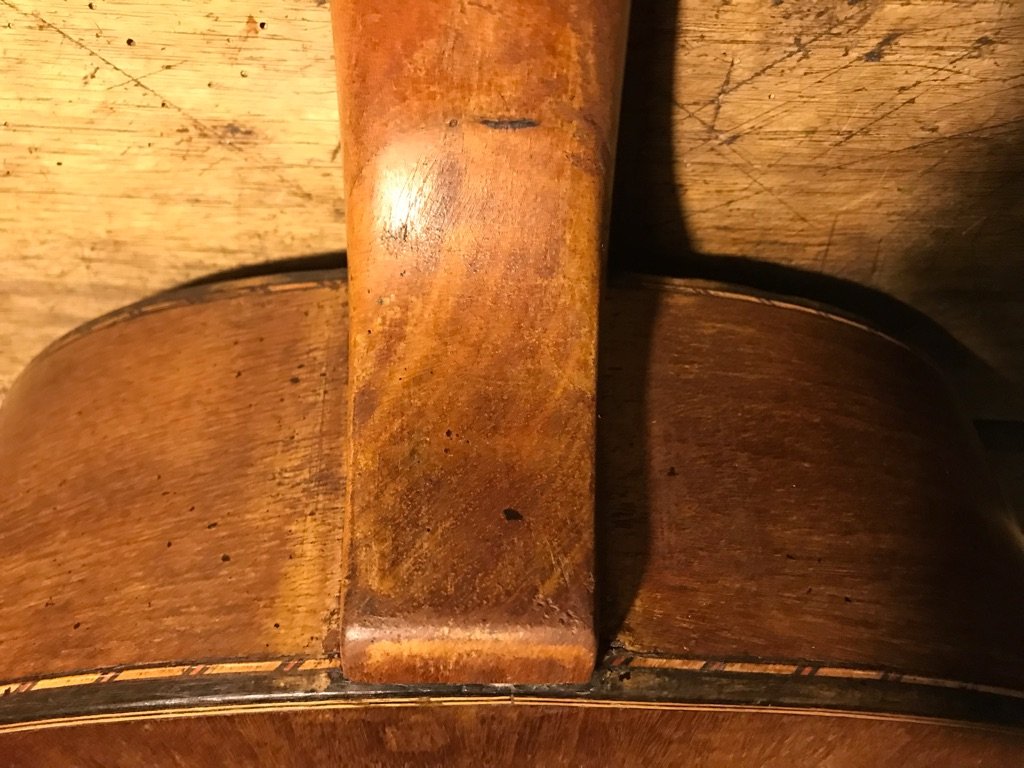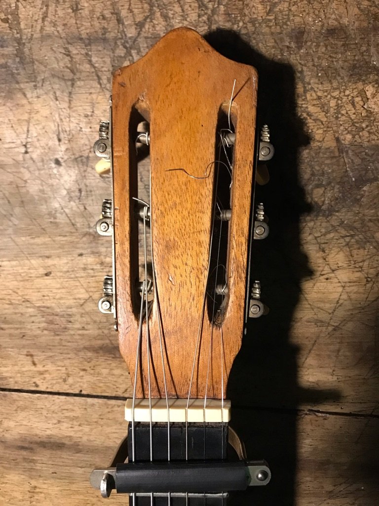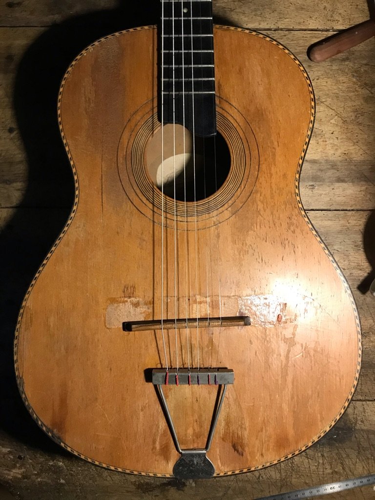 Here is an early Castelluccia, the guitar had a fixed bridge on it when I got it which was not original to the guitar. Luckily it was easy to remove it. the guitar needs quite some restauration, I have just cleaned it and put some strings on it to get an idea how it sounds. This is loud, with very pronounced deep basses. Maybe the high action plays a role. It needs a new fretboard, neck-reset. sanding the top to get the glue off where someone had put that misplaced bridge. The top still has its original bombé, the back is arched like all the other gypsy guitars. Very nice bindings. I am not sure of the woods used on the back and sides. Maybe someone has got an idea, I'm not sure it is mahogany... . The typical Castelluccia heal.